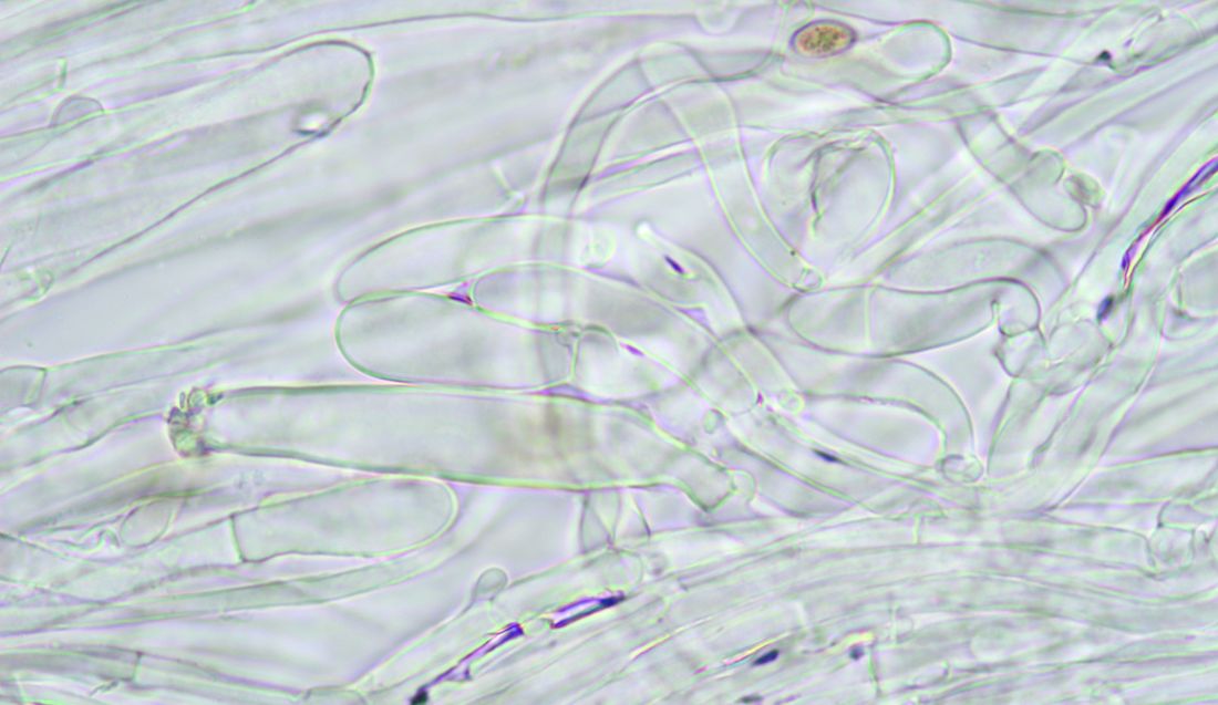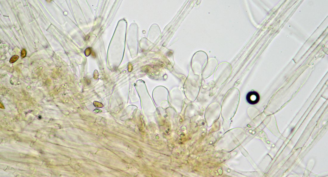 Nr. 3 ist schließlich noch ein Einzelexemplar unter Linde und Hainbuche, 4 cm Hutdurchmesser, Geruch spermatisch, Stiel nur im oberen Drittel bereift, Kaulos dort aber sehr zahlreich. Dachte makroskopisch wiederum erst an fuscidula wegen des gestreifen Huts, aber die Sporen sind in den allermeisten Fällen über 10 µm lang: 9,5-11,5 (5)5,3-5,7(6) µm, was da ein bisschen groß wäre. Dafür sind die Zystiden breiter als bei der vorherigen Art. Vielleicht lässt sich was dazu sagen, Einzelexemplar sind sowieso immer so ne Sache.