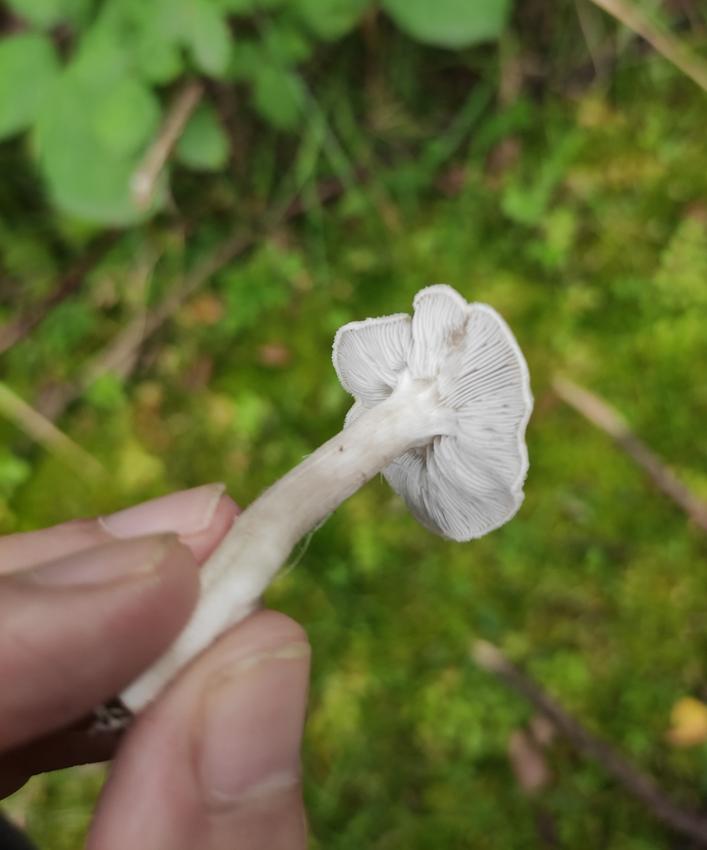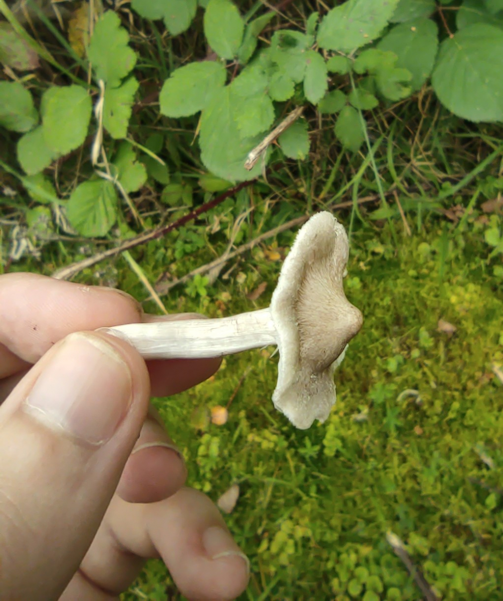 2. Bei der Birke stand dieser Ritterling, der sich als Inocybe tarnt. Er roch nach Mehl. Im Kopf hatte ich demnach T. inocybeoides, der aber scheinbar mittlerweile zu Tricholoma scalpturatum gestellt wird? Also einfach ein gilbender Erdritterling? Ich habe ihn mitgenommen und schaue morgen mal ob er gilbt.