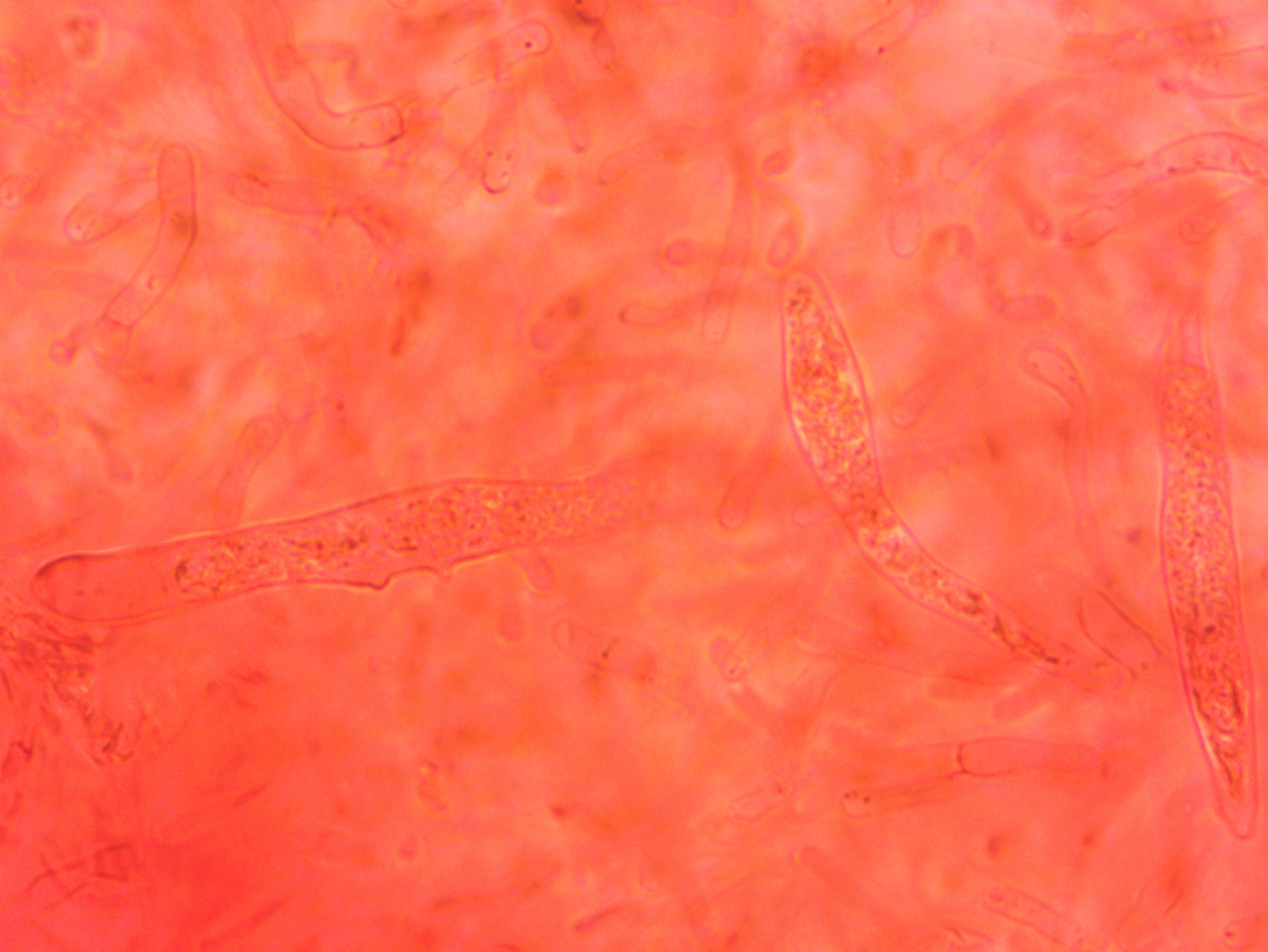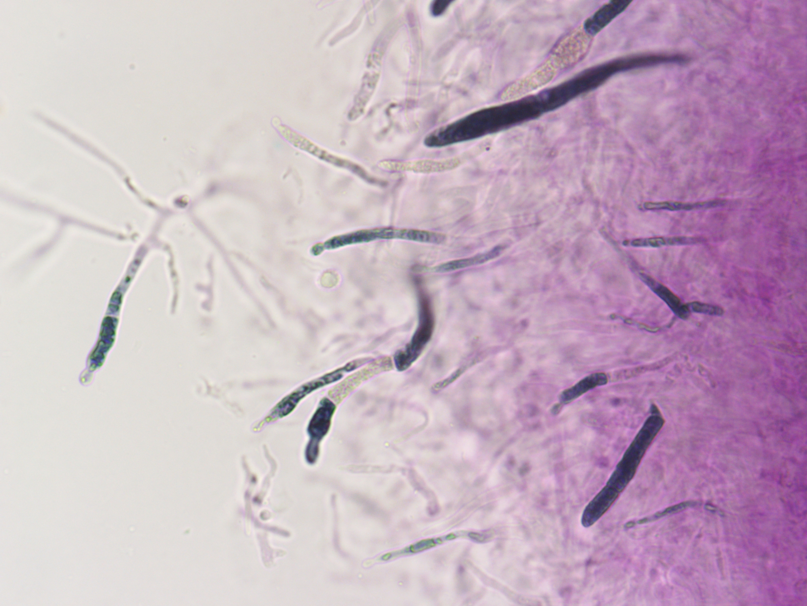Die ziemlich variablen Dermatozystiden sind teilweise am Ende zugespitzt und divertikulieren.