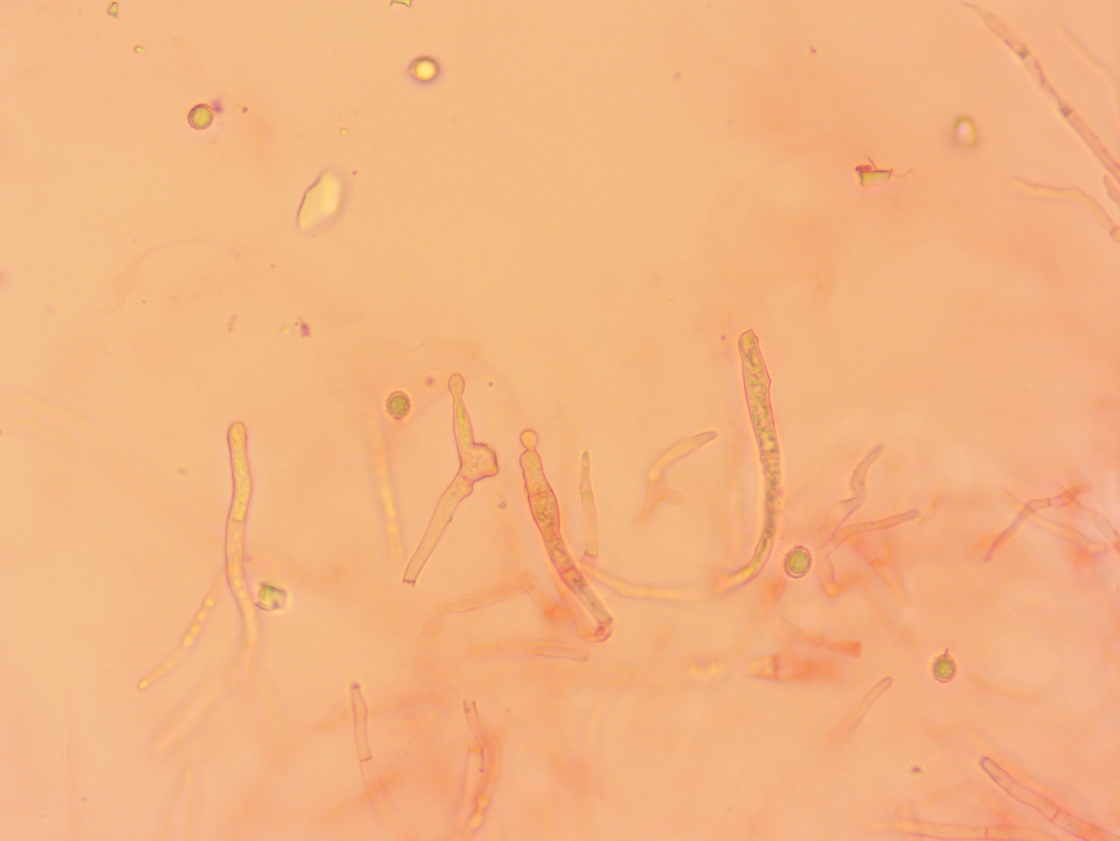 Jedoch soll mit Guajak R.atrorubens intensiv reagieren (->kein zuverlässiges Merkmal), zudem dürfte diese Art nicht derart groß und stattlich werden. Also muss wieder das Mikroskop ran.