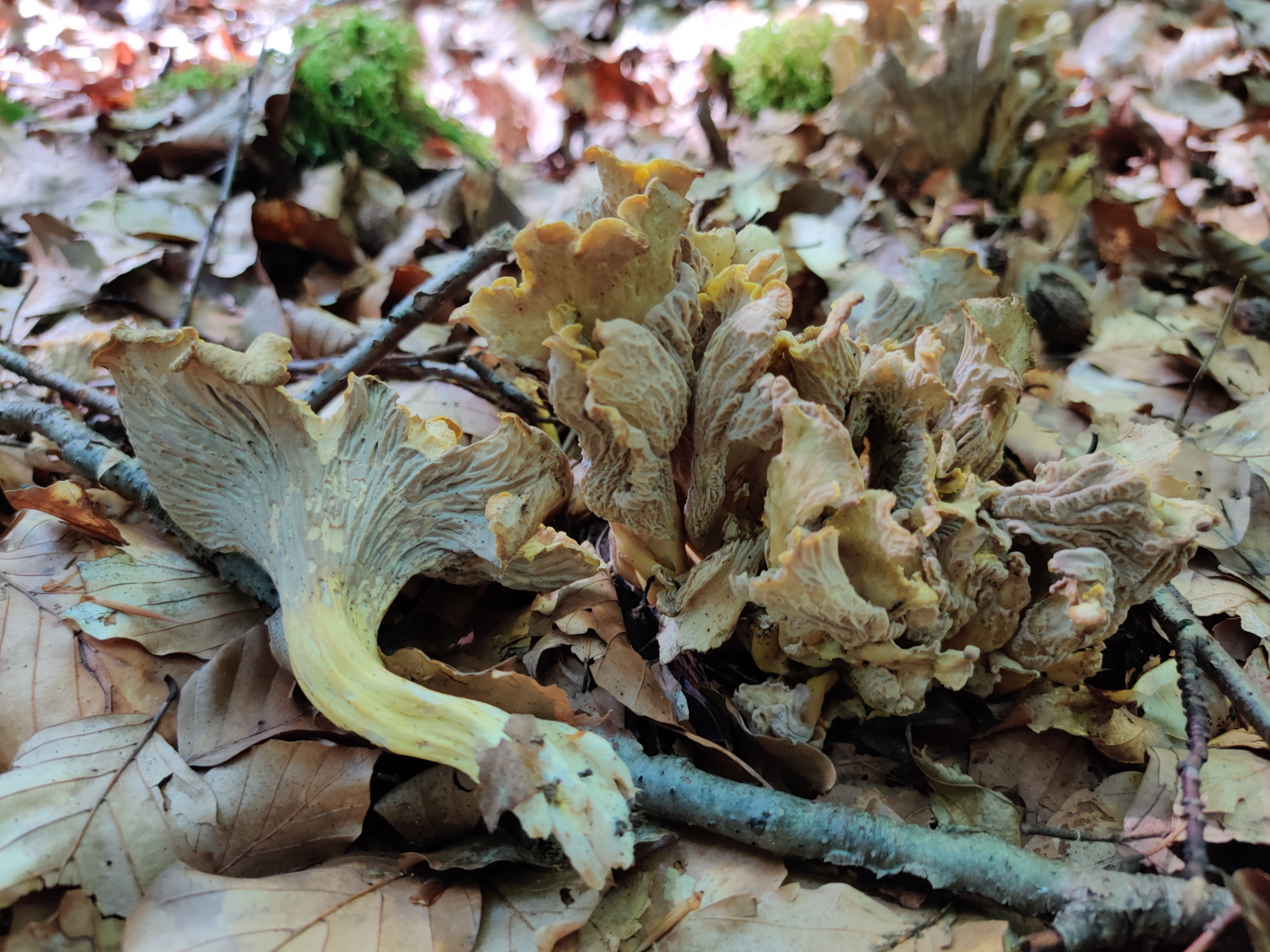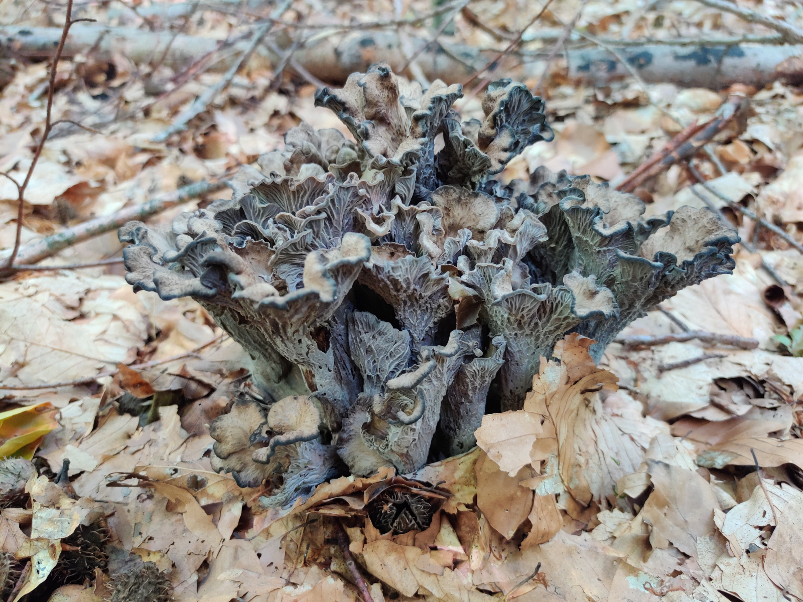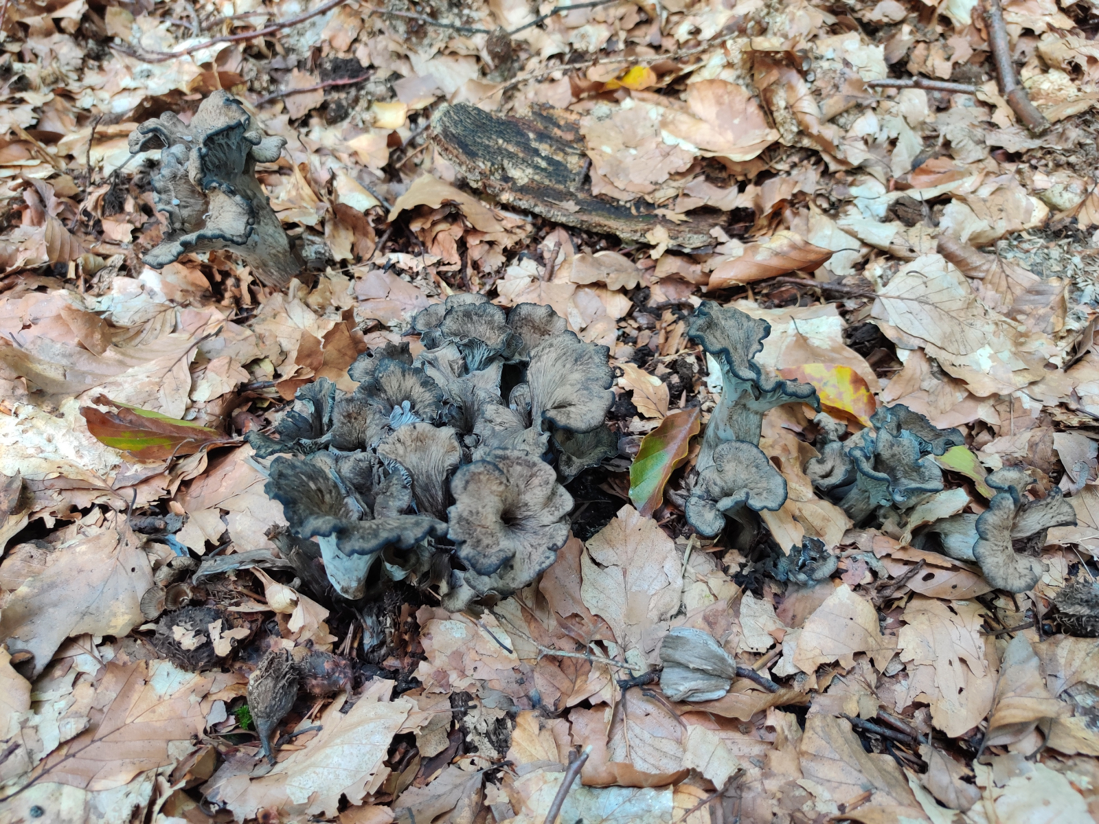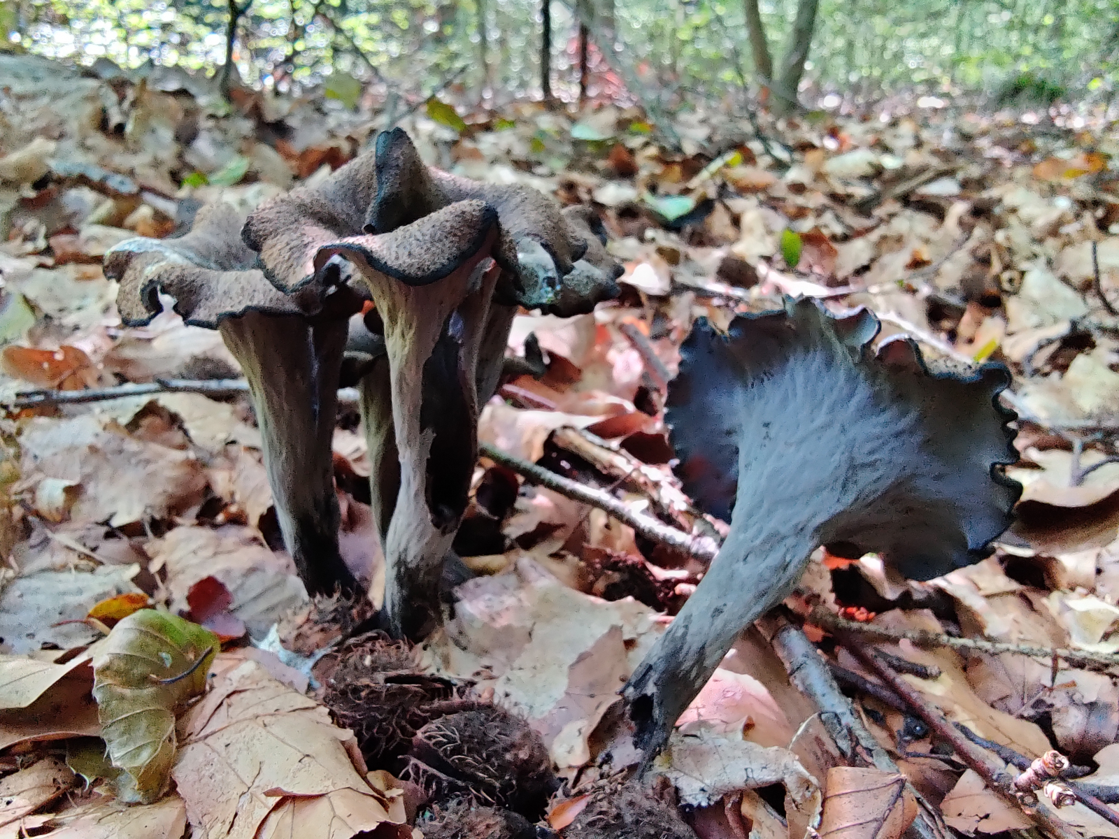 1. Überall stand der Graue Leistling (Craterellus cinereus) in großen Büscheln mit teils riesigen Fruchtkörpern. Bisher hatte ich die Art erst einmal im Pfälzer Wald finden können. Hier war es die größte Ansammlung einer Art, die ich jemals zu Gesicht bekam. Was in mein Körbchen gelangte war ein winziger Bruchteil von dem, was im Wald stand.