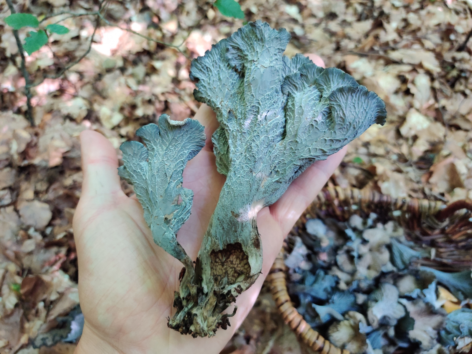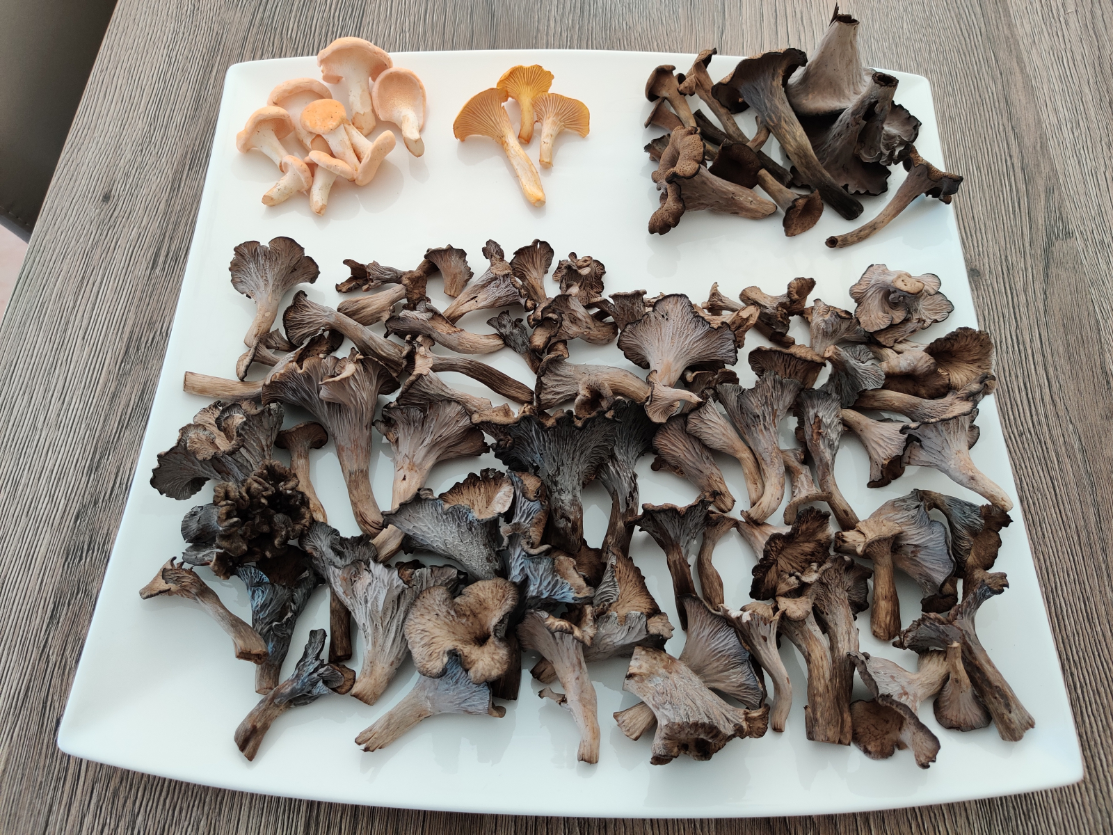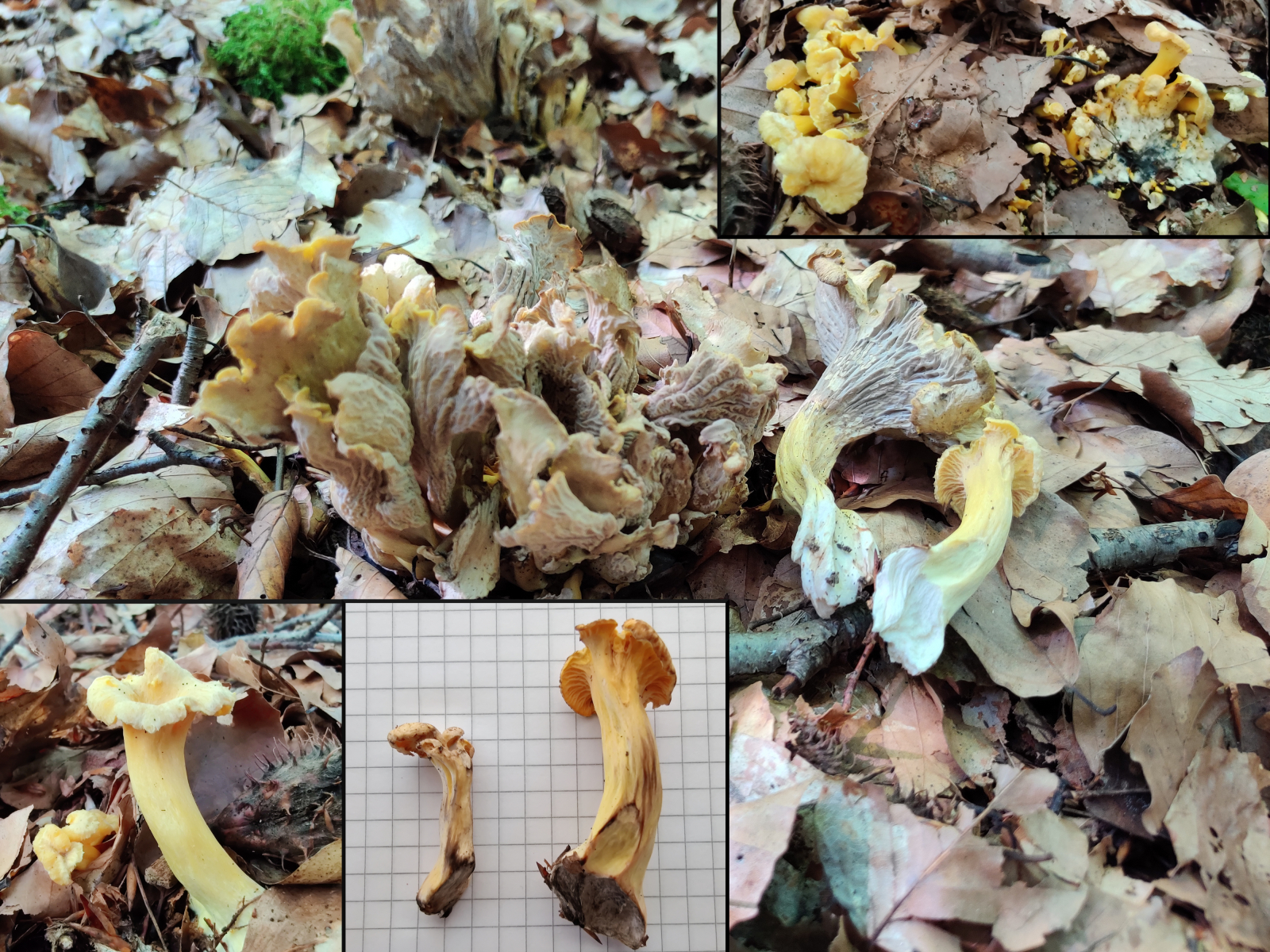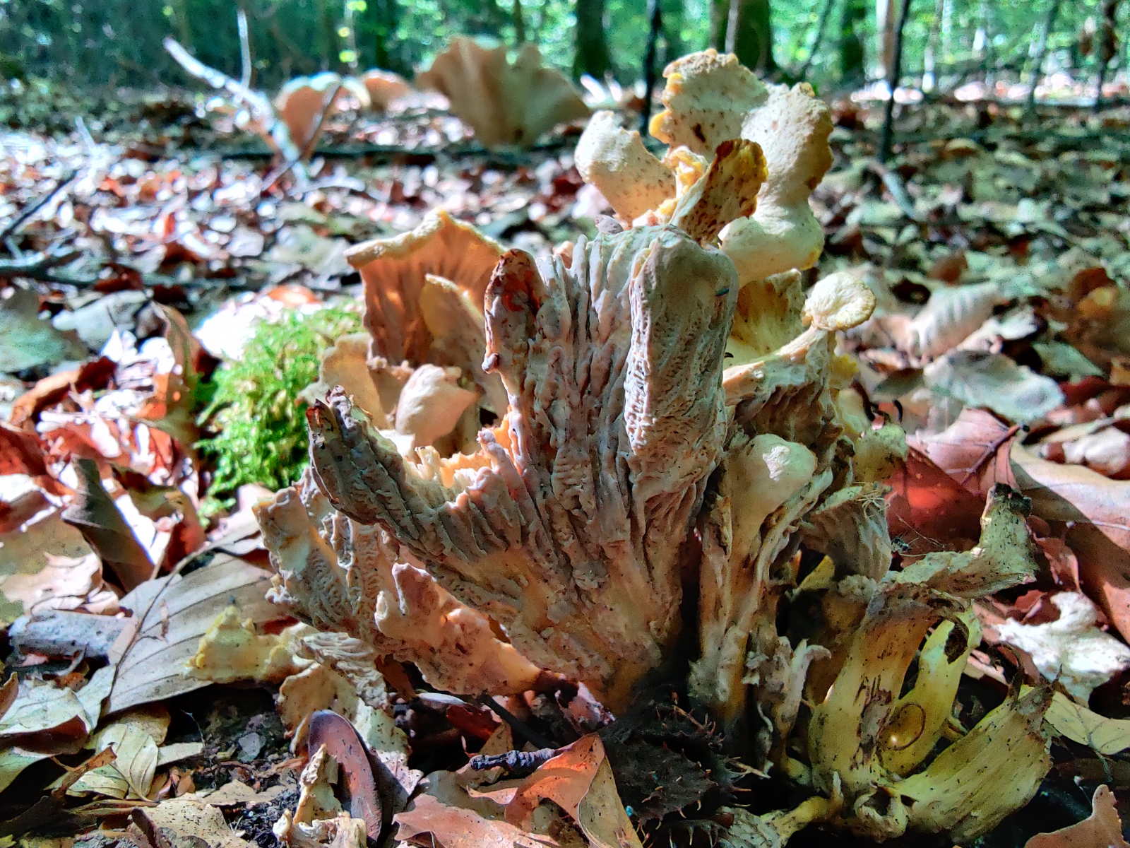 1. Überall stand der Graue Leistling (Craterellus cinereus) in großen Büscheln mit teils riesigen Fruchtkörpern. Bisher hatte ich die Art erst einmal im Pfälzer Wald finden können. Hier war es die größte Ansammlung einer Art, die ich jemals zu Gesicht bekam. Was in mein Körbchen gelangte war ein winziger Bruchteil von dem, was im Wald stand.