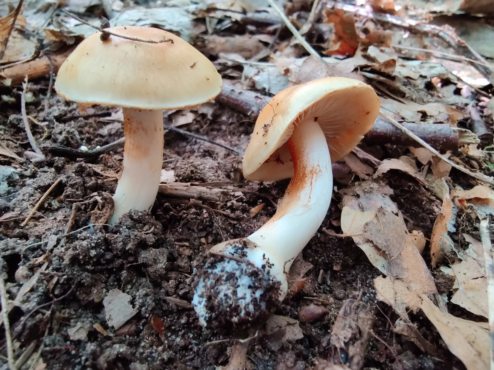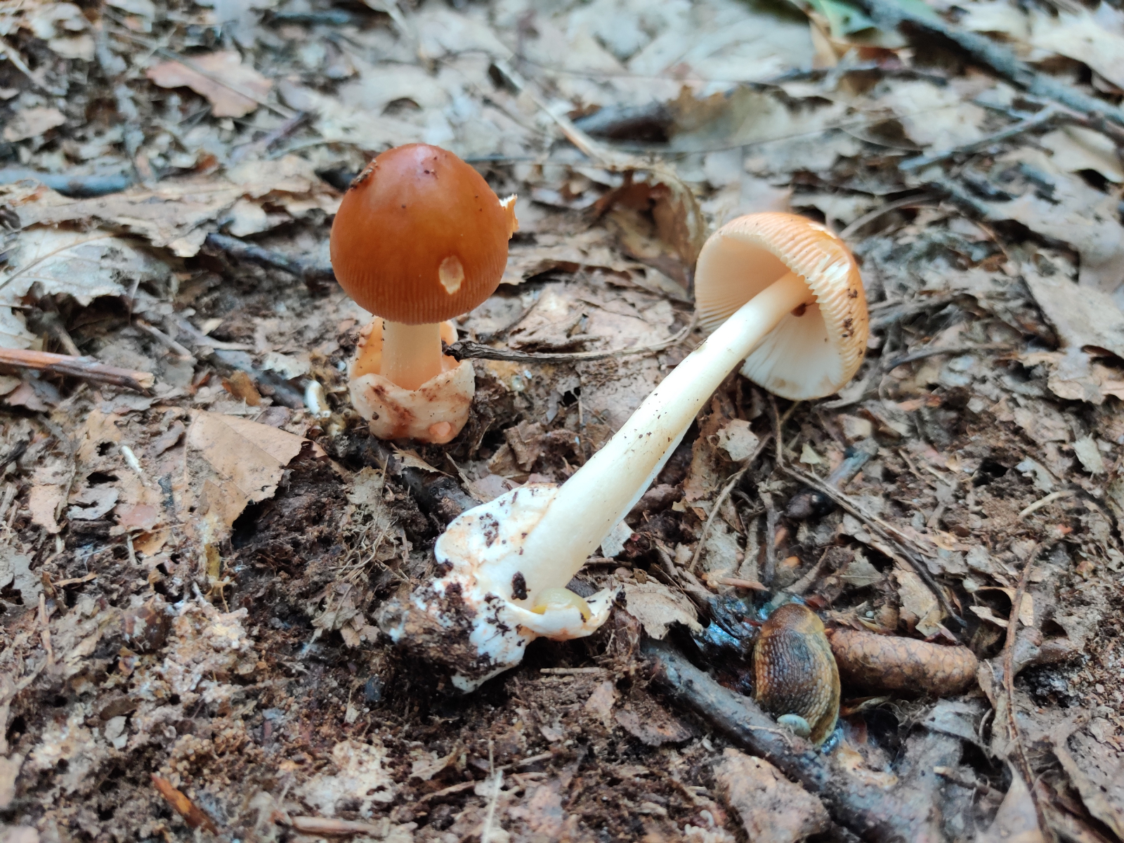 Los ging es mit drei kleinen Pfifferlinge in einer Roteichen-Pflanzung, über die ich mich freute. Im selben Waldstück gab es noch vereinzelt Knollenblätterpilze, einige Rotbraune Scheidenstreiflinge (Amanita fulva), einen jungen, aber bereits komplett madigen Steinpilz und viele Flaschenboviste.