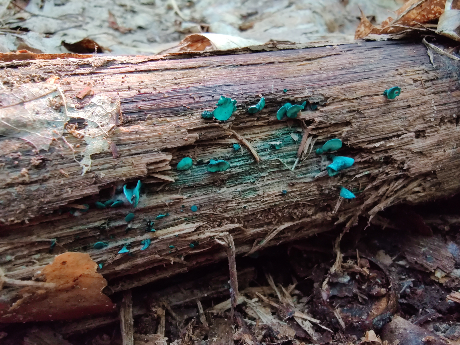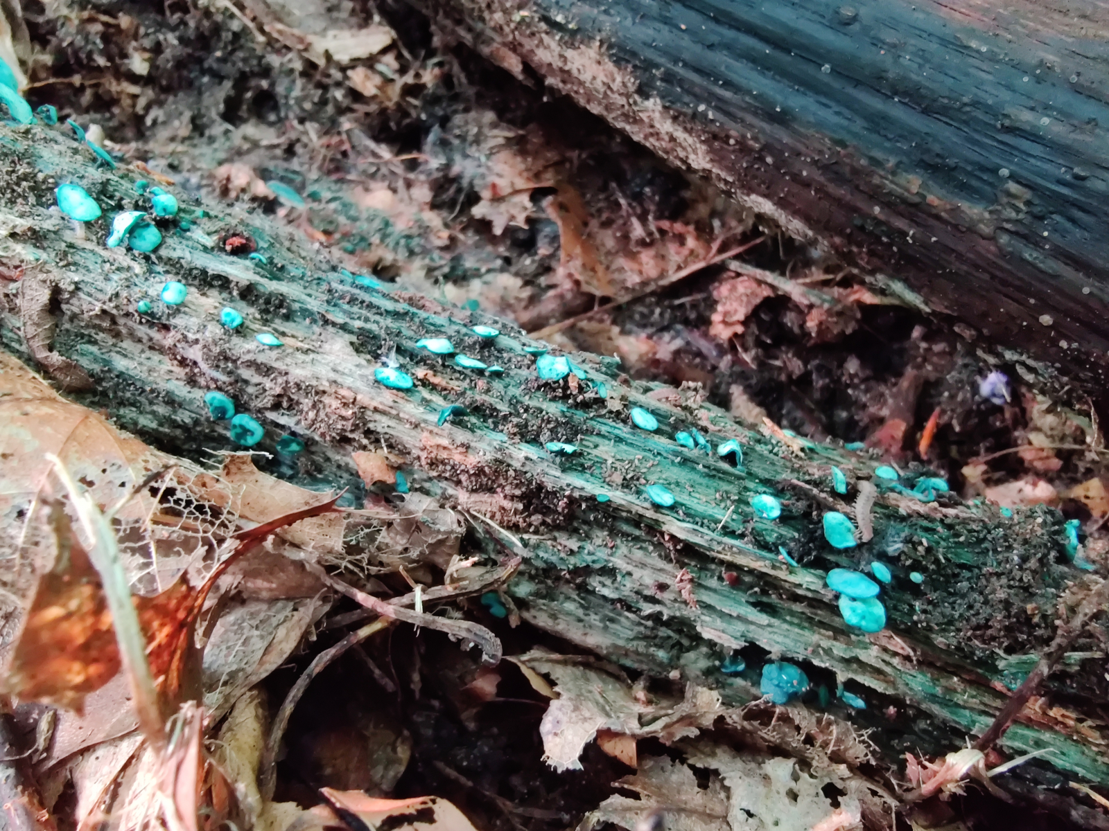 Weiter unzählige, leider vertrocknete Babys an Trompetenpfifferlinge, häufig eine kleine gelbe Cortinarie, die ich mir nicht näher anschaute und zum ersten mal für mich einen Grünspanbecherling.