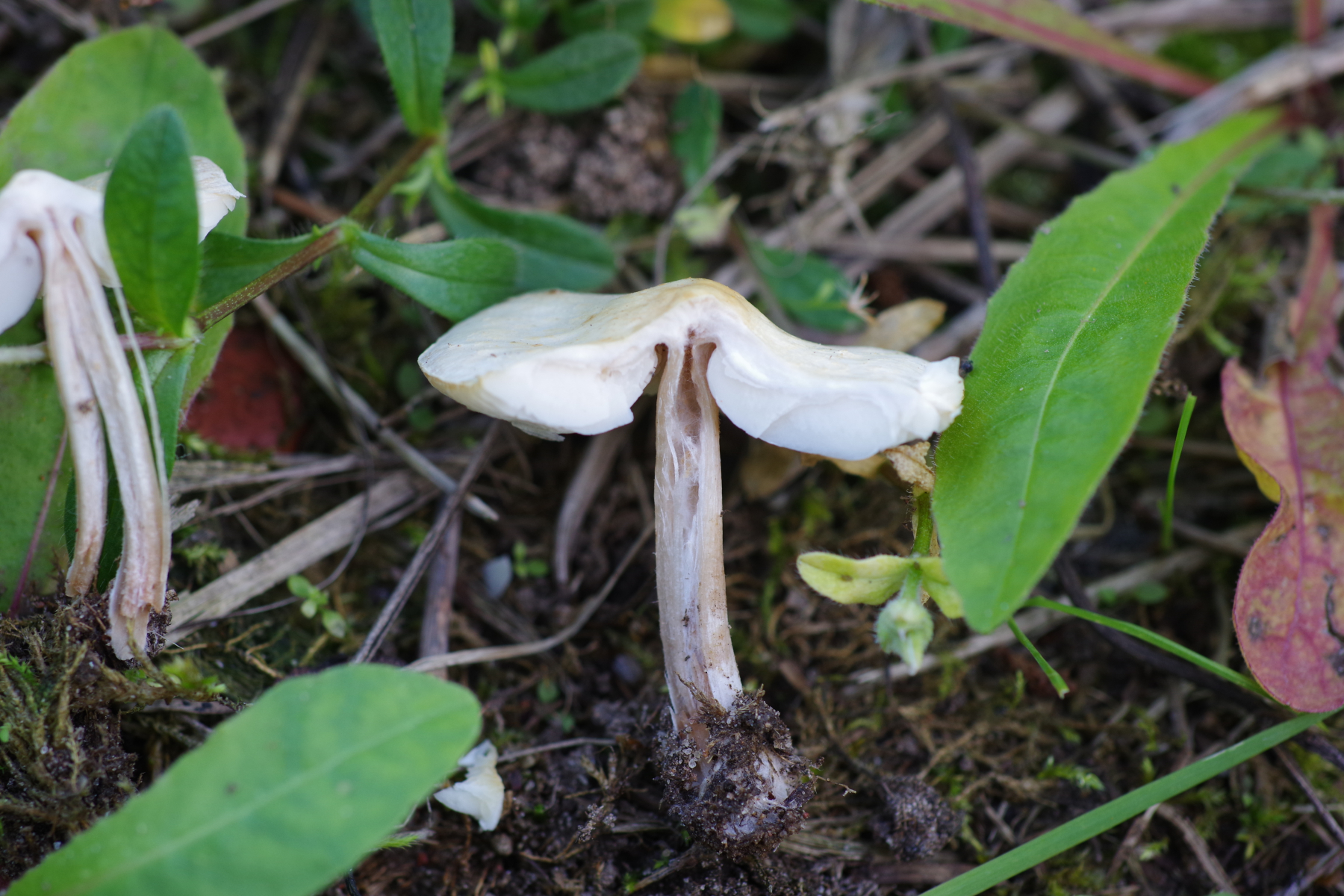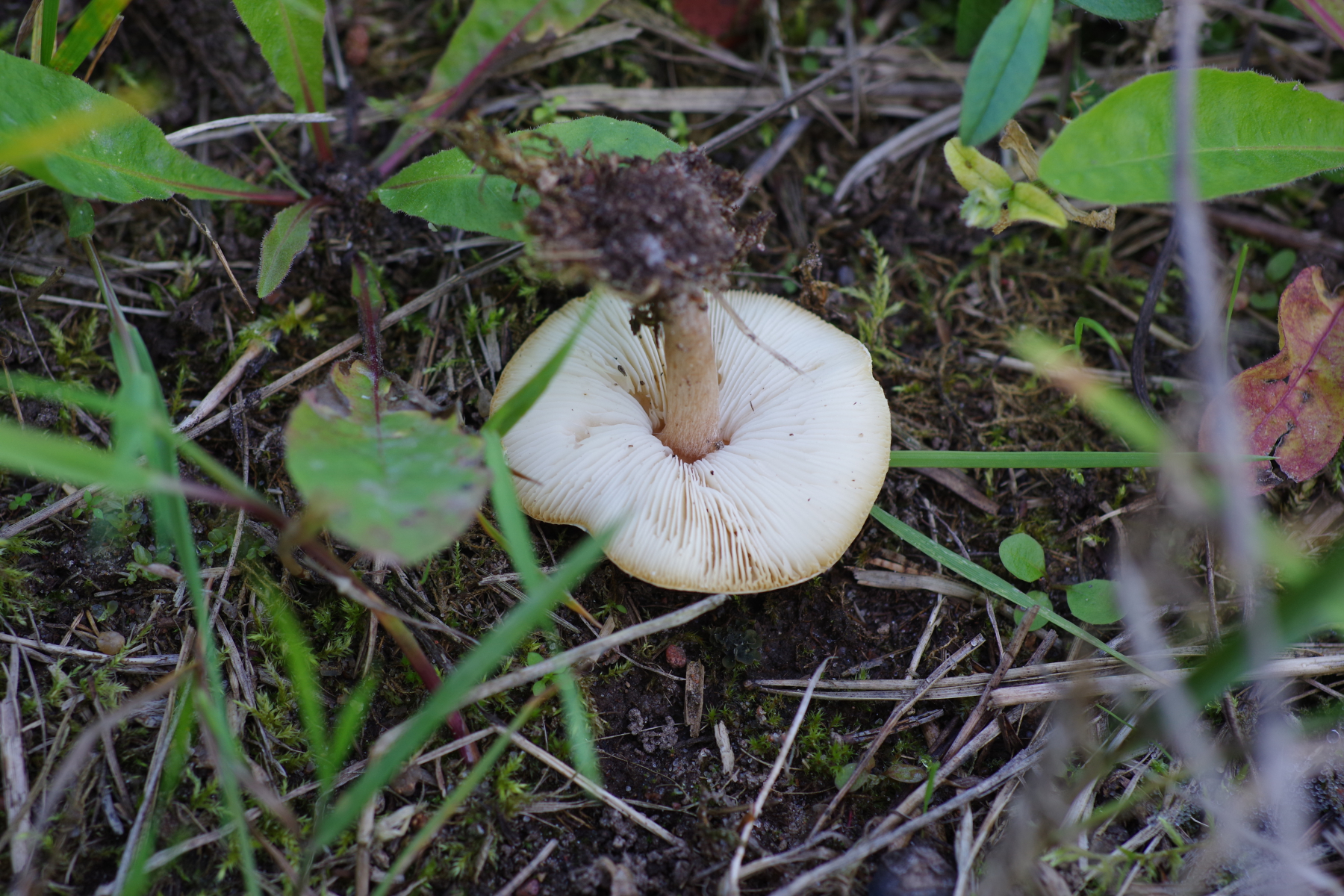 • Hallo allerseits, diesen Lamellenpilz habe ich heute auf magerem Boden am Waldrand gefunden. Da könnten im Boden schon Wurzeln oder Kienzapfen sein, aber eigentlich hatte ich den Eindruck, dass der aus dem Boden kommt. Das würde dann ja Pluteus ausschließen. Und was anderes fällt mir dazu nicht ein. Leider ein Einzelstück.
