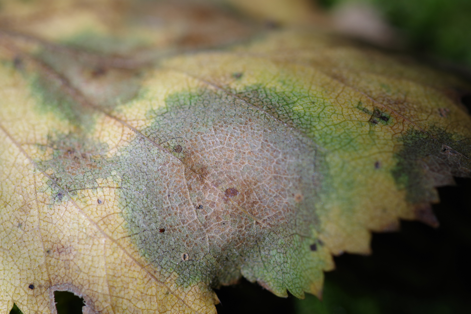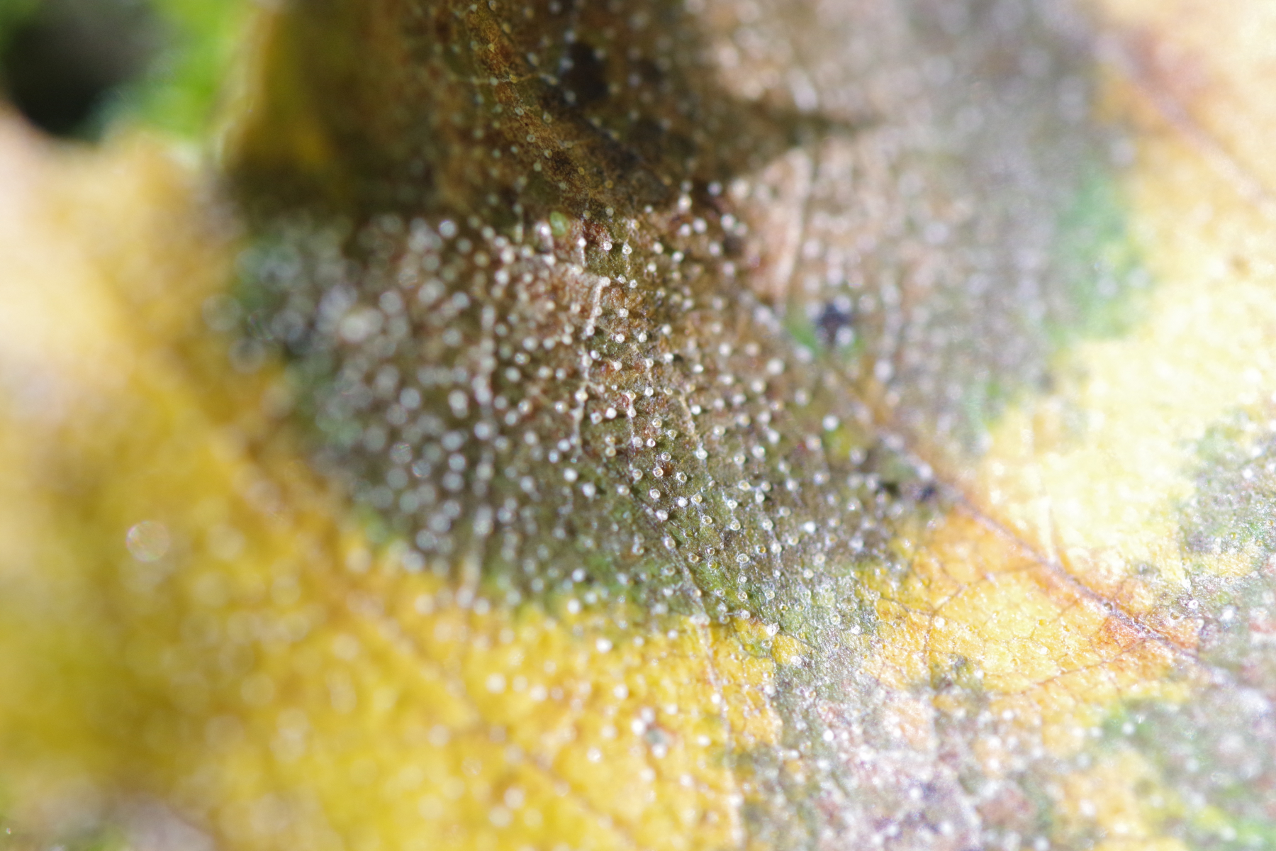 diese weißen Punkte sind in der Tat immer auf Birkenblättern zu finden (bei Herbstfärbung dann besonders gut erkennbar). Phyllactinia betulae hat relativ große Fruchtkörper, die man deutlich sehen sollte. Ich denke, daß das einfach nur Herbst ist, evtl. dann mit irgendeiner unscheinbaren sekundären Infektion durch was auch immer.
