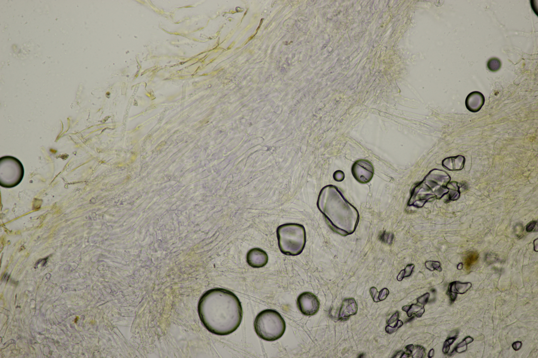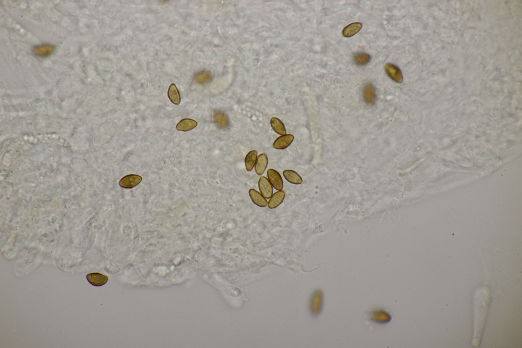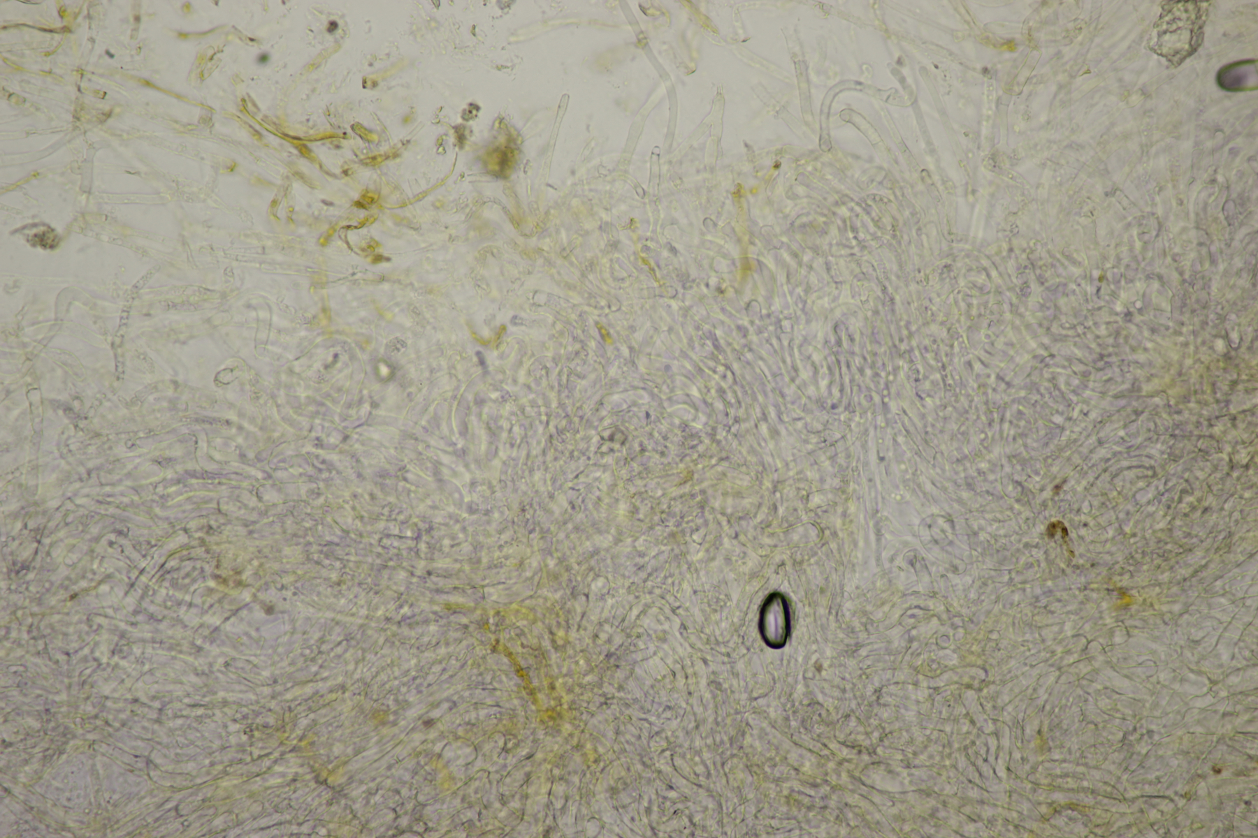bei der gestrigen Exkursion an der Panzertalsperre haben wir auf einem moosigen Rasenstreifen am Straßenrand unter Carpinus und Betula einen Zwergenpopo ein Phlegmacium gefunden. Leider nur ein Einzelexemplar, aber was will man machen...Geruch war kein besonderer festzustellen, die Sporen messen 9-10.8 µm x 4.8-5.9 µm, Q=1.8-2.1 und sind feinwarzig. Mit KOH färbt das Fleisch gelb, die Huthaut orange-gelb. Wenn ich mit der Funga Nordica schlüssel, lande ich bei Phlegmacium im Telschlüssel G und dort dann bei C. balteatocumatilis. Jetzt habe ich von Cortinarien aber ja leider gar keine Ahnung. Was sagen die Experten?
