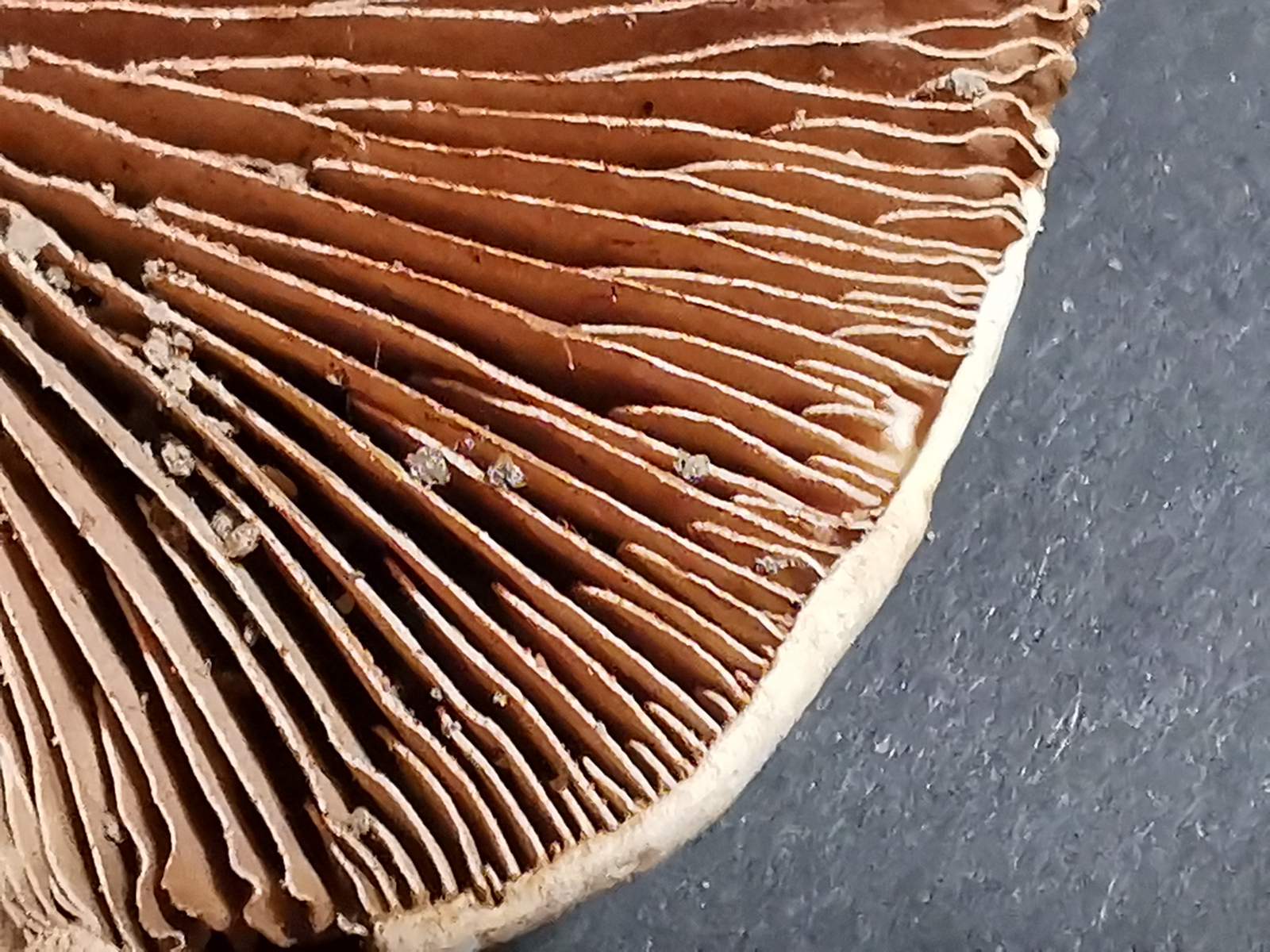 Der Pilz wuchs massenhaft unter Buchen, Hutdurchmesser bis ca. 6cm, strohgelb, zum Rand ausbleichend. Nicht hygrophan(?). Trama weiß, dick. Stiel deutlich heller, fast weiß. Keine sichtbaren Velumreste. Lamellen jung hellbraun, später dunkelbraun aufgrund der dunkelbraunen Sporen, angewachsen(?), mit regelmäßigen Zwischenlamellen. Geruch auffallend pilzartig, an Steinpilz erinnernd.