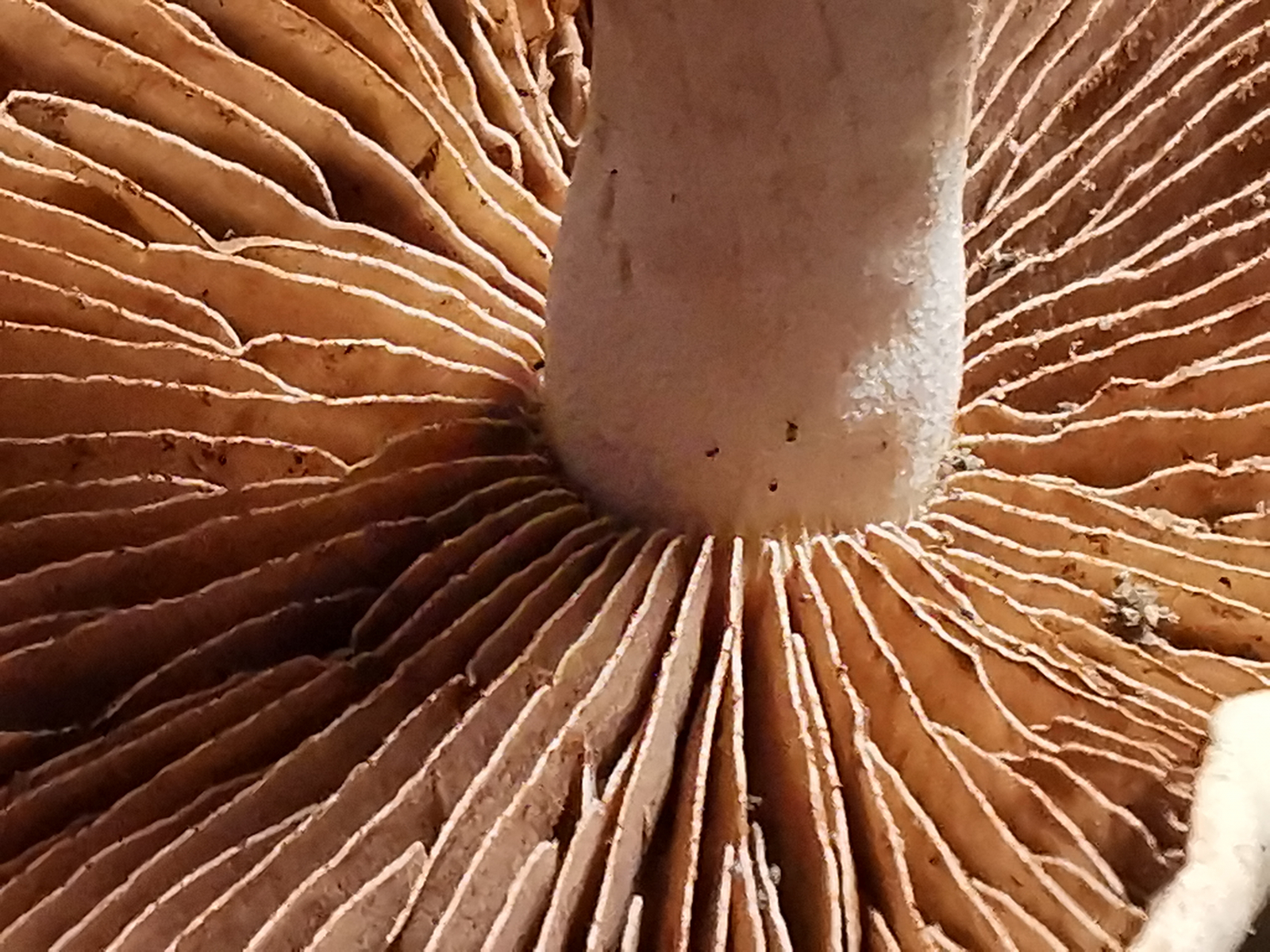 • Schleierlinge haben in jungem Stadium einen Schleier der die Lamellen verhüllt. Wenn der Hut aufschirmt, reißt der Schleier auf. Es bleibt aber immer ein Rest Schleier im oberen Bereich des Stiels hängen. Darin verfängt sich dann rostbraunes Sporenpulver, so dass ältere Exemplare immer eine Art rostbraune Ringzone am Stiel haben. Das ist das wichtigste und eigentlich auch leicht erkenntliche Merkmal der Cortinarien.