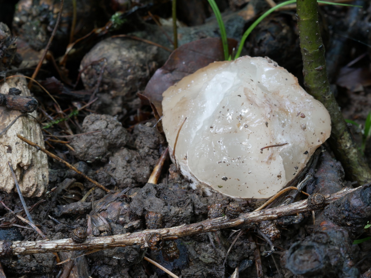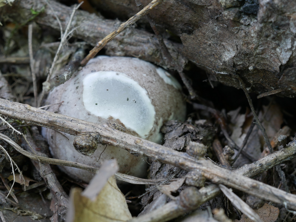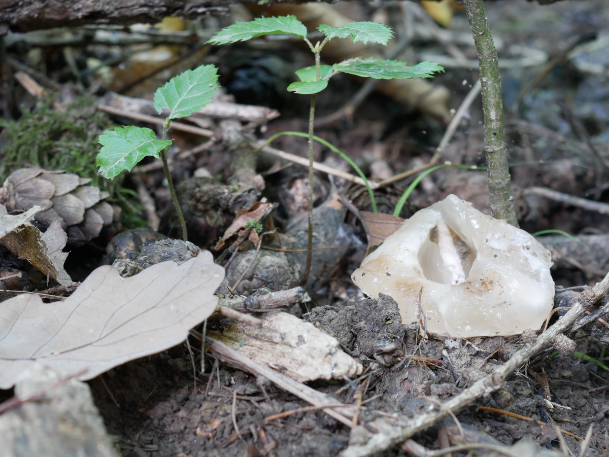 Jedenfalls ist da etwas schief gegangen, die gesamte äußere Hülle fehlt. Das kann eine Folge von Schneckenfraß sein, zum Beispiel. Der Fruchtkörper wird sich vermutlich darum auch nicht mehr entfalten können.