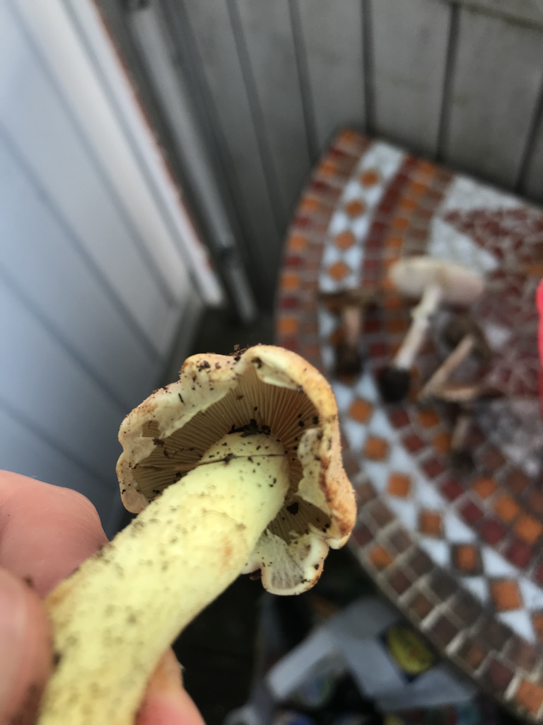Infos: Gesamter Pilz ist gelb, am Hutrand sind mögliche Schleierreste zu erkennen, Stiel ist hohl im Anschnitt, Lamellen sind gegabelt und eng stehend.