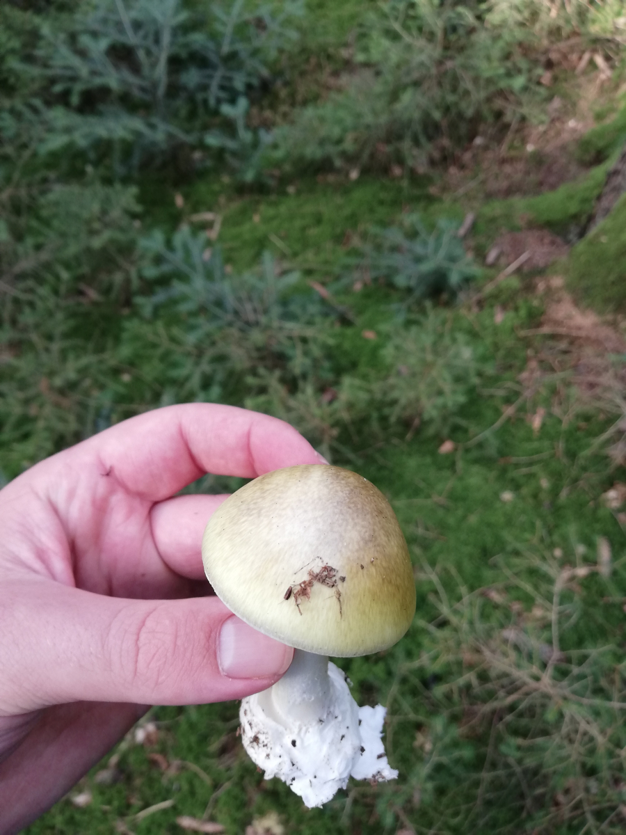 Dann gings in ein junges Fichtenwäldchen bei dem jeder Flockis oder Steinis erwartet hätte, aber an dieser einen Stelle hatte es sich Amanita Phalloides gemütlich gemacht, 5 Exemplare, unzweifelhaft an Fichte, hatte ich so auch noch nicht gesehen.