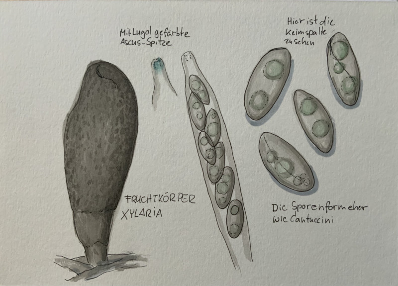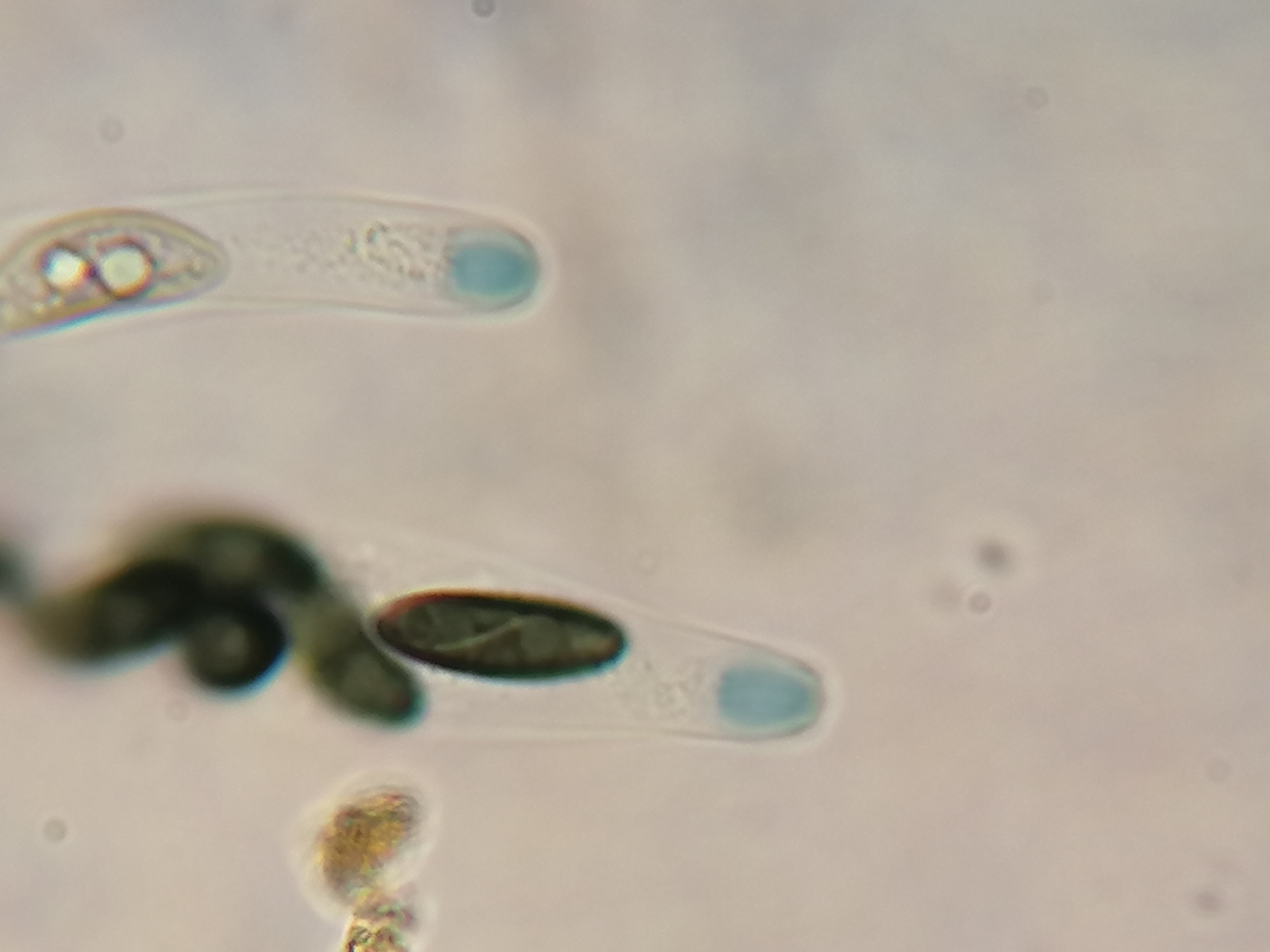 Mit Lugol färbten sich die Ascusspitzen cyan/türkis. Schön sieht man hier auch die Keimspalte (ist das der richtige Ausdruck?) an der vordersten Spore