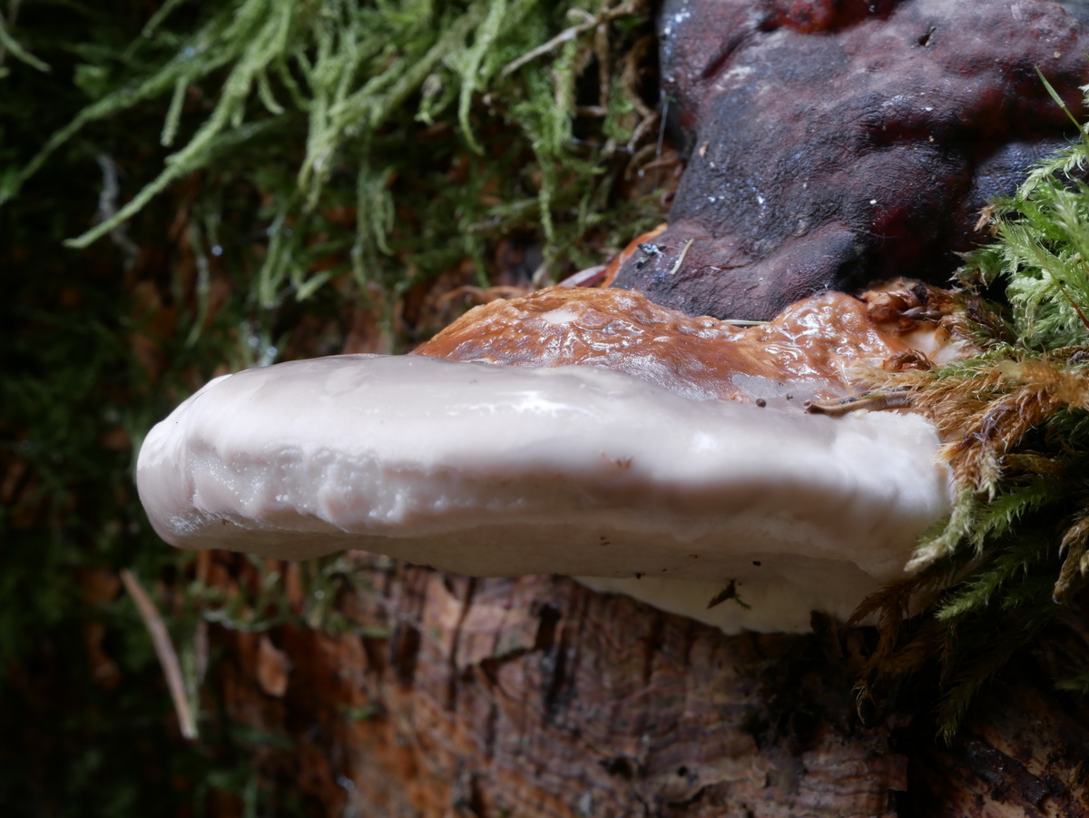 gestern beim Waldspaziergang diese beiden Porlinge gesehen und fotografiert. Leider kann ich sie nicht recht einordnen. Den rotrandigen Fichtenporling habe ich anders in meiner Vorstellung. Der Baumstumpf, an dem beide wuchsen , war - soweit ich das erkennen konnte - eine Fichte. Vielleicht kann mir jemand auf die Spur helfen.