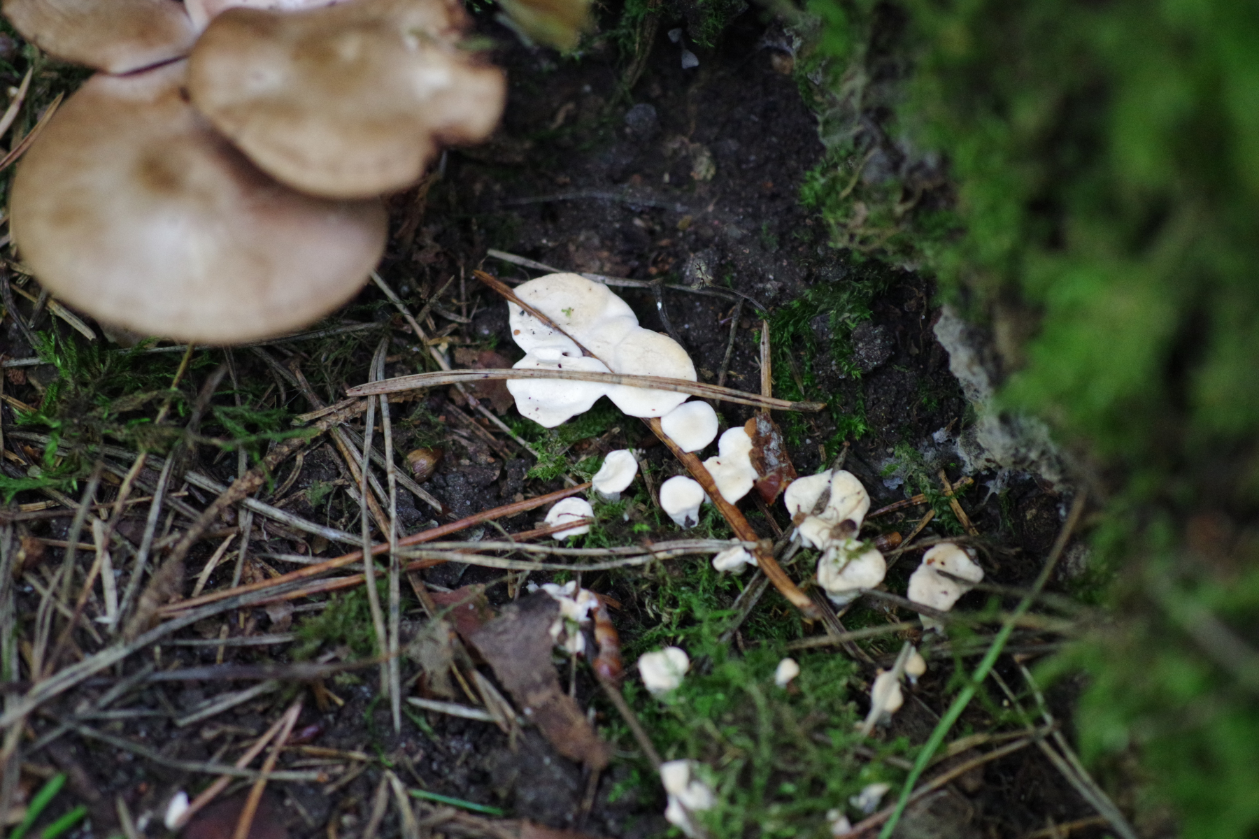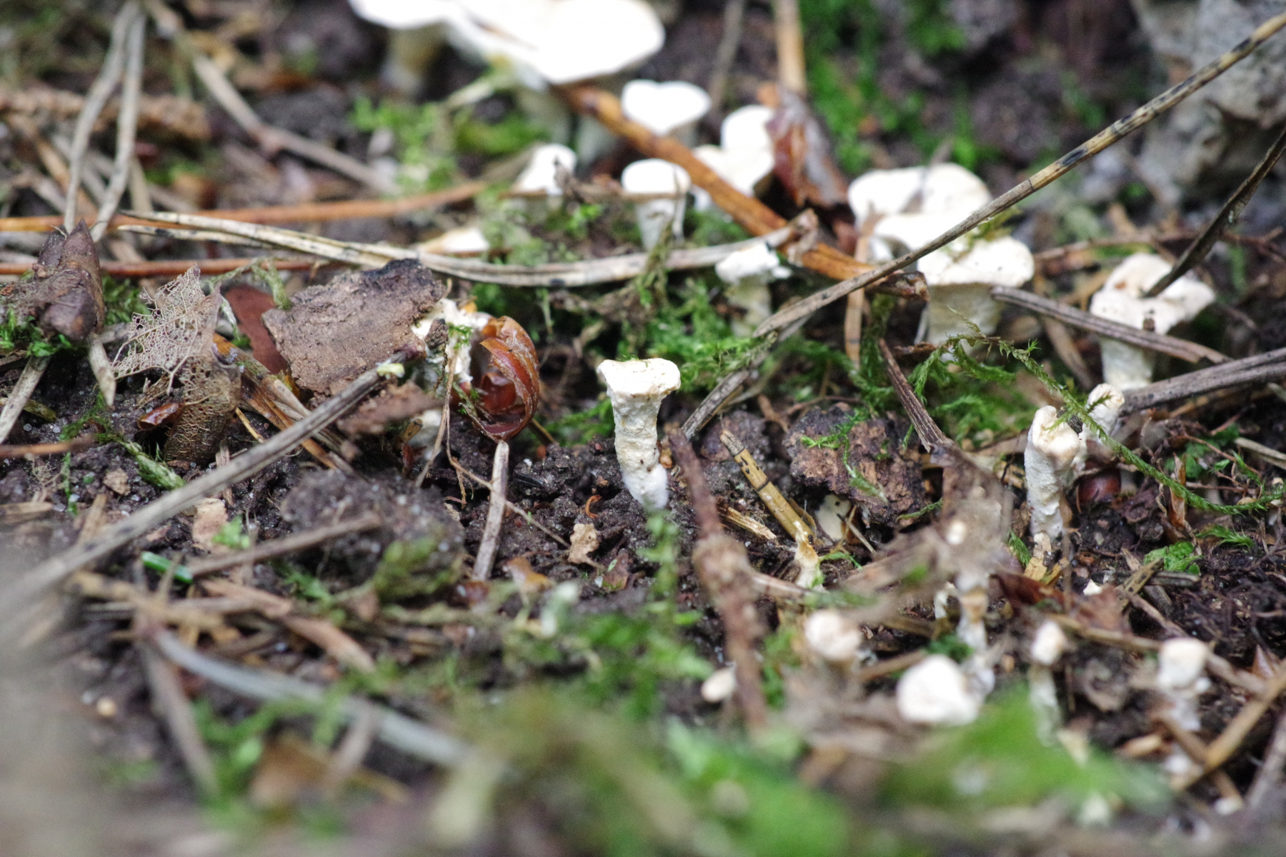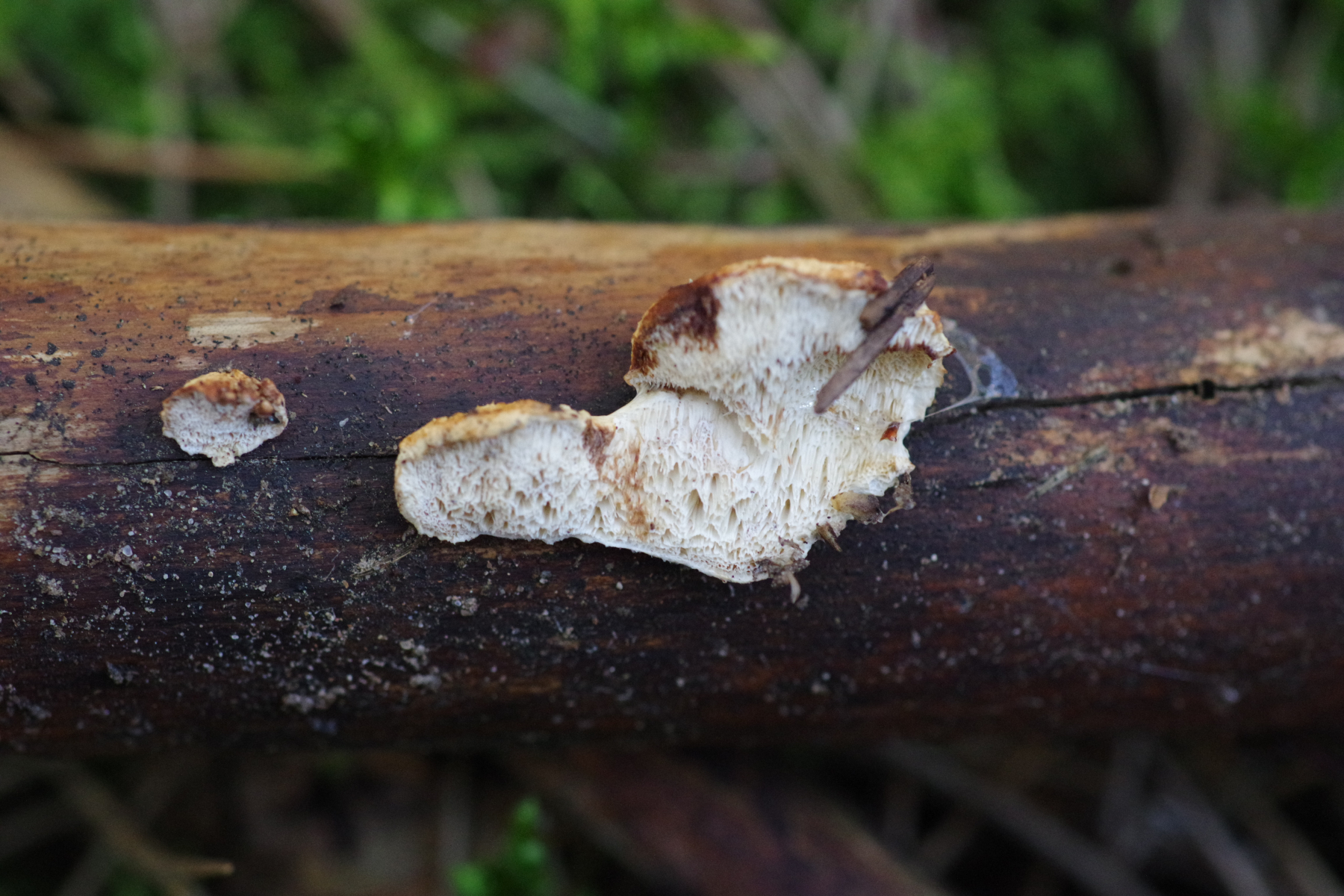 noch ein Pilz von heute, der völlig außerhalb meiner bisherigen Funde liegt. Kleine, 1-2 cm große, weiße umgekehrt trichterförmige Fruchtkörper, teils kreisförmiger Grundriß teils "wolkenförmig". Mit Zähnchen, die an Basidioradulum radula erinnern. Auf Boden am Fuß einer Zitterpappel, wo aber auch Nadeln rumliegen. Es scheint so was, zu meinem Erstaunen, tatsächlich zu geben. Sistotrema confluens sieht zunächst erst mal passend aus - wobei es bei dem Zahnzeug sja sonst immer heißt, dass da ohne Mikroskop nichts geht.