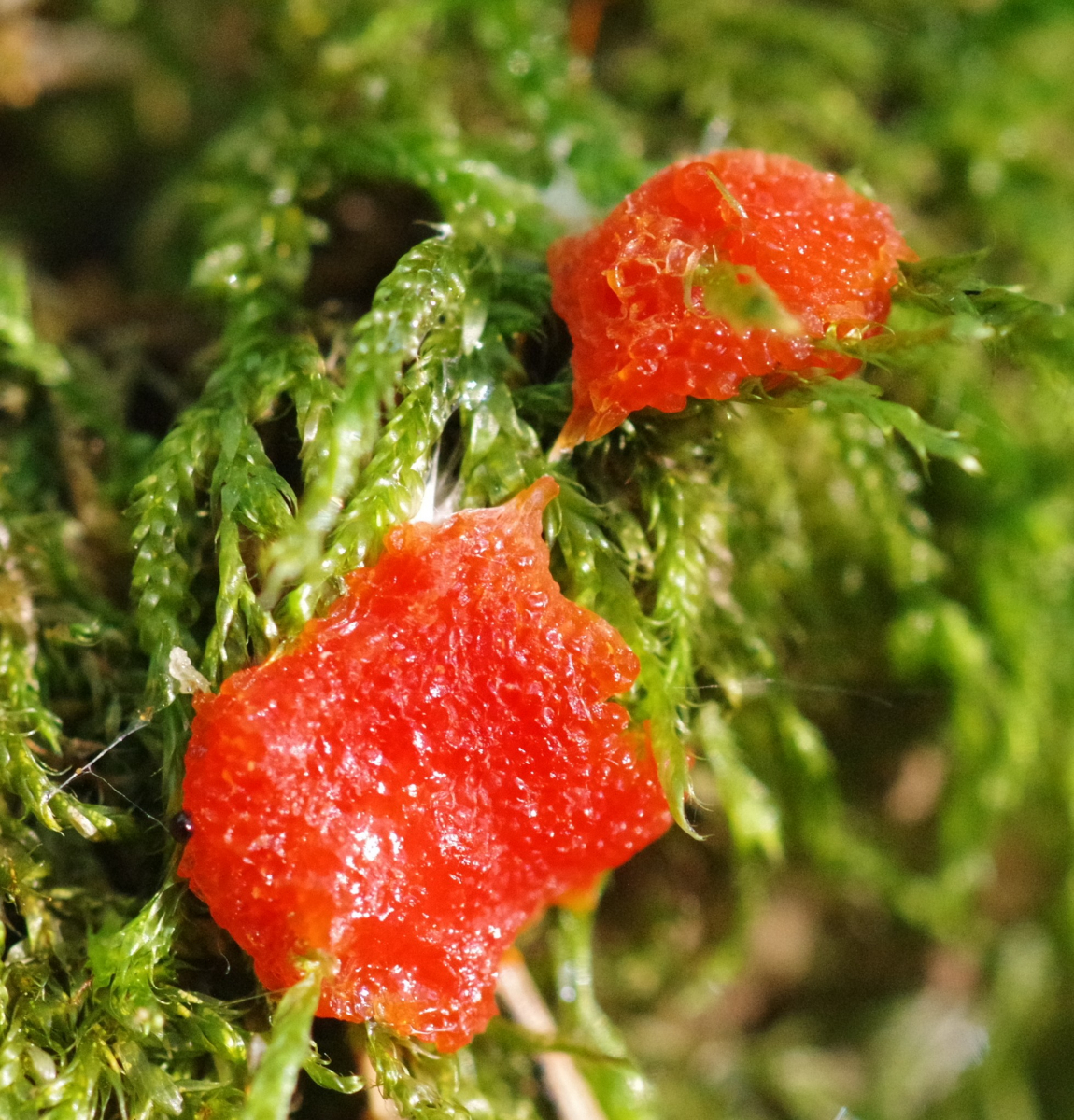 • Hallo, seit einigen Tagen, kann schon über ne Woche sein, sitzt im Moos auf einem alten Fichtenstubben dieses knallrote Etwas. Während ja Tubifera ferruginosa im Englischen auch gelegentlich Himbeerpilz heißt, möchte ich den ziemlich sicher ausschließen, denn dieser wäre in der Zeit gealtert und hätte die Farbe verändert. Zudem ist die Konsistenz recht hart und krustig. Man könnte meinen, der sei einer Haribo-Tüte entsprungen.