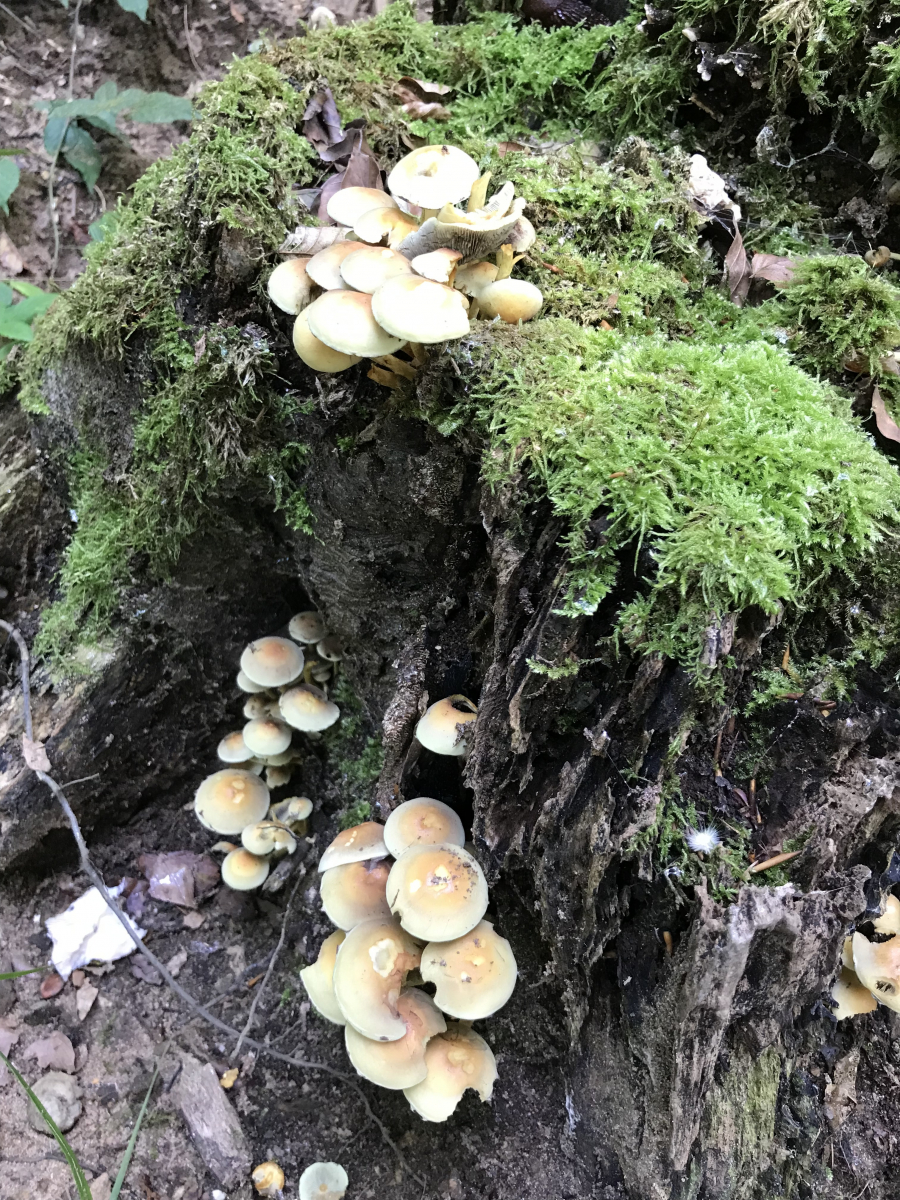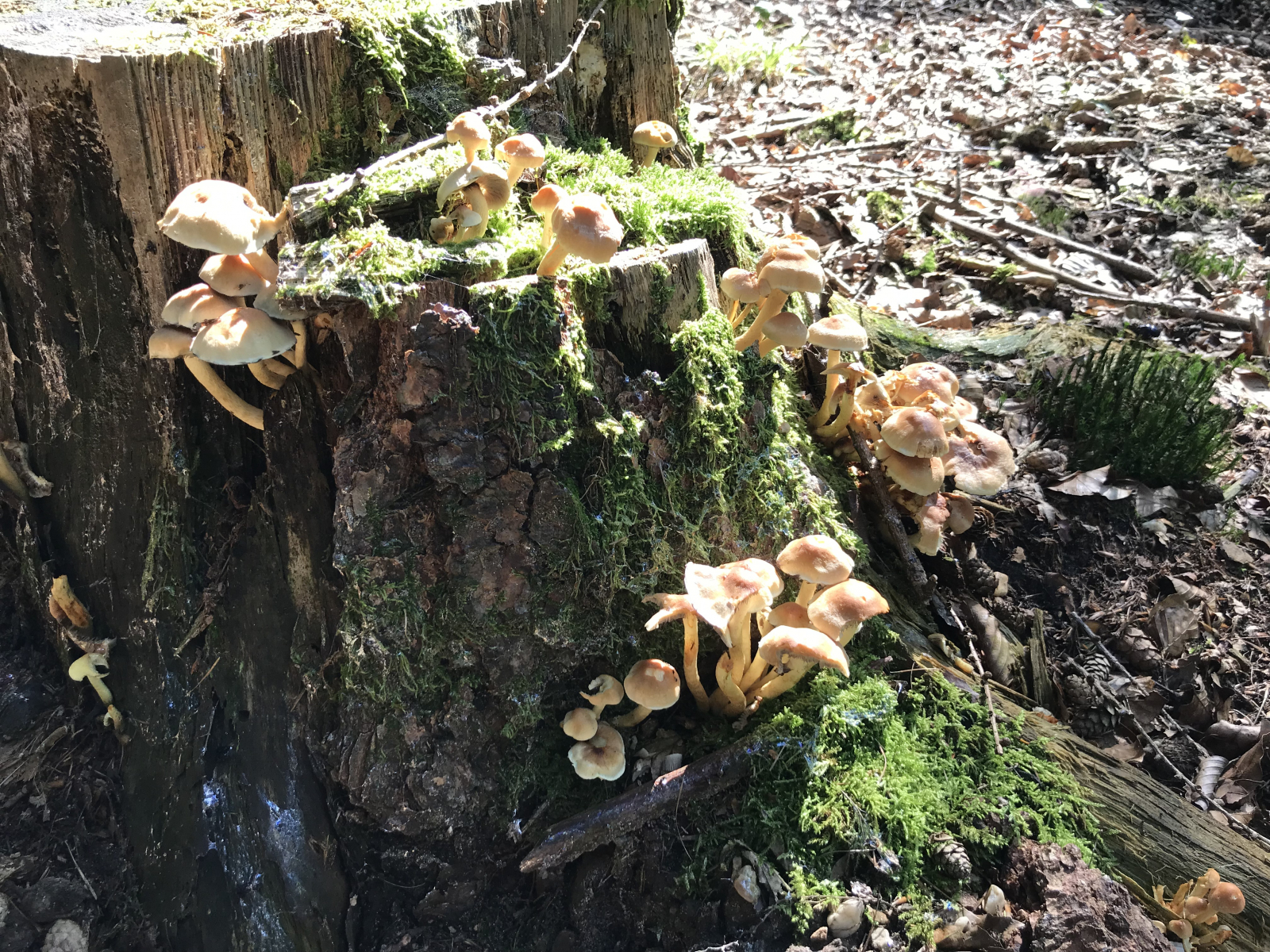 und diese Pilze an zwei Baumstümpfen nebeneinander, die ich vor Ort als Grünblättrige Schwefelköpfe (Hypholoma fasciculare) eingeschätzt habe (Schwefelköpfe wär ich mir recht sicher, ob grün oder grau nicht...)