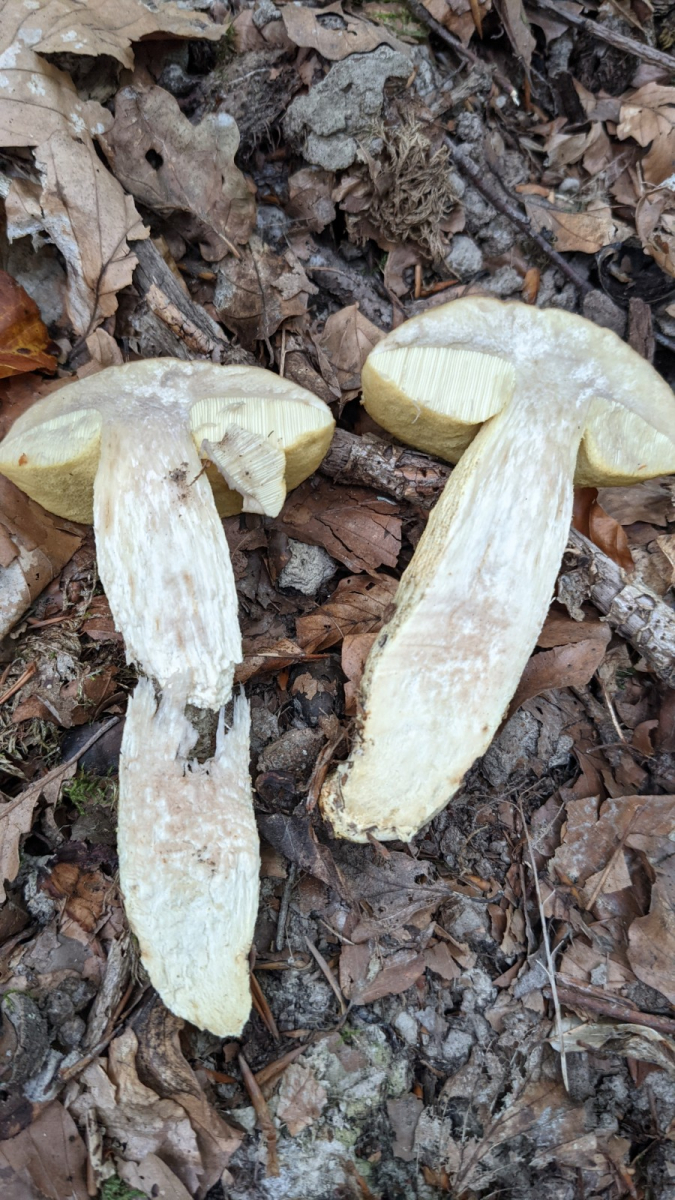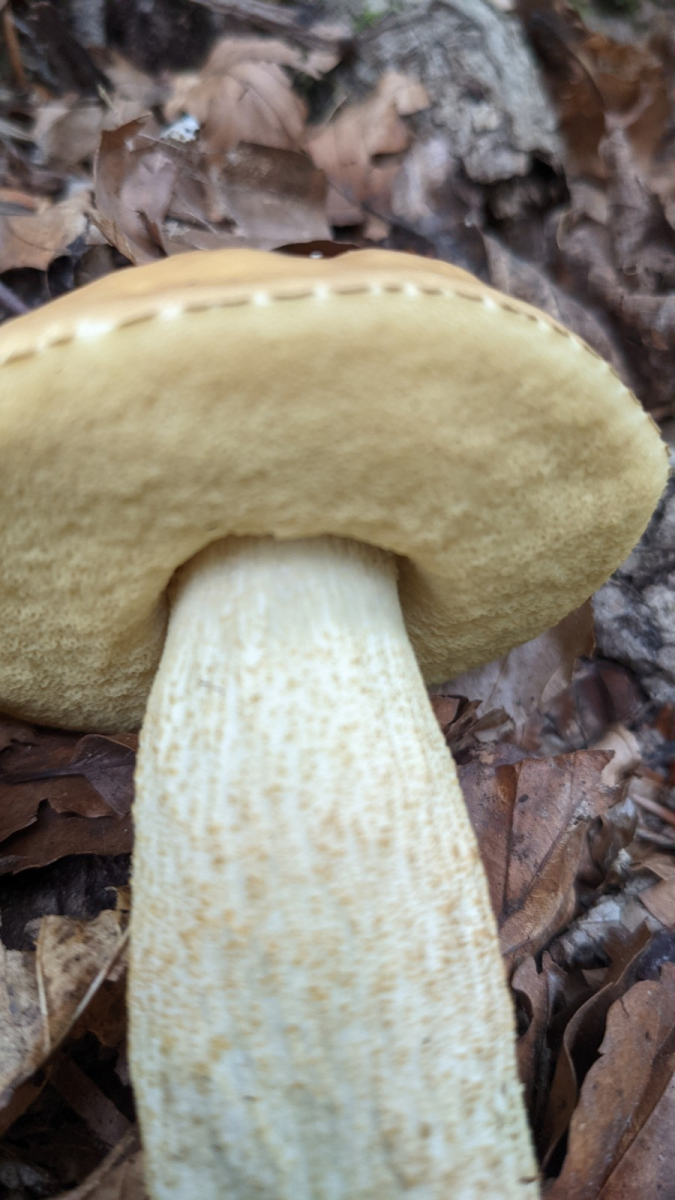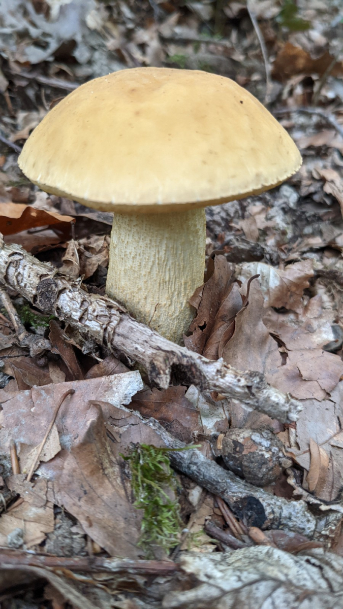 Hut ist ziemlich hell. Gelbe Röhren. Gelblicher rauher Stiel. Mh..