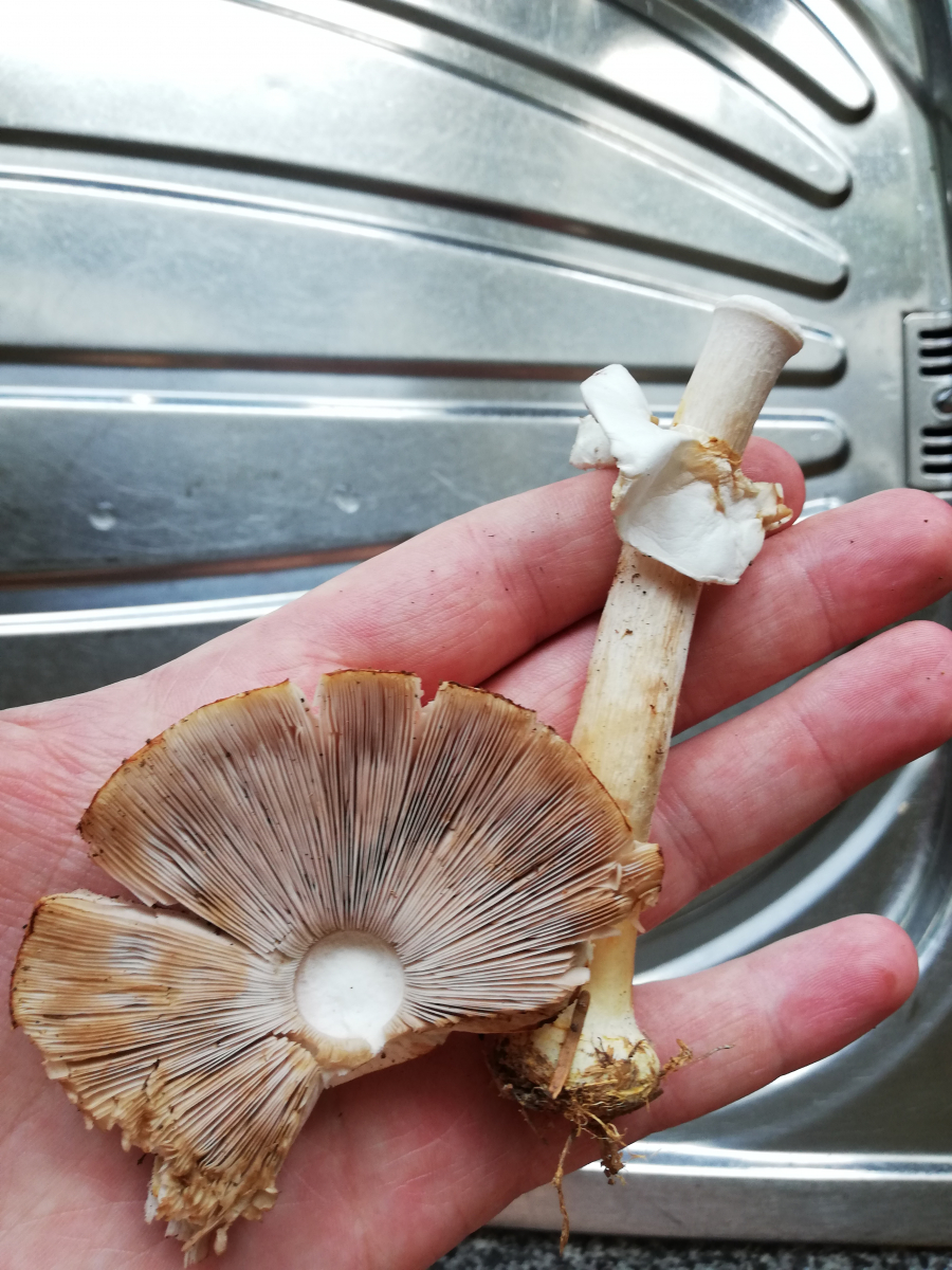 er roch angenehm, ganz leicht marzipanartig. Der Hut war anfangs reinweiß und gilbt stark gelblich, die Stielbasis gilbt nur sehr leicht. Habt ihr da eine Sektion für mich oder ist auch das unmöglich zu sagen, ich weiß dass Agaricus schwierig ist?