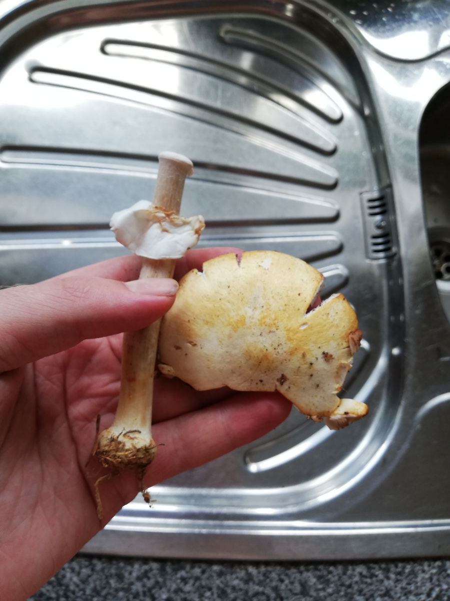 er roch angenehm, ganz leicht marzipanartig. Der Hut war anfangs reinweiß und gilbt stark gelblich, die Stielbasis gilbt nur sehr leicht. Habt ihr da eine Sektion für mich oder ist auch das unmöglich zu sagen, ich weiß dass Agaricus schwierig ist?