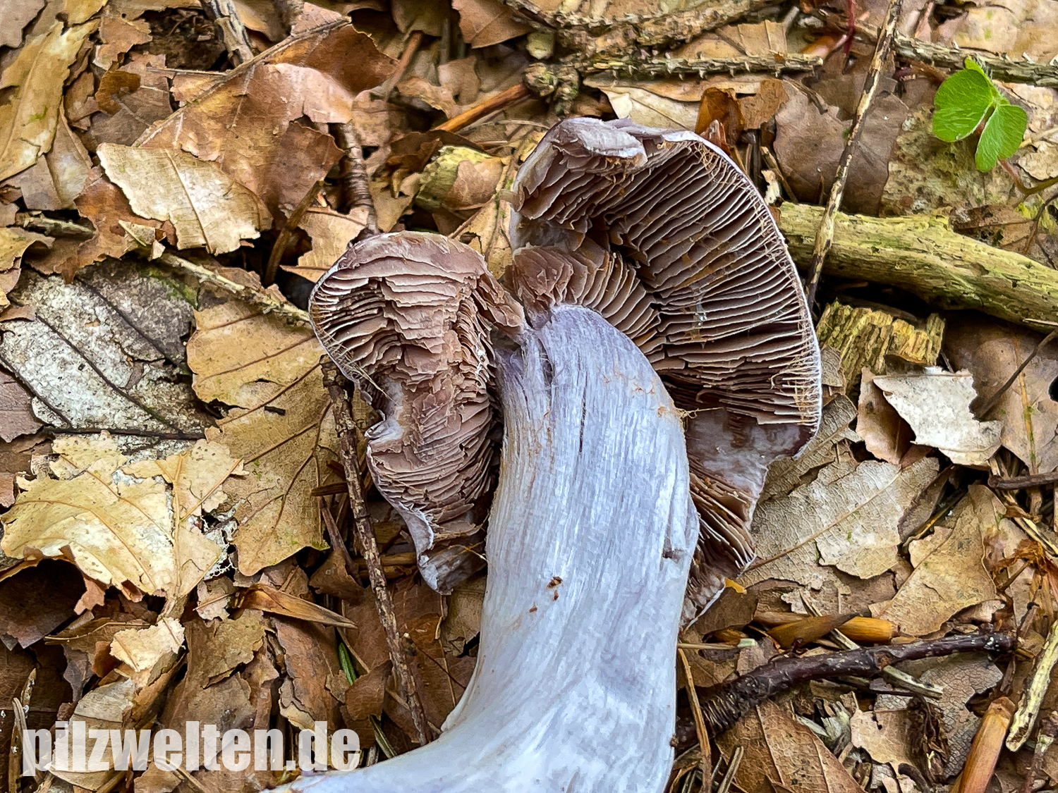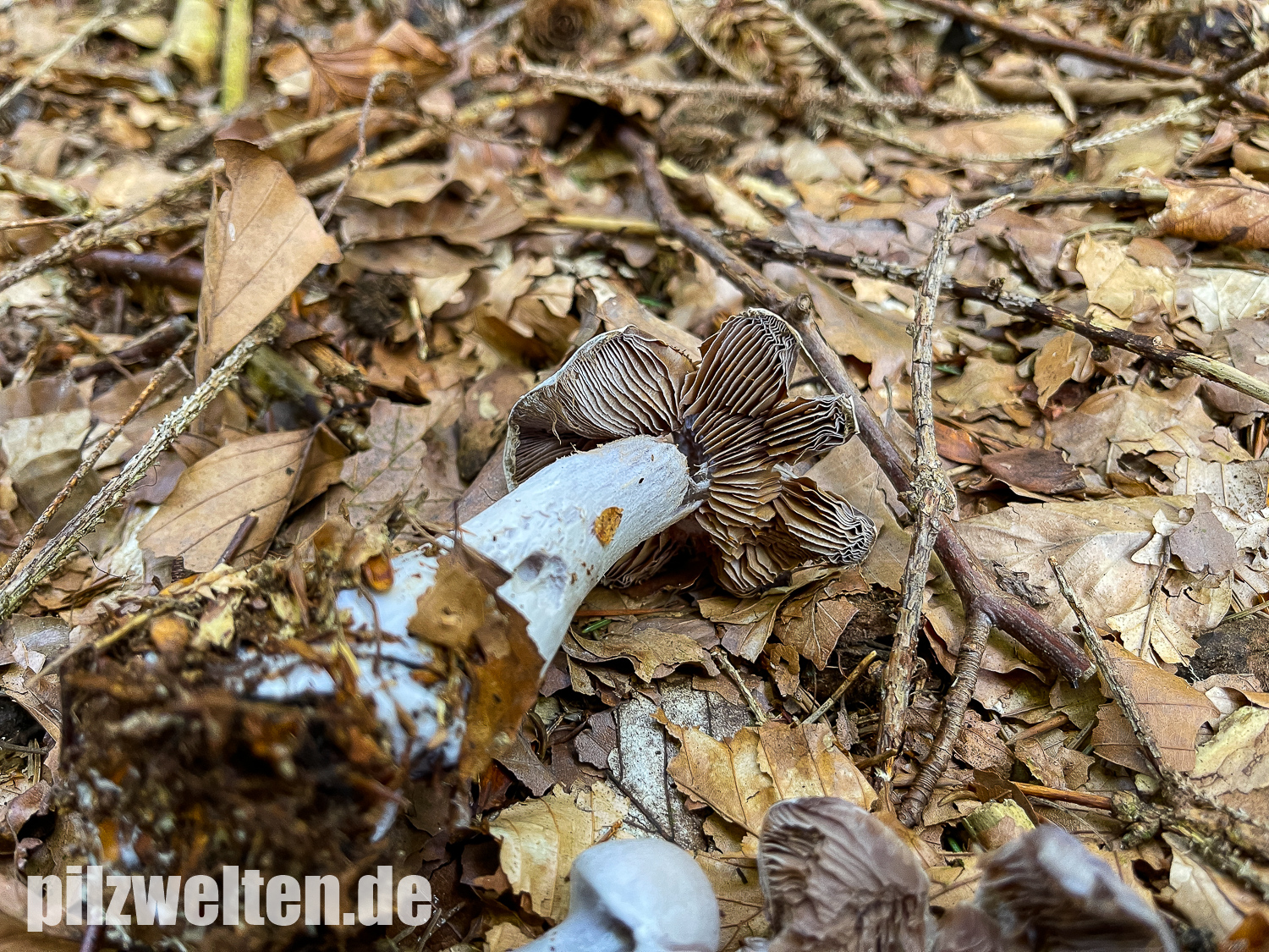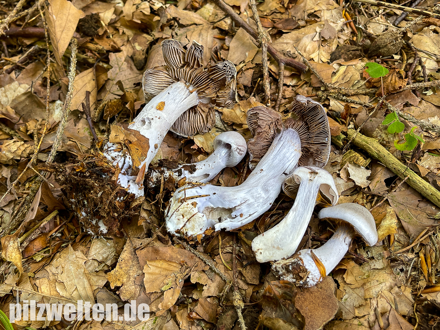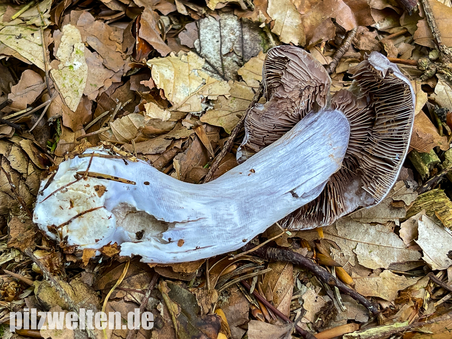 den folgenden Schleierling konnten wir im Buchenmischwald finden. Rein vom Gestank her nicht ganz so unangenehm wie der Bocksdickfuß, aber dennoch hart an der Grenze zu widerlich. Am ehesten erinnerte uns der Geruch an alten Camembert, weshalb wir den geruchstechnisch schon irgendwo ins Eck um Cortinarius camphoratus & Cortinarius traganus stecken würden. Allerdings ist das Fleisch nicht safrangelblich, was Cortinarius traganus ausschließt und ansonsten passt die Art für uns u. a. vom Habitat, farblich und vom Habitus (unser Fund heute war deutlich zierlicher als die Bocksdicksfußfunde die wir bisher hatten) auch überhaupt nicht zu Cortinarius camphoratus. Eine Art die besser passt haben wir aber bisher auch nicht gefunden, weshalb wir hier mal lose nachfragen wollten, ob sonst vielleicht noch jemand eine Idee dazu hat: