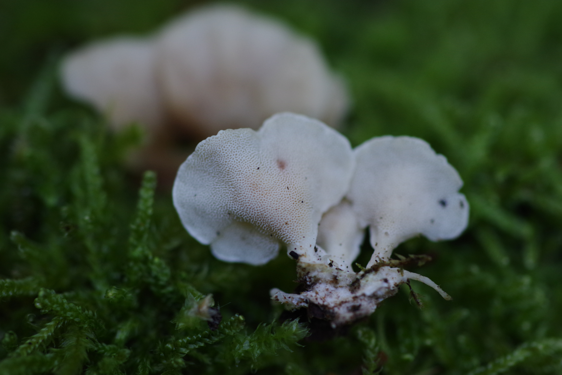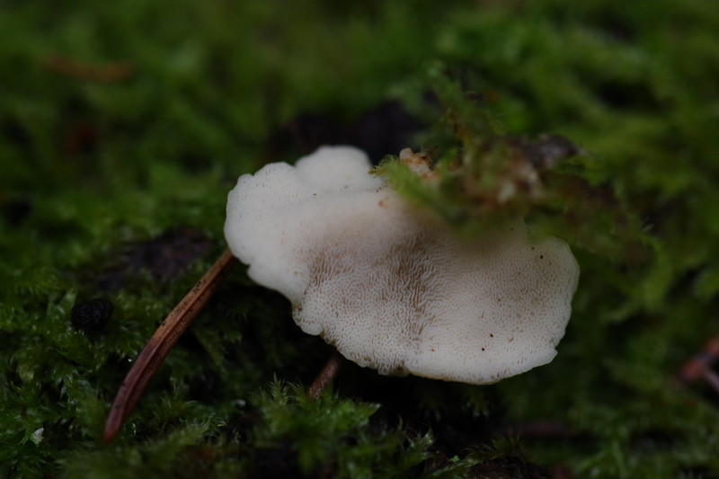 2) Ein kleiner (max. 2 cm) weißer sehr feinporiger, gestielter Porling an Schwarzerle, zusammen mit Nr. 1