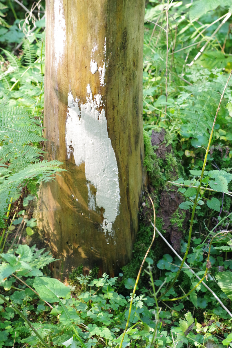 4) Eine Antrodia an Fichtenstumpf, fast nur resupinat mit kleinen Hütchen an einem Rand.