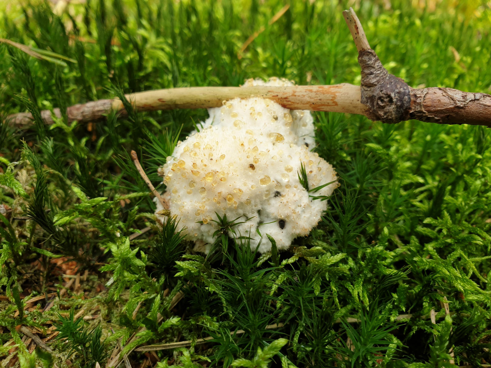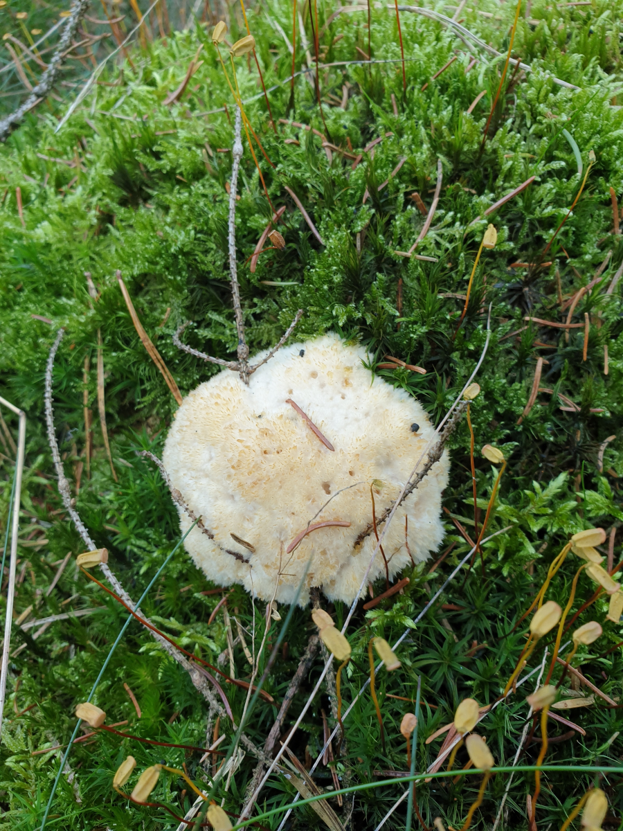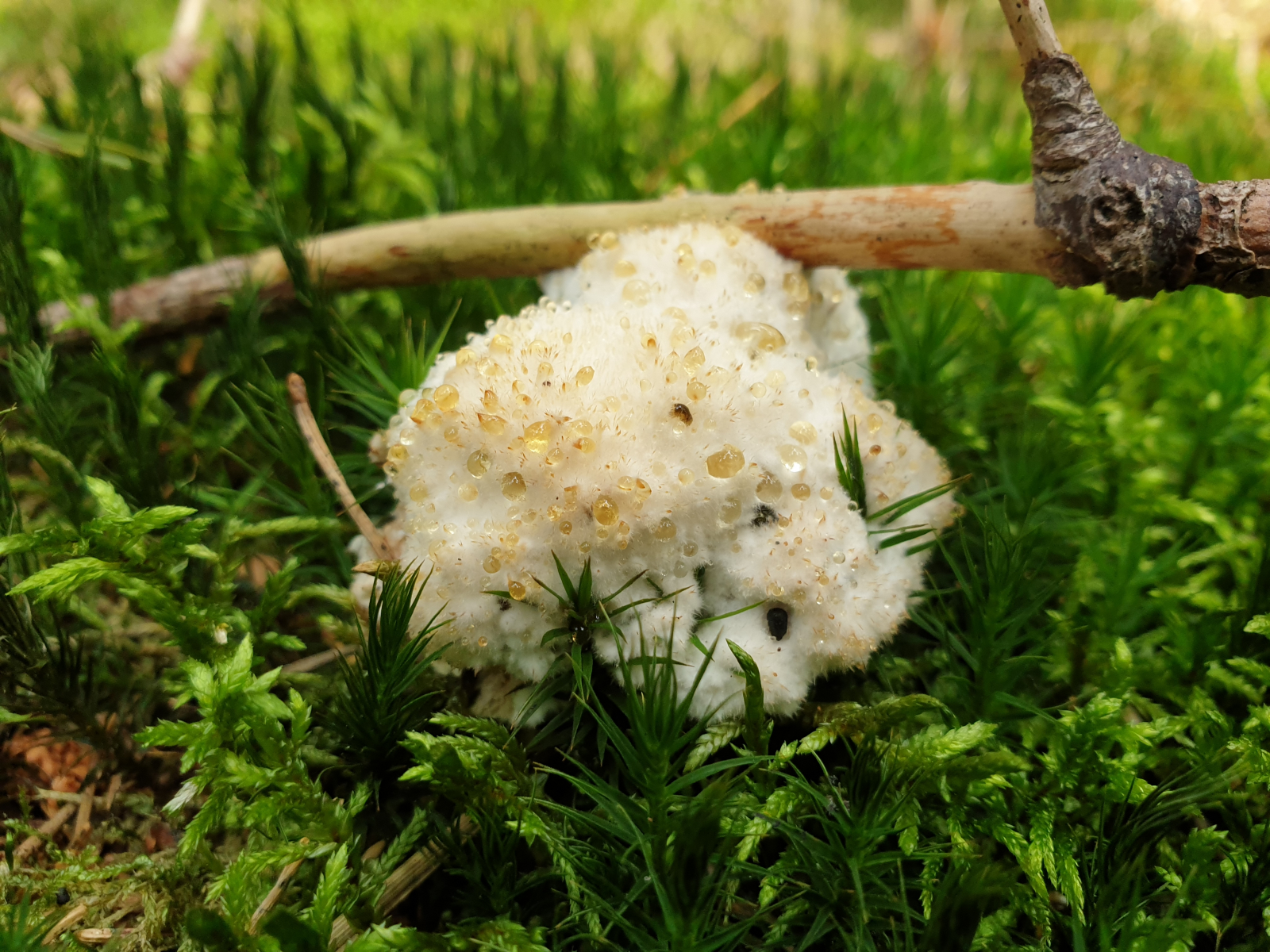 diesen puscheligen Pilz mit goldenen Guttationstropfen finde ich momentan zuhauf im sauren Nadelwald und in der (kieferndominierten) Heide - Handelt es sich hier um ein Jungstadium eines Porlings oder was könnte das sein?
