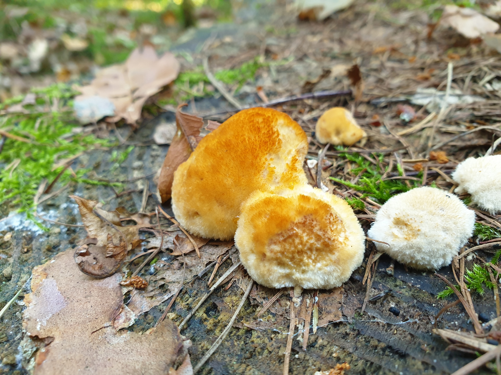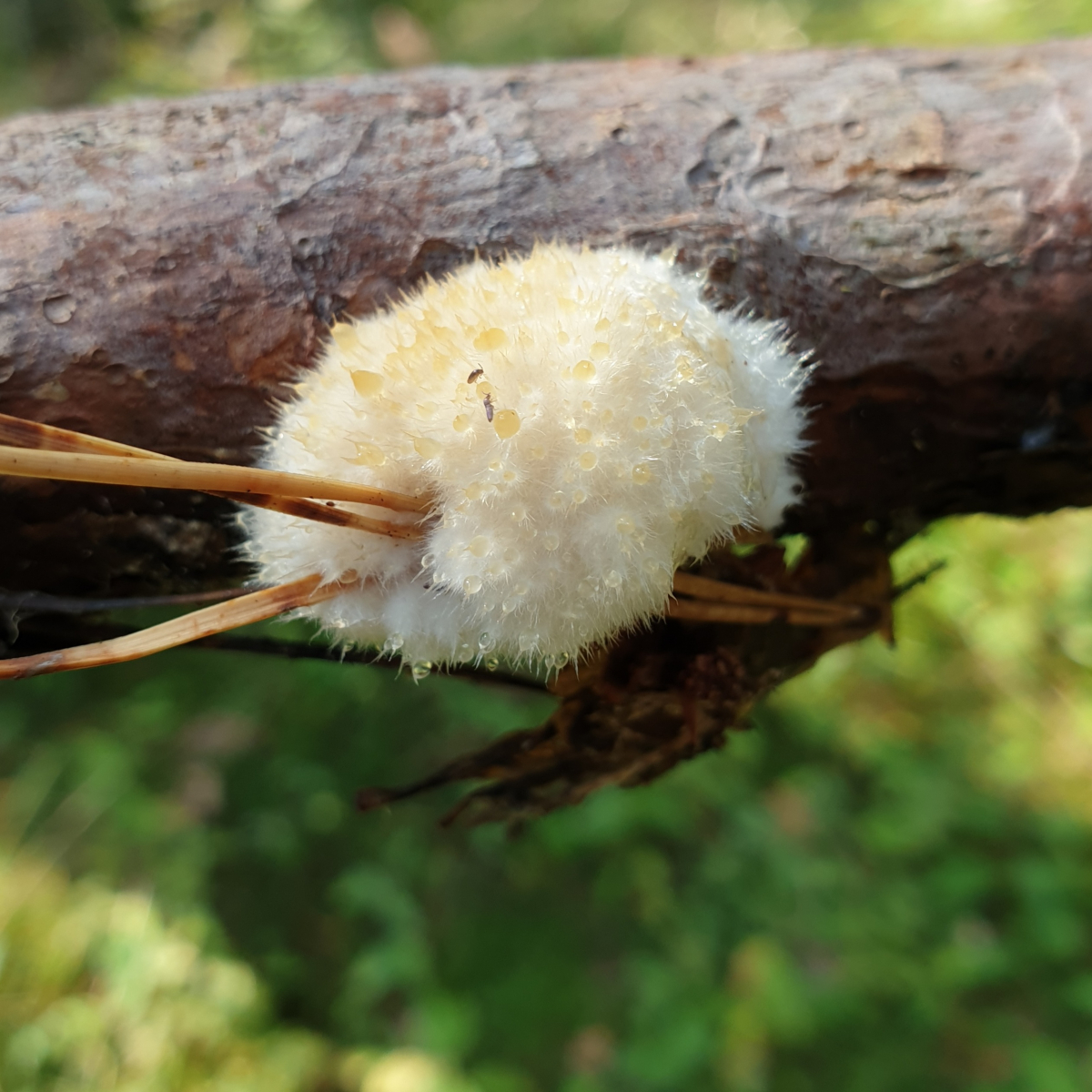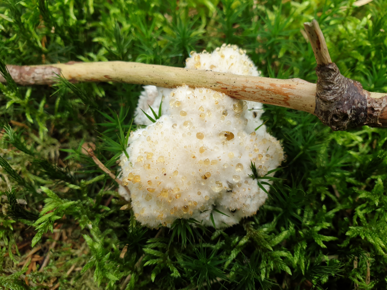 diesen puscheligen Pilz mit goldenen Guttationstropfen finde ich momentan zuhauf im sauren Nadelwald und in der (kieferndominierten) Heide - Handelt es sich hier um ein Jungstadium eines Porlings oder was könnte das sein?