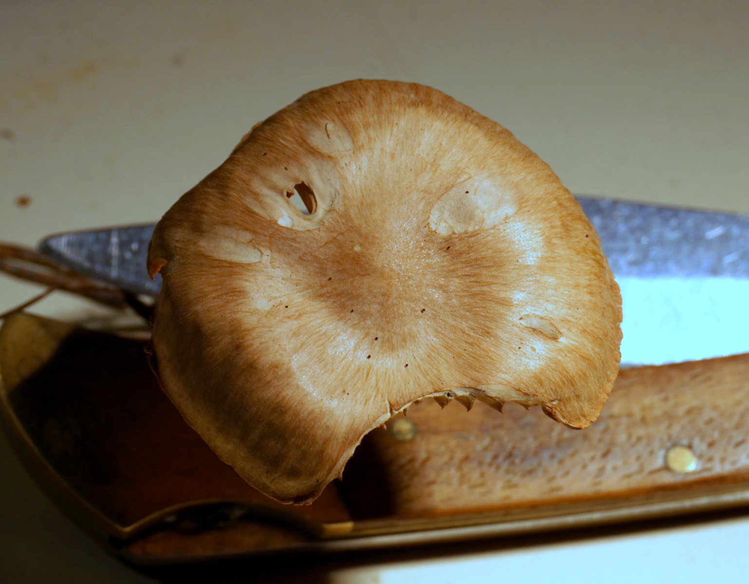 1. Ein rotmilchender Reizger ohne Lamellen, komplett weiß an seiner Unterseite, und nur dort wo sonst die Lamellen zu sehen sind. Ansonsten ein klassischer Reizker, welche es einige in der Nachbarschaft gab. Es gab mehrere mit dieser Anomalie in der Nähe. Ein parasitierender Pilz?
