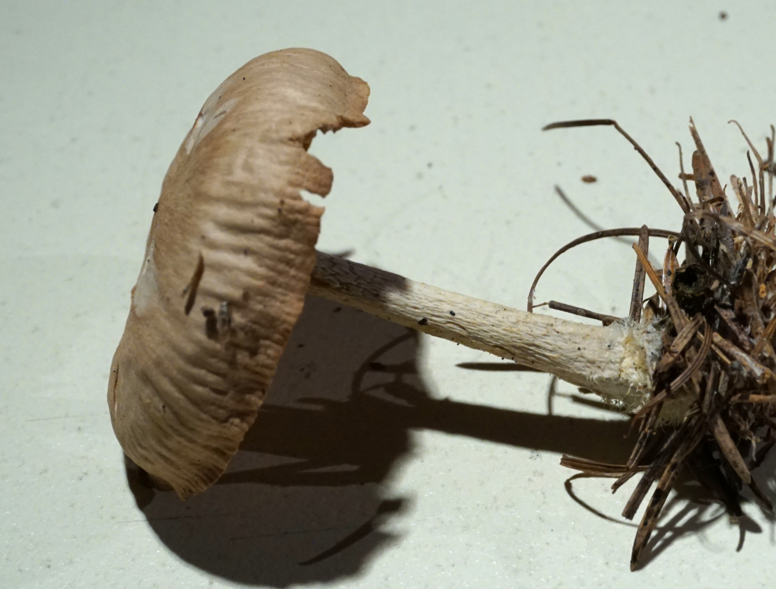 2. Eine andere Art aus dem Nordschwarzwald kann ich nicht einordnen. Sto. Nadelwald im Nadelstreu (Fichte), Geruch pilzig, neutral, ca. 4cm breit. Ich hätte auf Risspilz getippt, aber die komplett freistehenden Lamellen und die markante Stielform passen irgendwie nicht. Hat jemand eine Ahnung, in welche Gattung dies passen könnte?