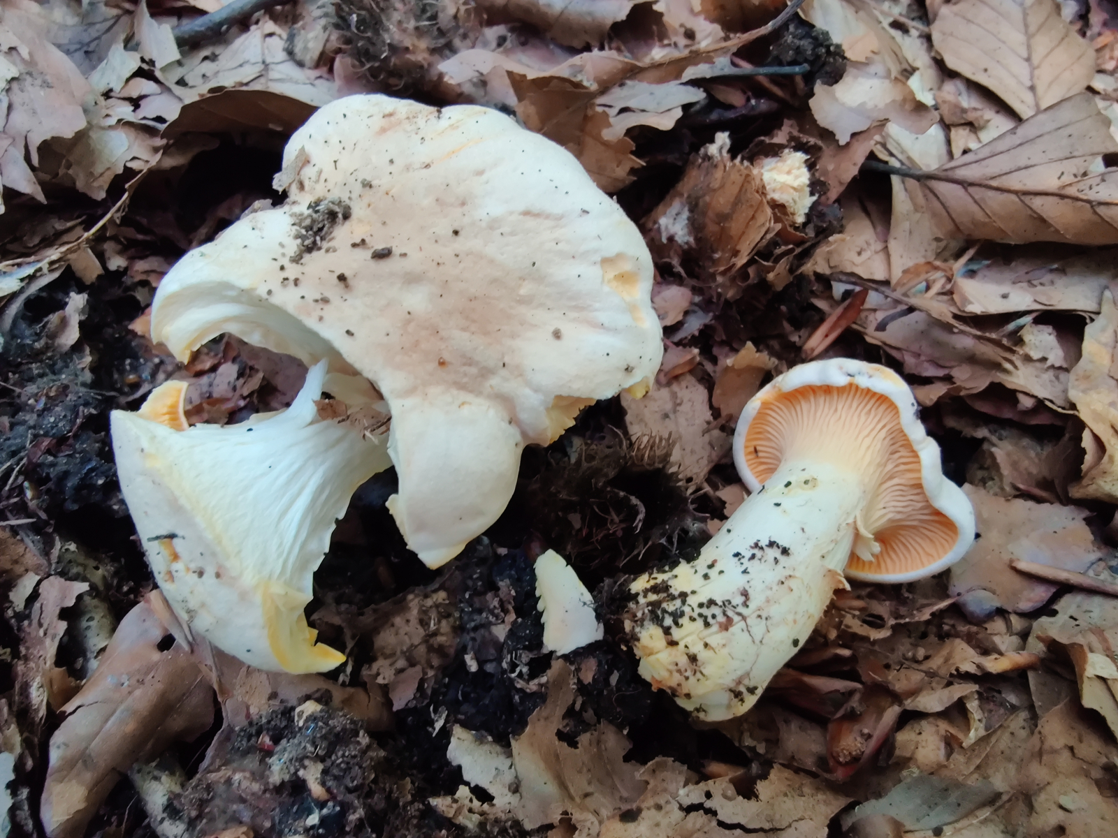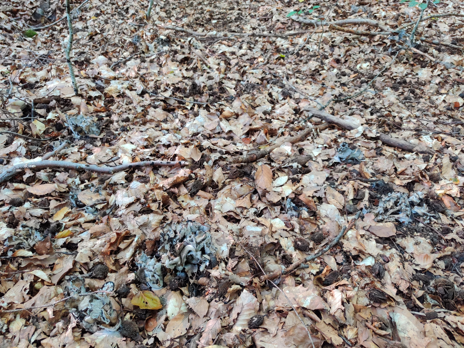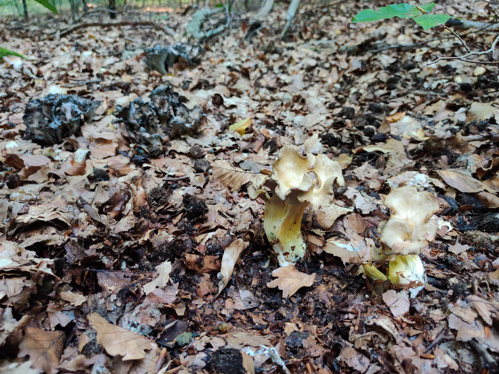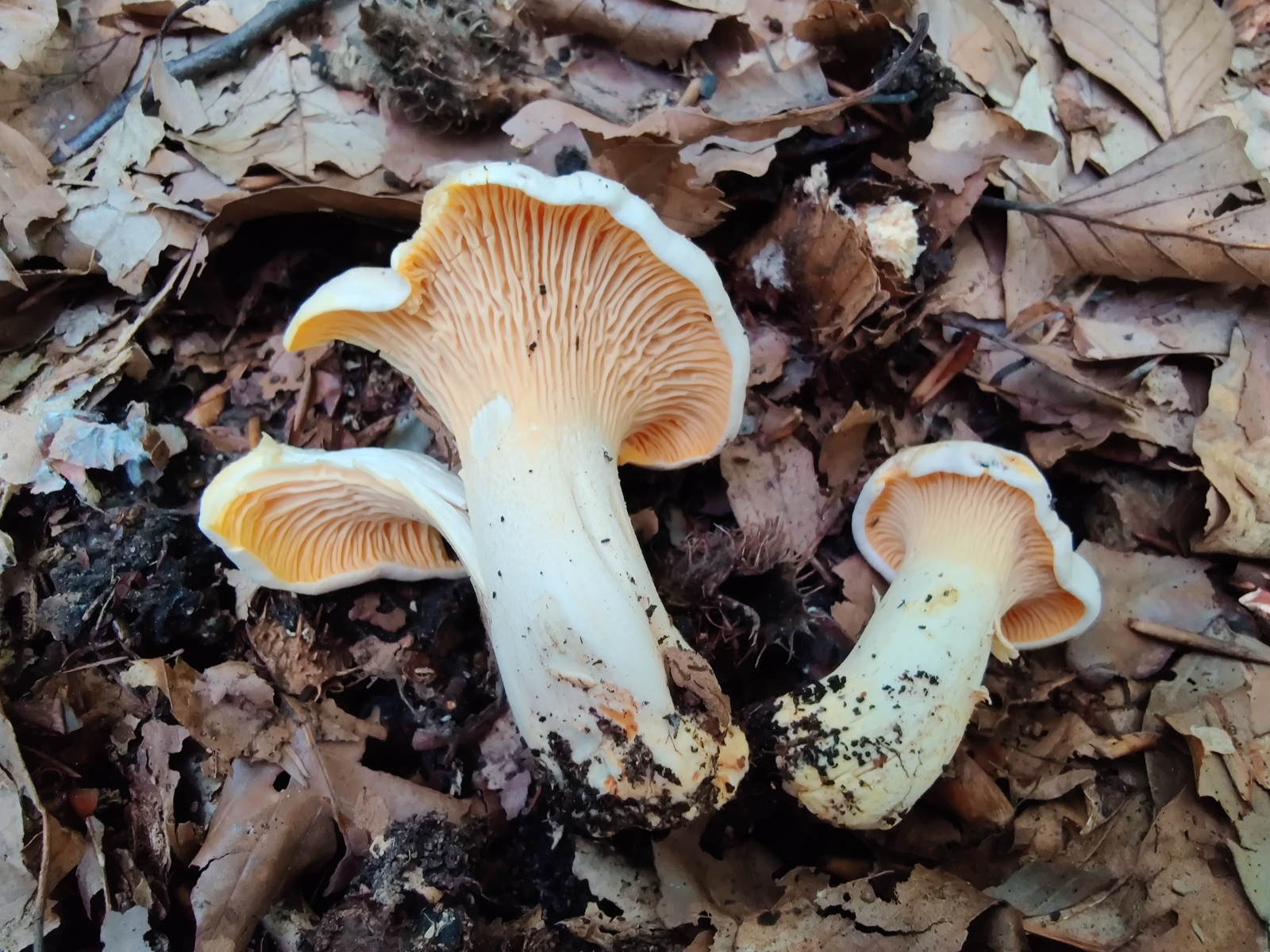 Immer wieder und sehr zahlreich waren orangerote Stoppelpilze zu finden. Welche Art es genau war kann ich nicht sagen. Mit den Grauen Leistlingen (Craterellus cinereus) ging es genau so weiter wie es letztes Mal aufgehört hatte. Fast überall standen große Nester großer Fruchtkörper. Auch vom Schwärzenden Leistling (Craterellus melanoxeros) gab es erneut einige Cluster. Imposant war wieder der Wollige Milchling (Lactifluus vellereus).