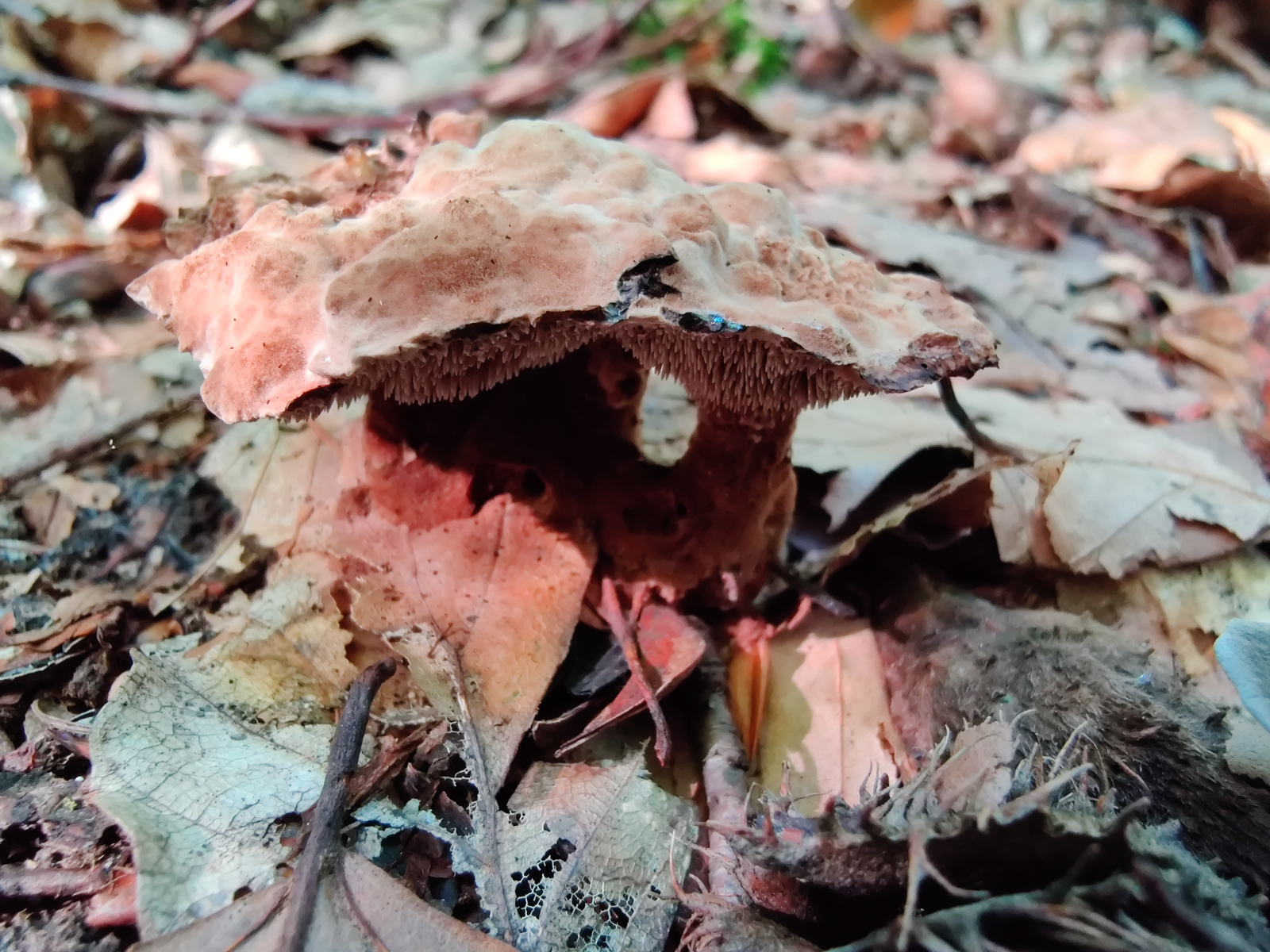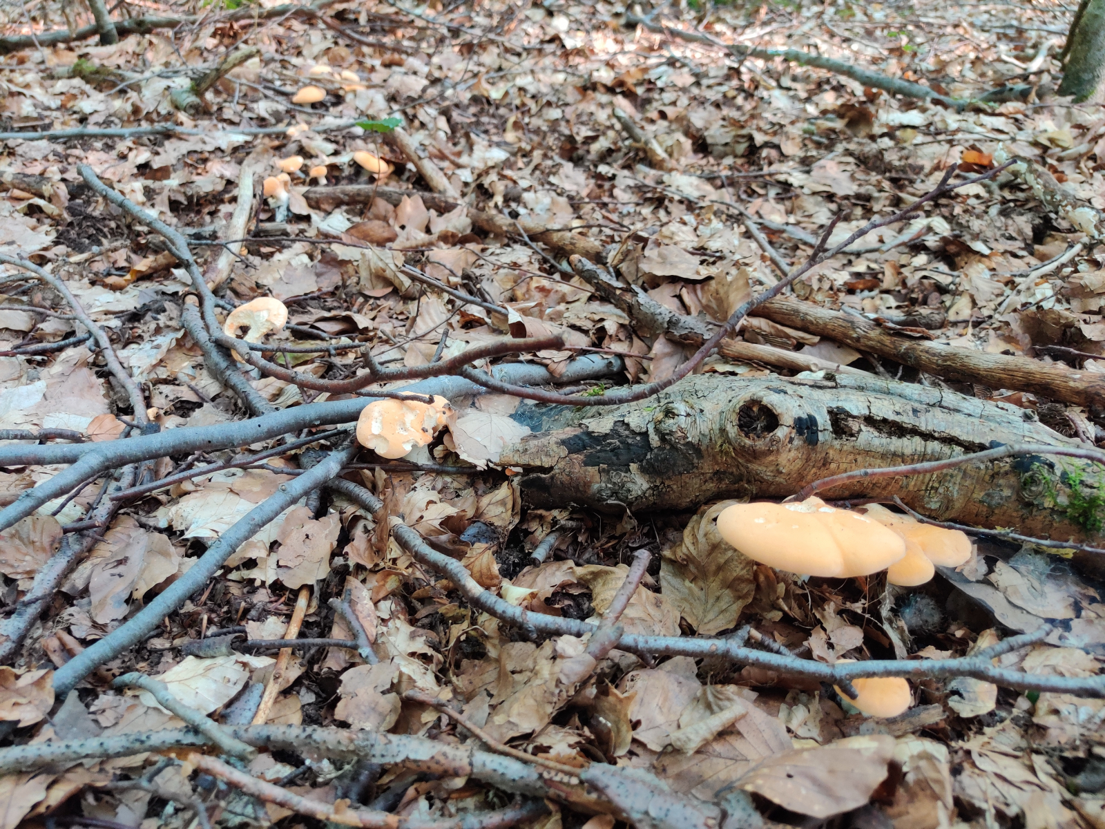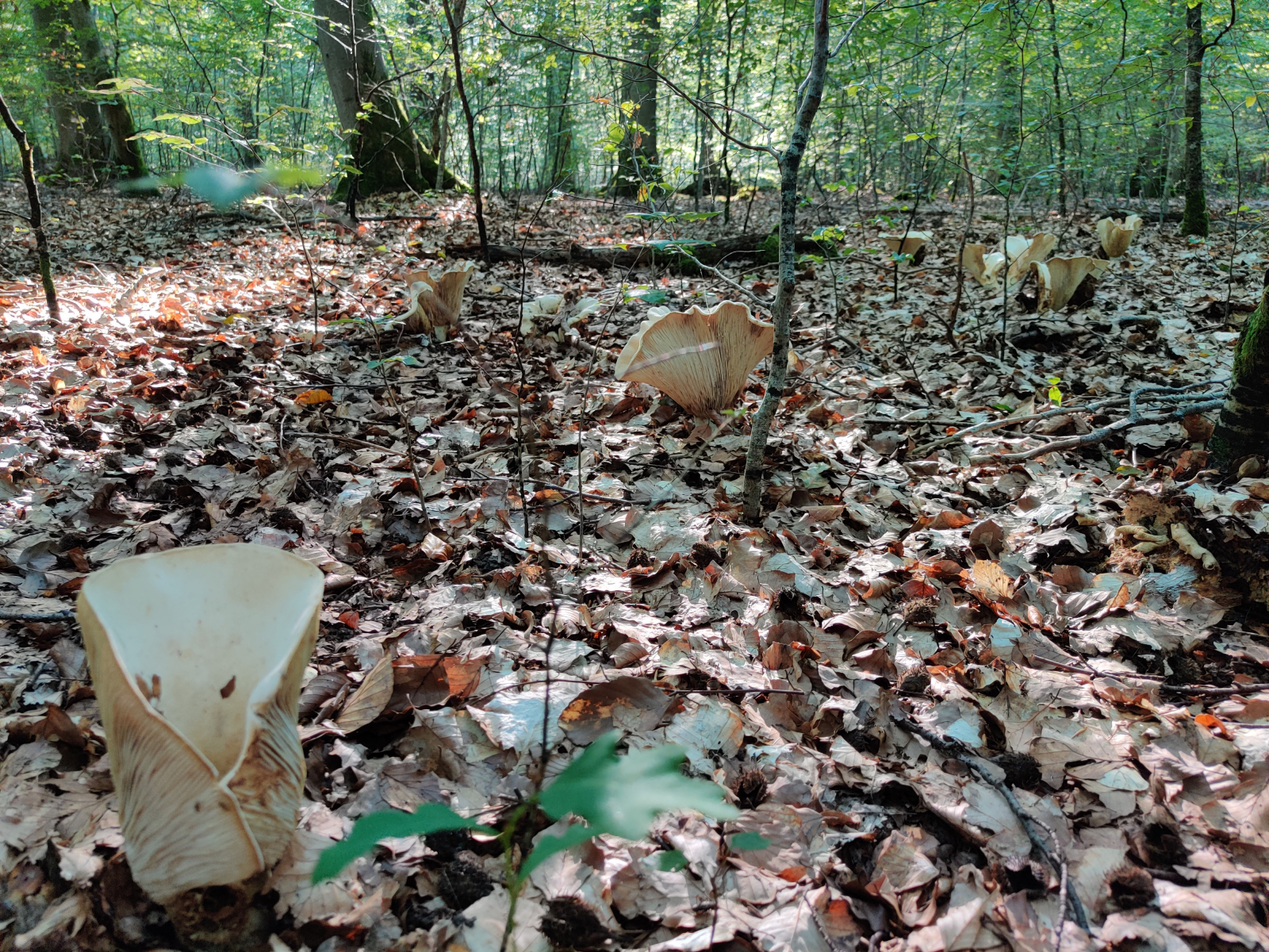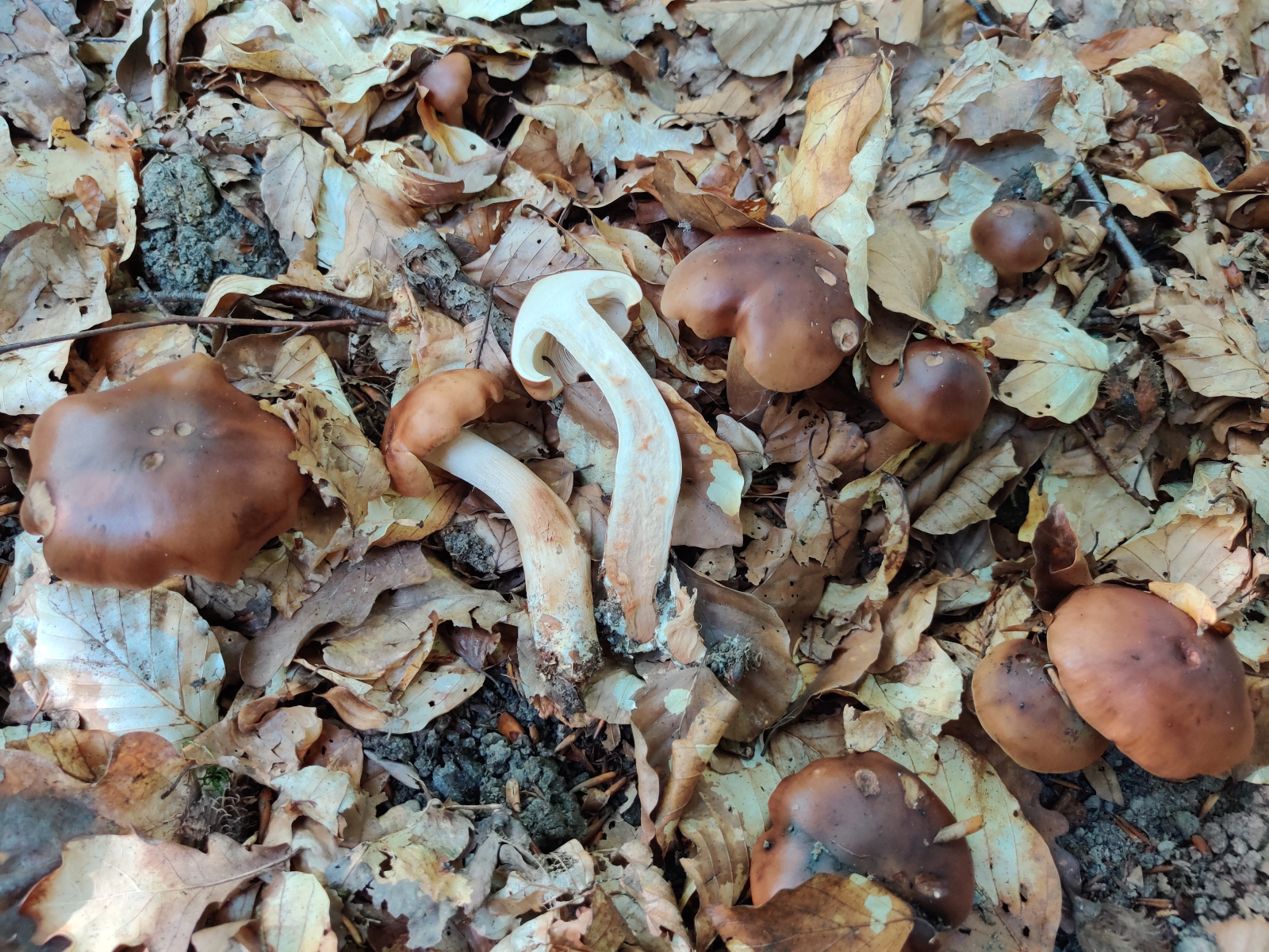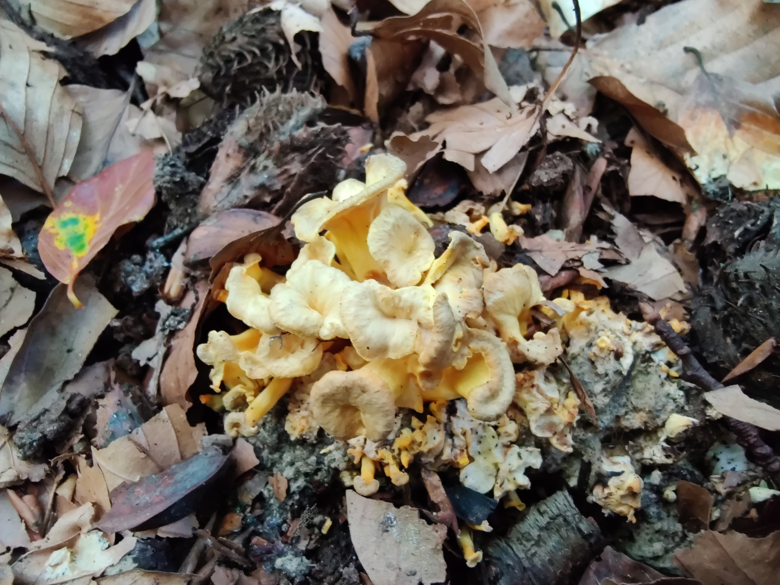 Immer wieder und sehr zahlreich waren orangerote Stoppelpilze zu finden. Welche Art es genau war kann ich nicht sagen. Mit den Grauen Leistlingen (Craterellus cinereus) ging es genau so weiter wie es letztes Mal aufgehört hatte. Fast überall standen große Nester großer Fruchtkörper. Auch vom Schwärzenden Leistling (Craterellus melanoxeros) gab es erneut einige Cluster. Imposant war wieder der Wollige Milchling (Lactifluus vellereus).