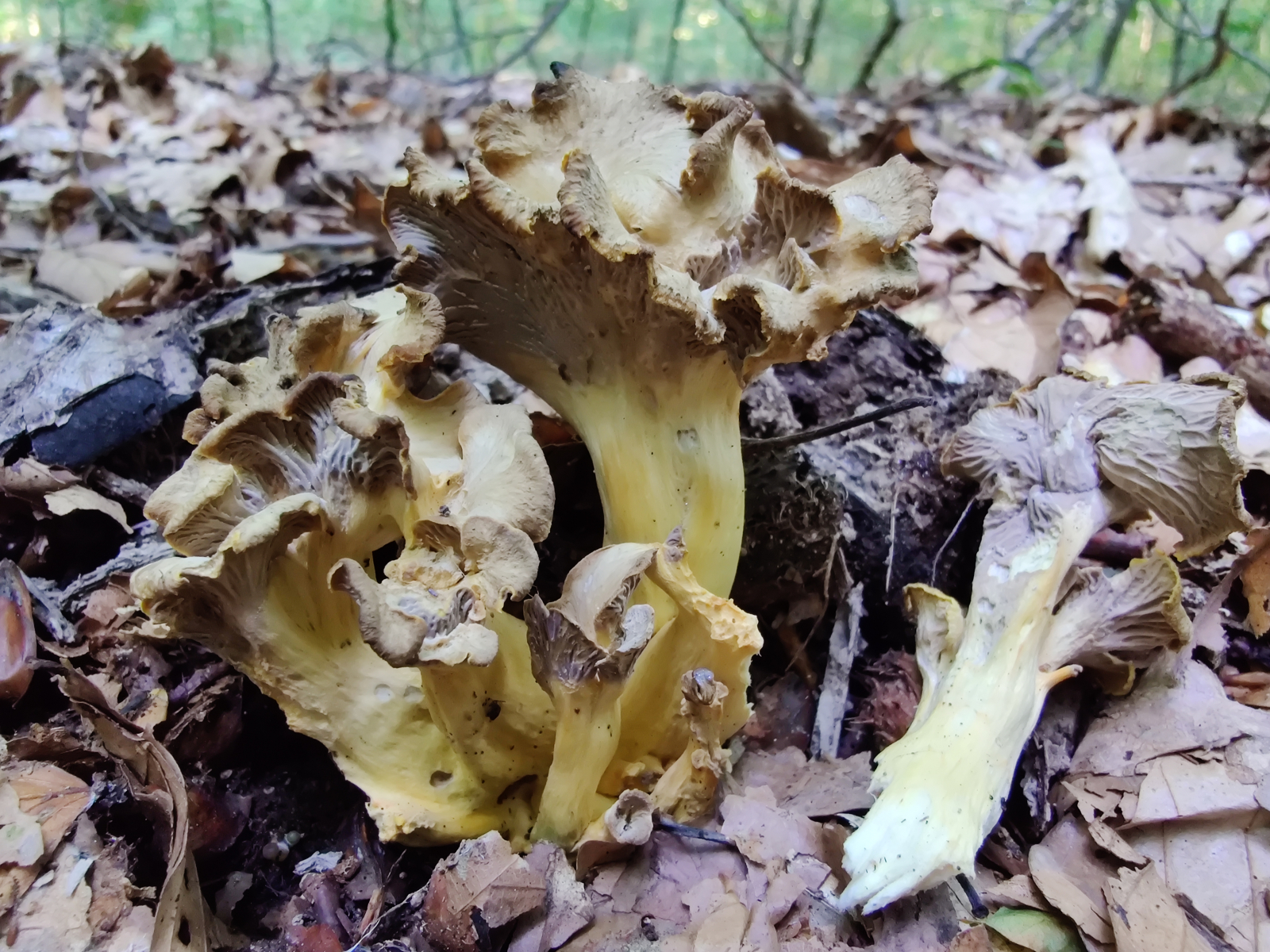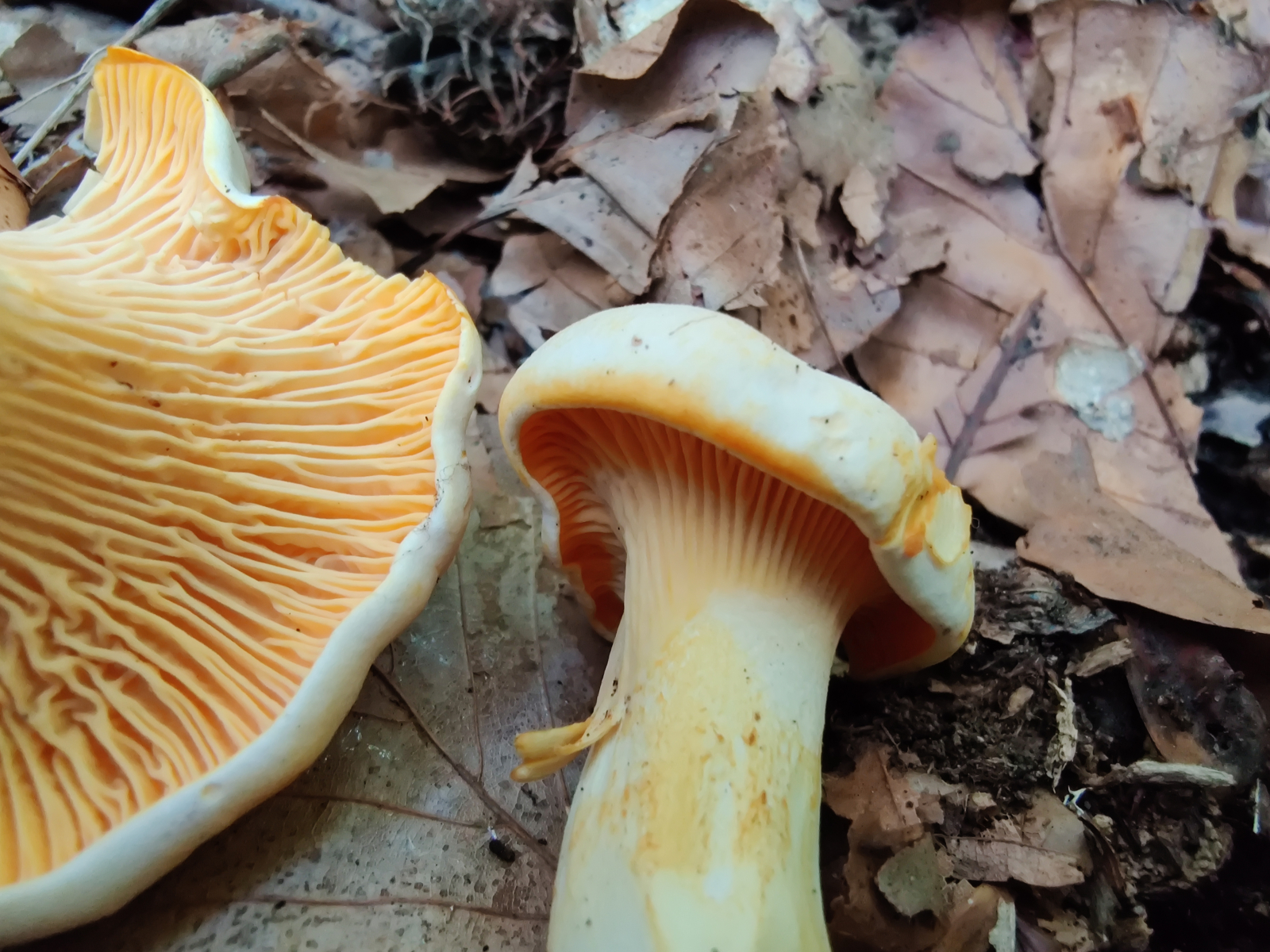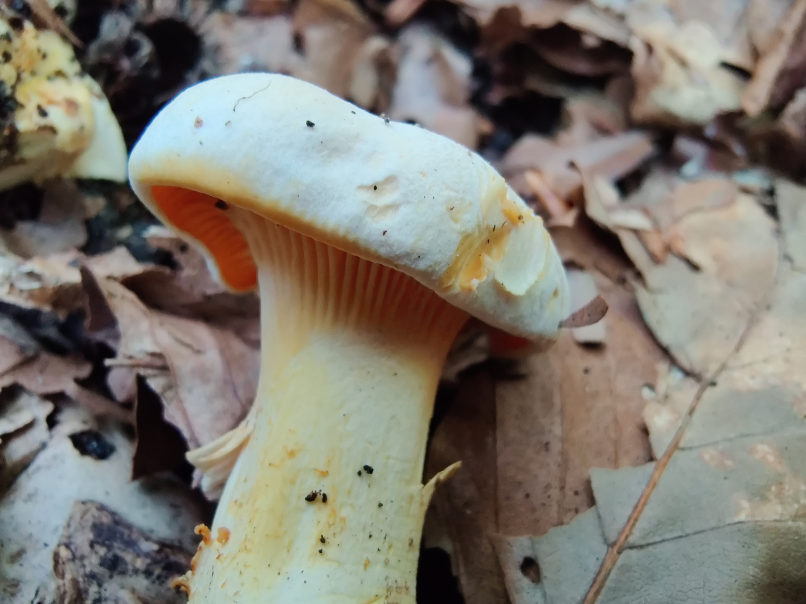 1. Los ging es mit zwei Pfifferlingen. Aufgrund der kräftigen Statur, der bis auf die Leisten sehr hellen Farben, den Verfärbungen und der bereiften Hutoberfläche, bin ich bei dem Blassen/Bereiften Pfifferling (Cantharellus pallens/subpruinosus). Was ich nicht genau verstanden habe, stecken hinter diesen Namen zwei unterschiedliche oder eine Art? Kann mich da jemand aufklären? Interessant fand ich, dass die Leisten frisch fast orangefarben waren. Der Rest der Fruchtkörper war weißlich, das Fleisch gilbte deutlich und verfärbte sich später bräunlich.