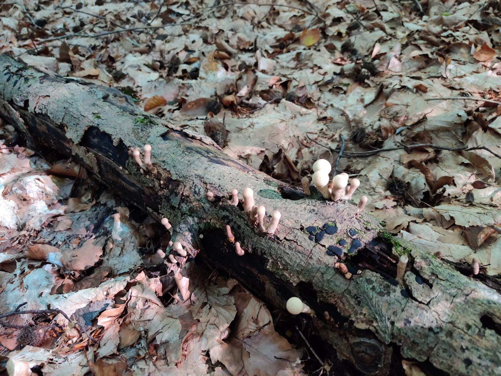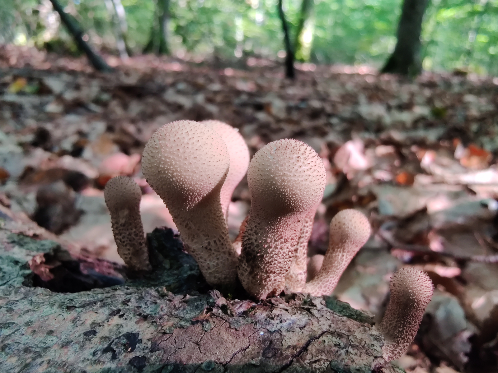 2. Weiter ging es mit zwei Stäublingen. Zunächst entdeckte ich diese Truppe auf einem Buchenast mit ~ 15cm Durchmesser. Hier bin ich beim Birnen-Stäubling (Lycoperdon pyriforme).