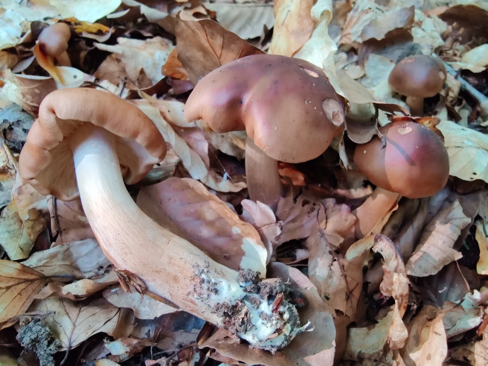 4. Unter einem Hochsitz fand ich folgende Pilze. Hier lande ich beim Brandigen Ritterling (Tricholoma ustale).