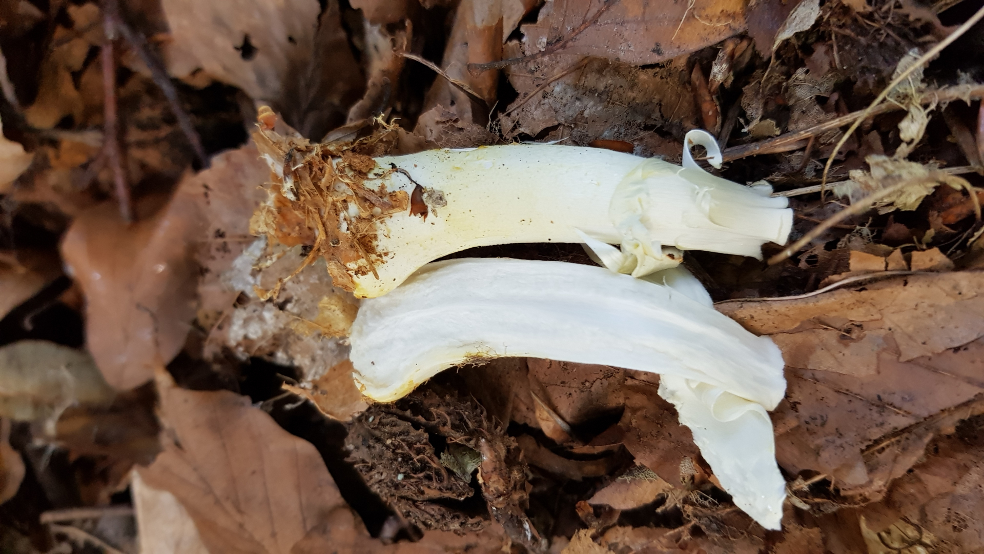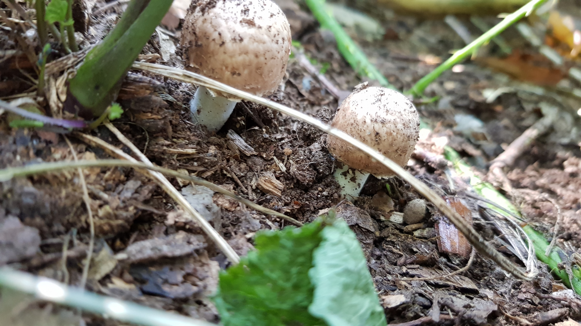 1.) Zwischen 2 jungen Eichen, einer Kiefer und vermutlich einer Kirsche, habe ich diese beiden ganz junge Pilze gefunden.