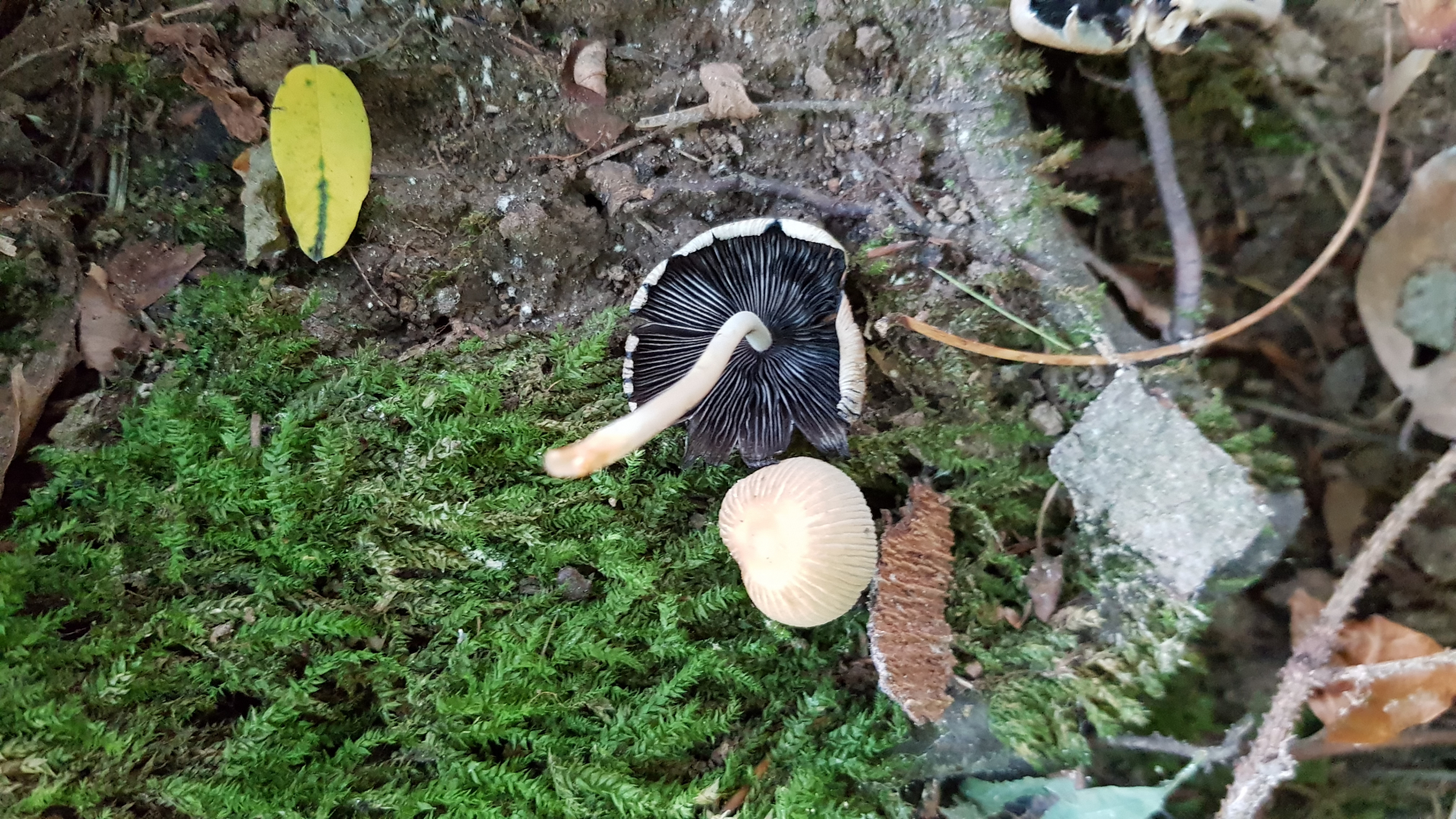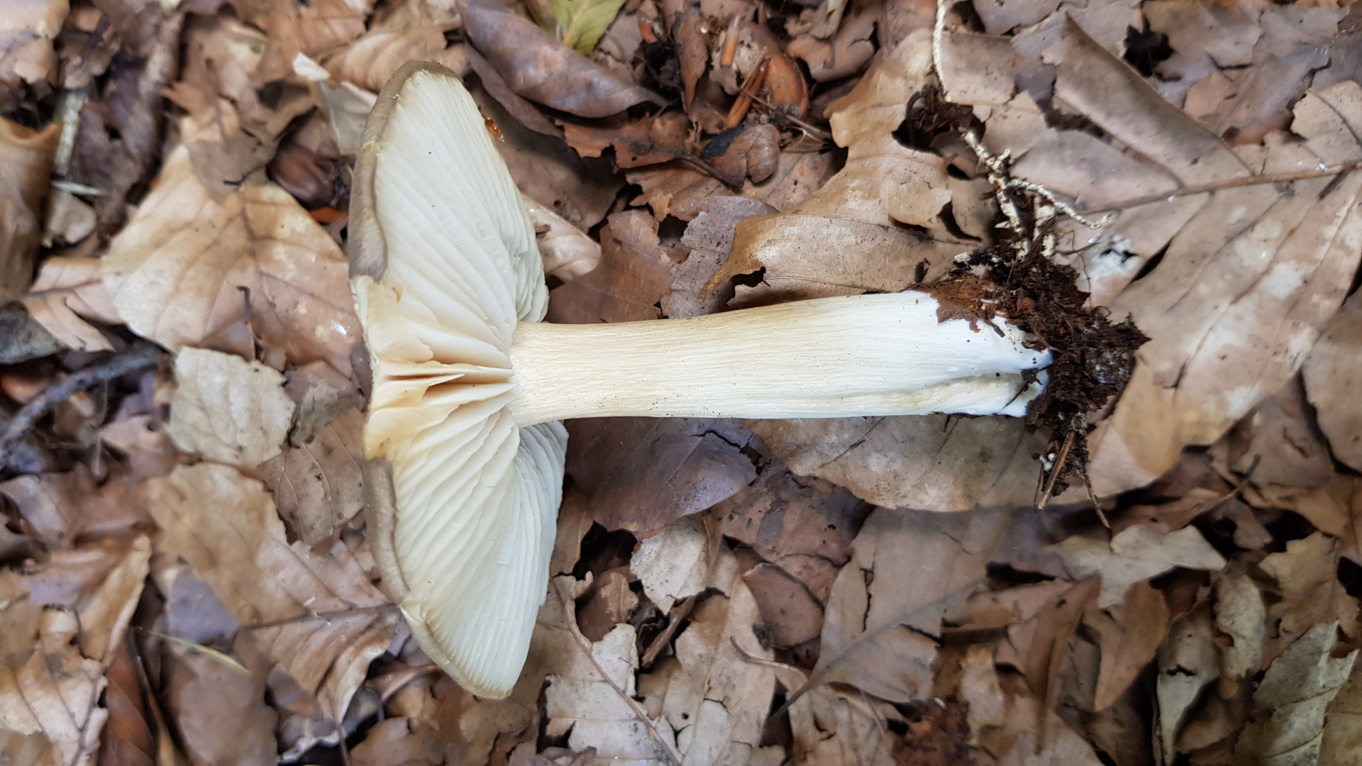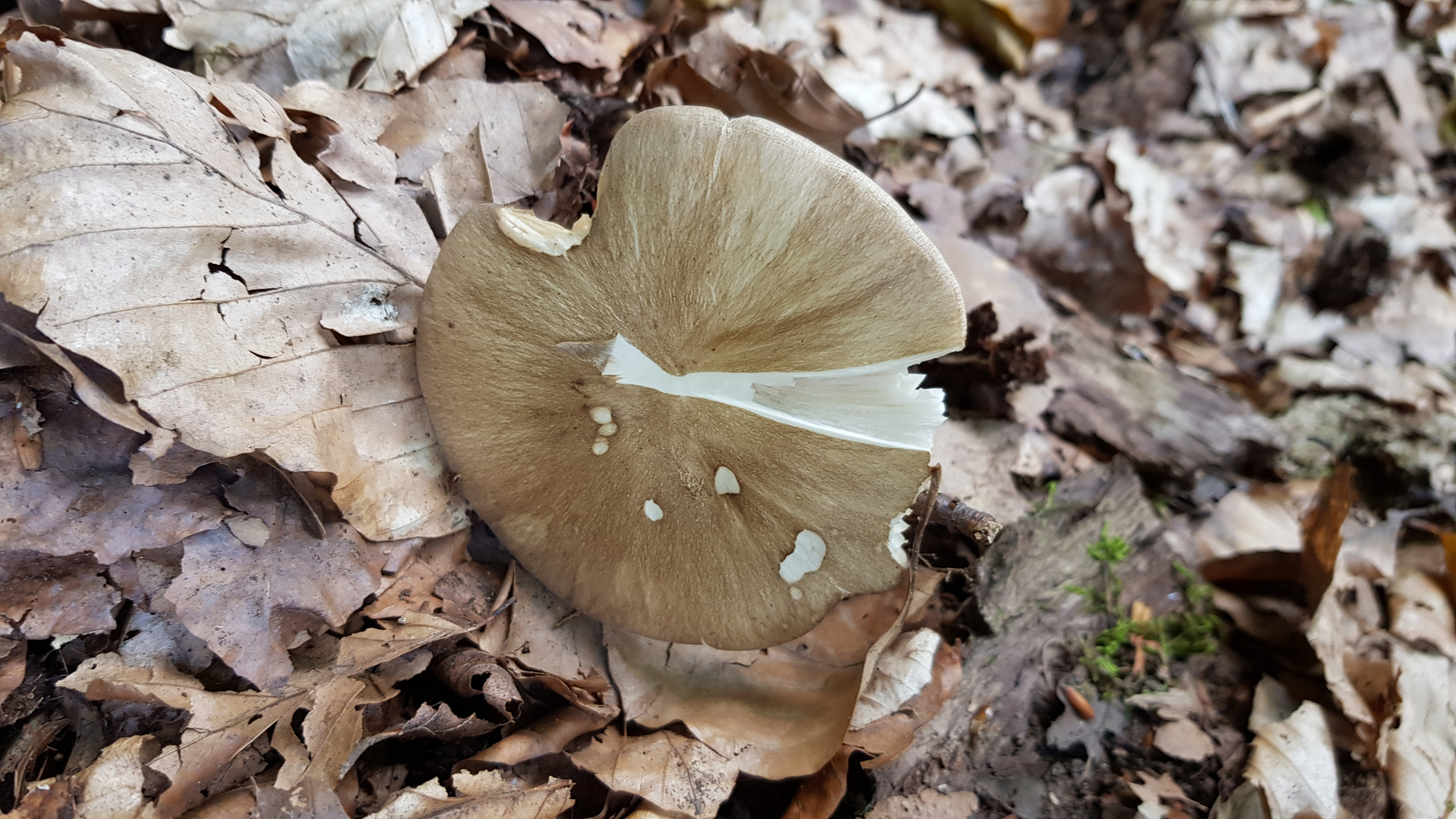 7.) Der Pilz stand allein am Wegesrand; Hutfarbe: braun-grau; von radialen dunkleren Fasern gestreifte Oberfläche; weißliche Lamellen, breit, Zwischenlamellen; fasriger Stiel, hell braun-grau