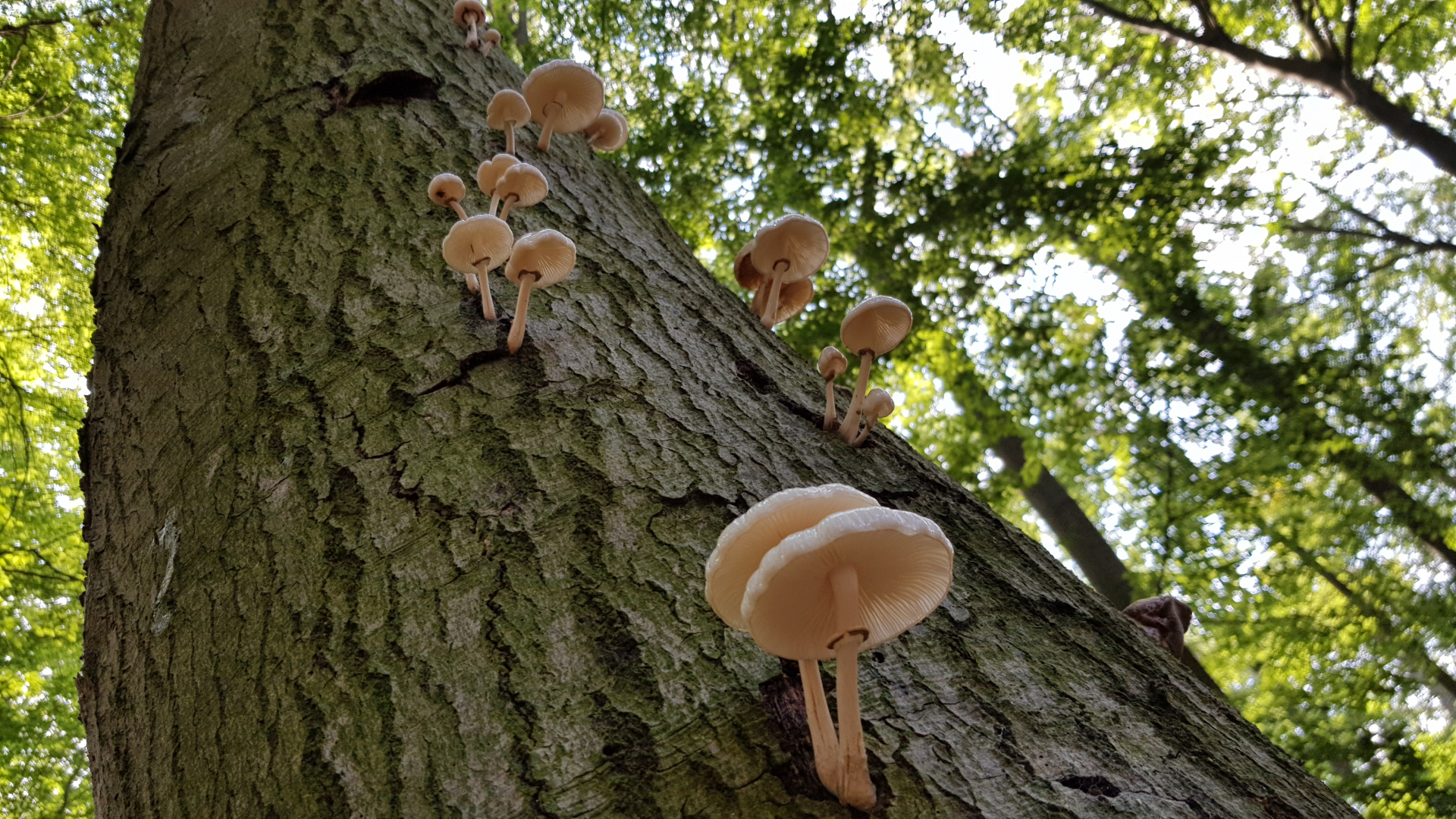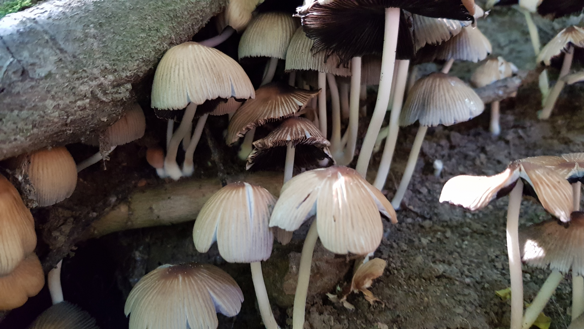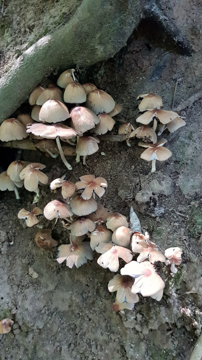 7.) Der Pilz stand allein am Wegesrand; Hutfarbe: braun-grau; von radialen dunkleren Fasern gestreifte Oberfläche; weißliche Lamellen, breit, Zwischenlamellen; fasriger Stiel, hell braun-grau