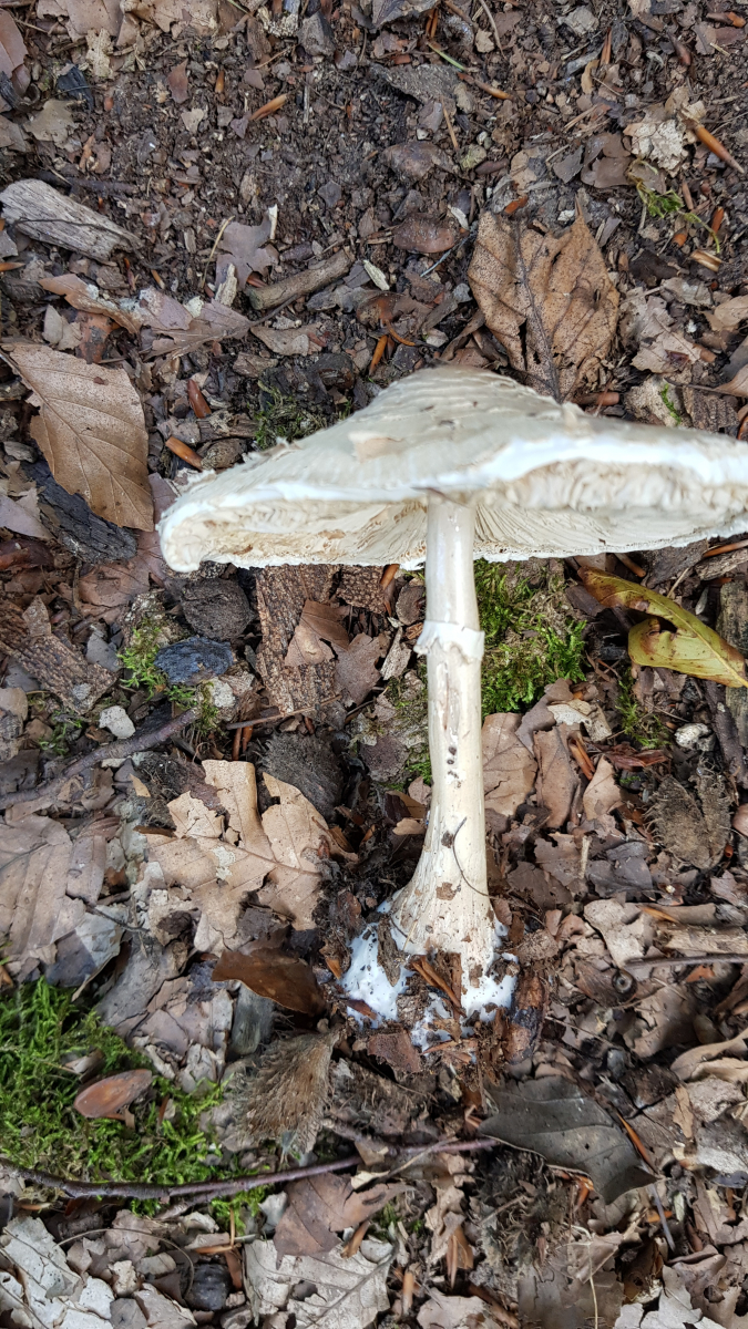 6.) Der Pilz stand allein am Wegesrand; Hutmuster und Knolle passen zum Safran-Schirmling; der Ring ist zu schwach. Der Hut und die Lamellen haben sich wie aus Gummi angefühlt.