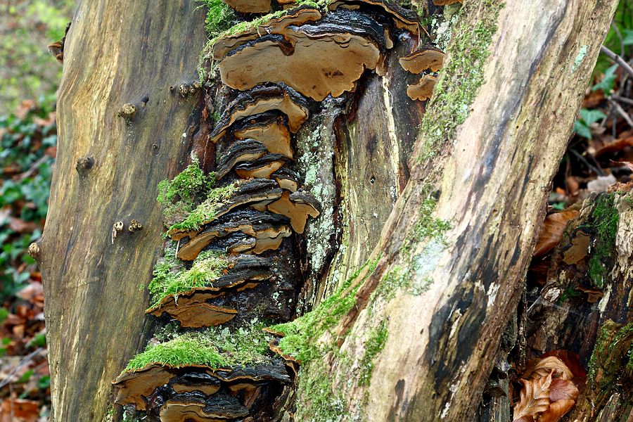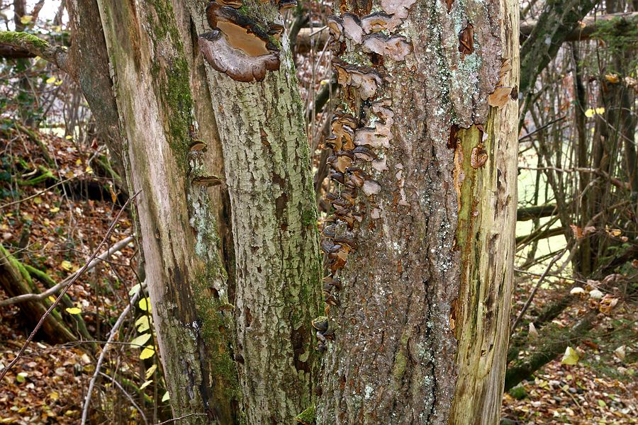 Dieses Foto zeigt einen Pilz, den ich gestern fotografiert habe und von dem ich bis heute sicher war, dass es sich um eine "Umberbraune Borstenscheibe" (Hymenochaete rubiginosa) handeln würde. Die Fruchtkörper wuchsen an einem fast kahlen ca. 3m hohen toten Baumstamm mit Ästen und waren von unten bis oben zu finden. Teilweise waren sie flächig angewachsen und liefen am Substrat herunter (ca. 10x20 cm grosse Flächen). Ich hatte angenommen, dass es sich beim Baum um eine Eiche gehandelt hat. Das Fleisch der Pilze war durchgehend dunkelbraun, die Breite mancher Hüte war gut 10cm.