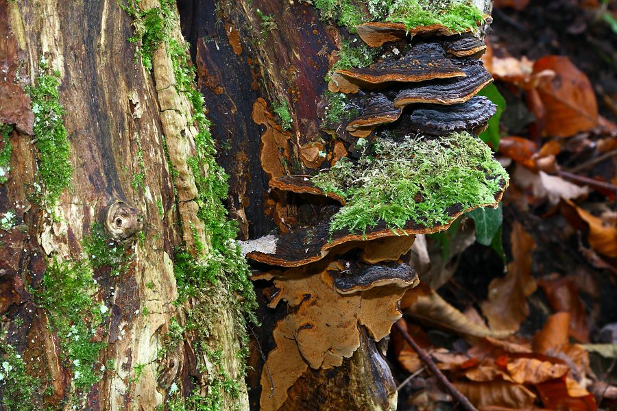 Ich denke, der Phellinus conchatus ist ein Volltreffer! Wiederum ist ein entsprechendes Bild nur zu finden, wenn man weiss wonach man sucht, denn sehr oft werden nur die braunen Kissen abgebildet und nicht die Hüte. Nach gezielter Suche und dem Studium entsprechender Literatur scheint aber nunmehr alles zu stimmen, sogar der regelmässig vorkommende Moosbewuchs wird in meinem Pilzführer erwähnt.
