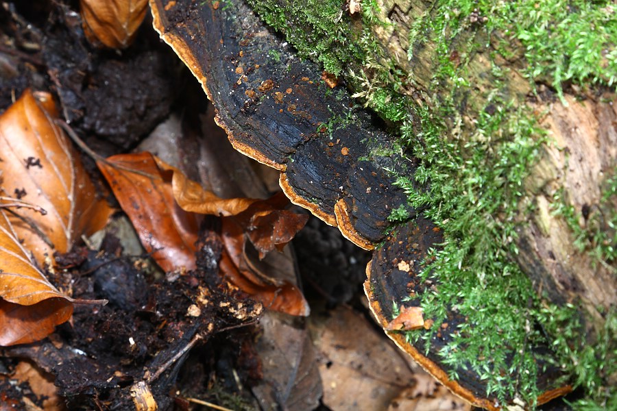 Heute jedoch habe ich diesen Pilz gefunden. Er wuchs an einem nichtdefinierbaren Baumstumpf (Buche, Eiche oder Kiefer). Die Breite der einzelnen Pilze war max. 4-5cm. Auffallender Unterschied zum Pilz gestern ist die glatte Unterseite. Das ganze Gebilde war höchstens 20cm hoch. Der rote Rand ist in der Vergrösserung auffallend striegelig. Weil die Borstenscheibe laut Bestimmungsbuch gerade mal 6cm in der Breite erreicht, bin ich nun nicht mehr sicher, ob mein Fund von gestern nicht vielleicht ein "Schwarzgebänderter Harzporling" (Ischnoderma benzoinum) ist (dann wäre die "Eiche" wahrscheinlich nicht ganz richtig...) und es sich beim heutigen Fund vielleicht eher um eine Borstenscheibe handelt oder ob es sich einmal um ältere und heute vielleicht um jüngere Exemplare handelt...
