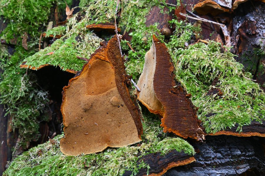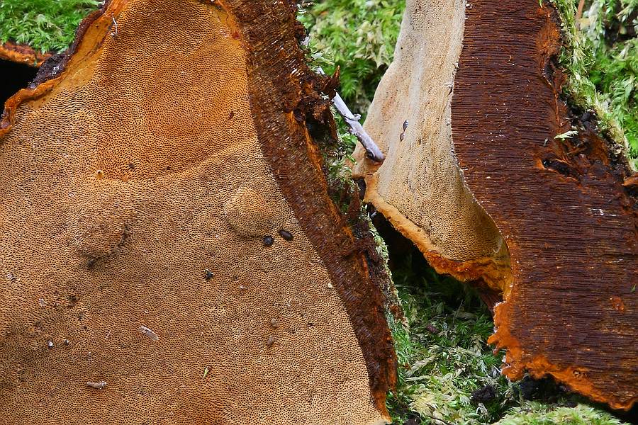 Ischnoderma (Harzporling) bildet recht große Fruchtkörper, also schon so groß wie die vom Rotrandigen Baumschwamm (F. pinicola).