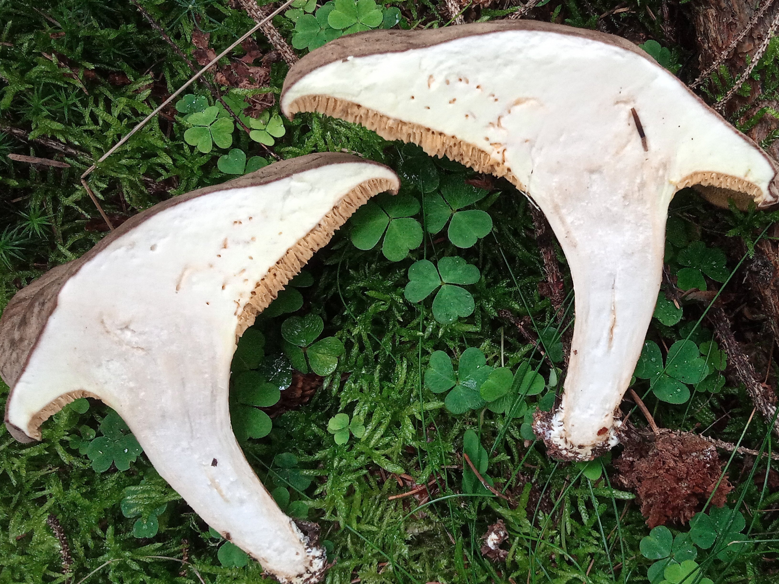 Im Schnittbild nur weißes Fleisch. Und natürlich leicht rötliche Madengänge. Mein Gedanke war ein alter Brauner Filzröhrling. Aber irgendwie paßt das auch nicht wirklich. Evtl. eine Mißbildung?
