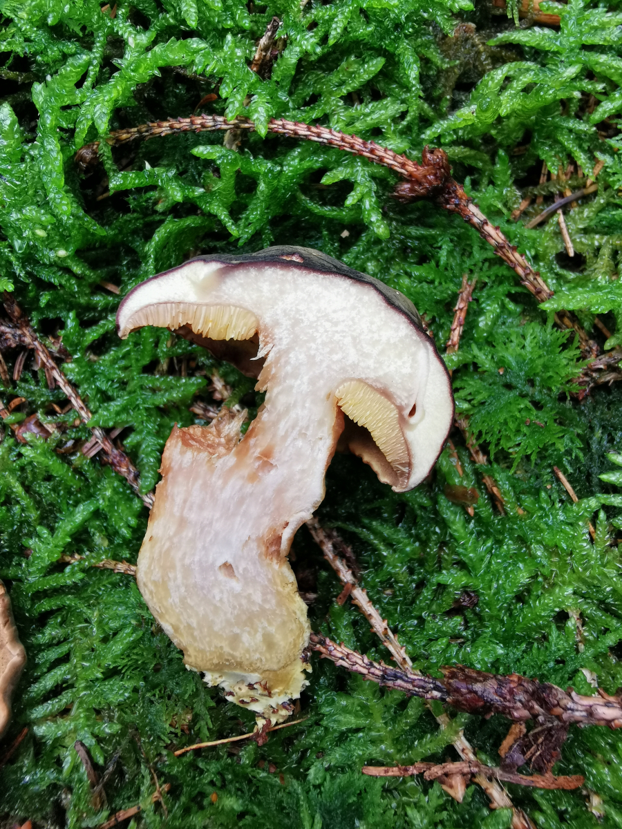 Diesen Filzröhrling (?) habe ich heute im Fichtenwald entdeckt. Einen Röhrling solcher Farbe hatte ich noch nie in der Hand. Der war ganz stark trocken/ filzig in einem samtigen dunkelmoosgrün. Ich hoffe die Farbe kommt einigermaßen rüber. Geruch fand ich unspektakulär pilzig. Habt ihr einen Tipp für mich welche Arten da infrage kommen?