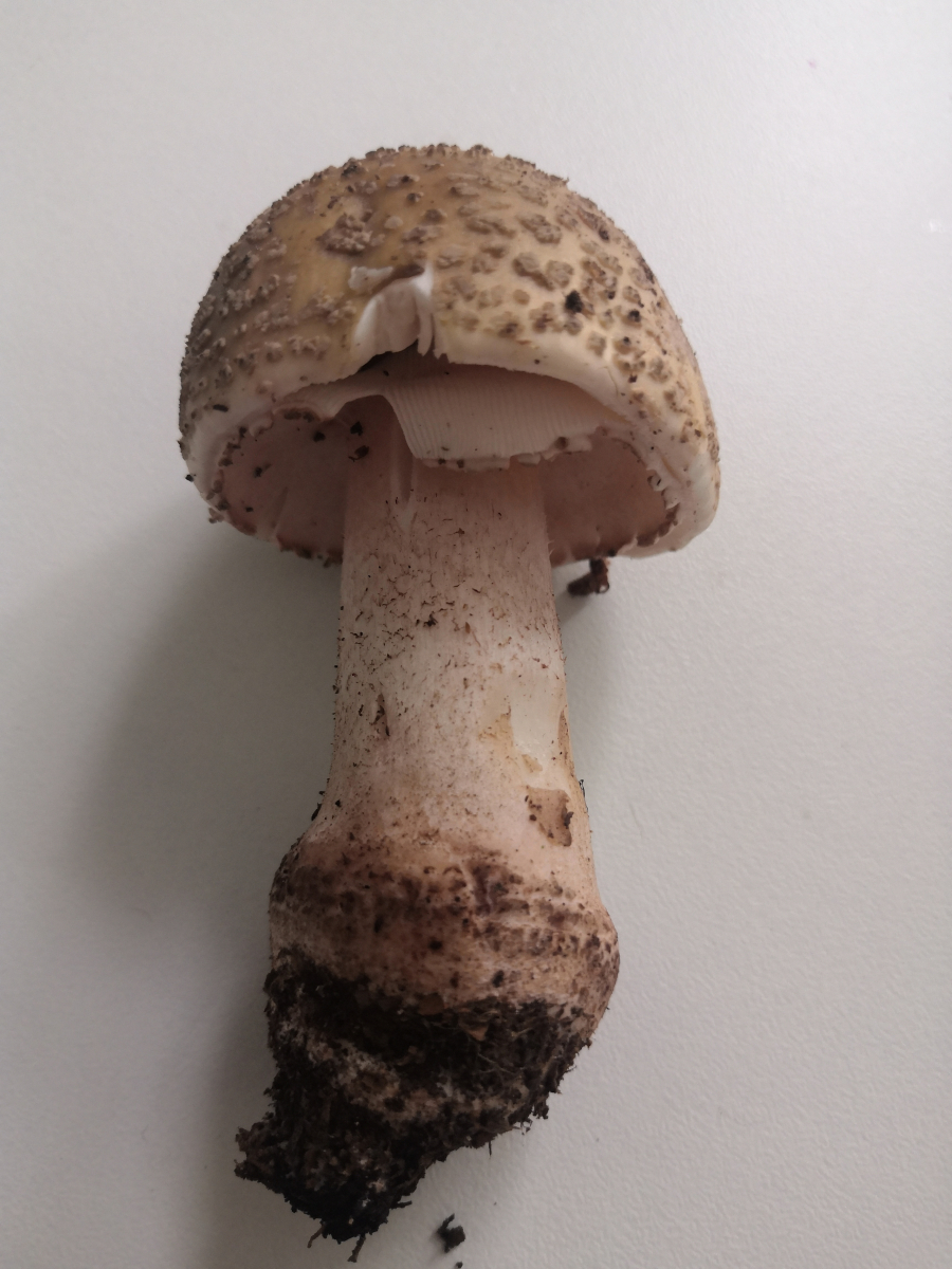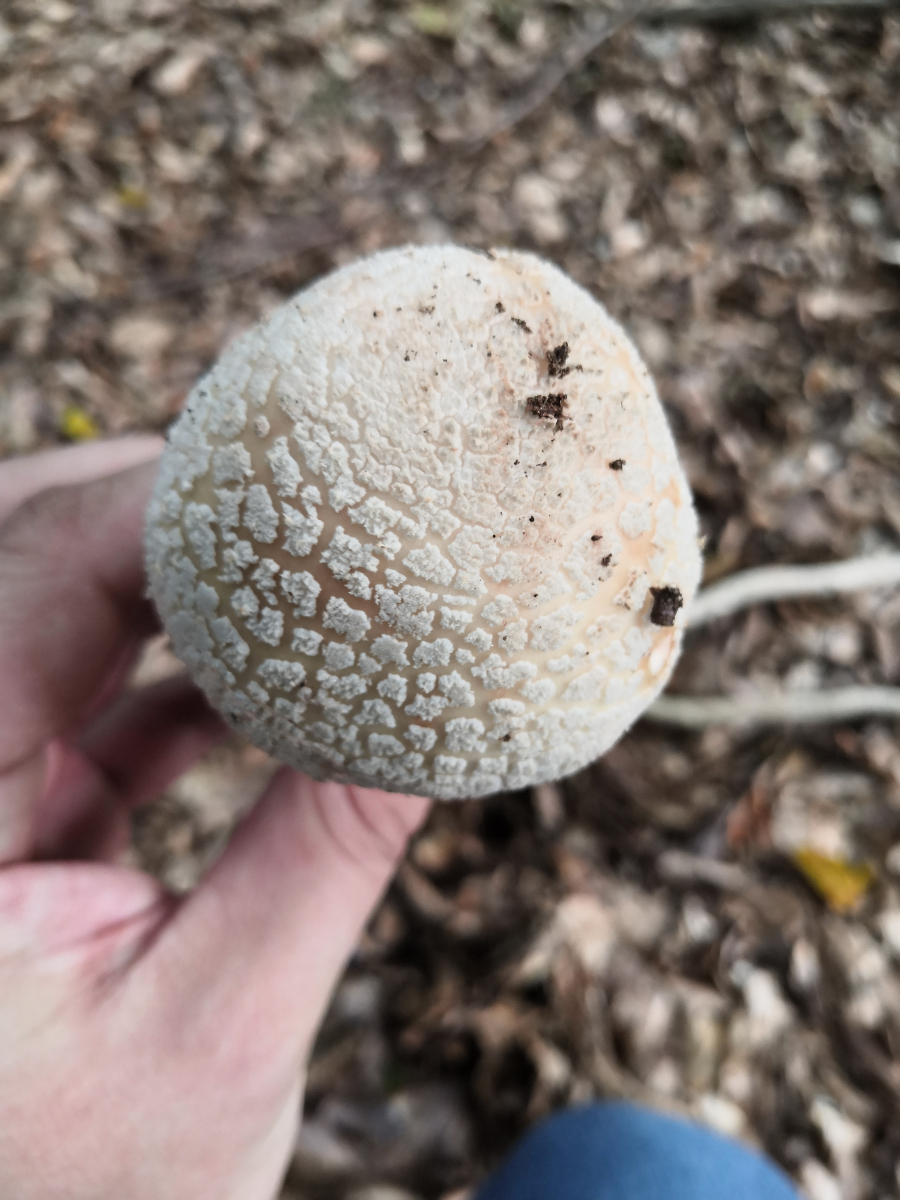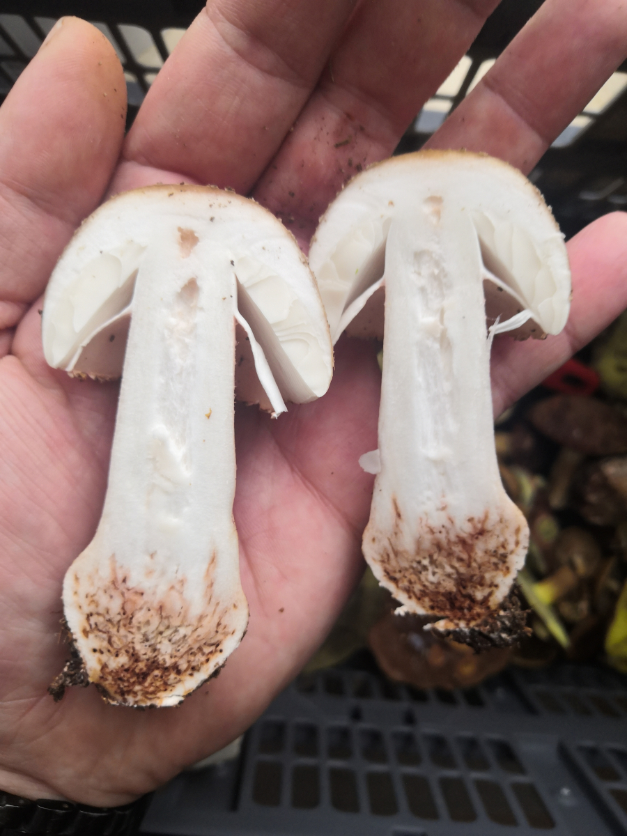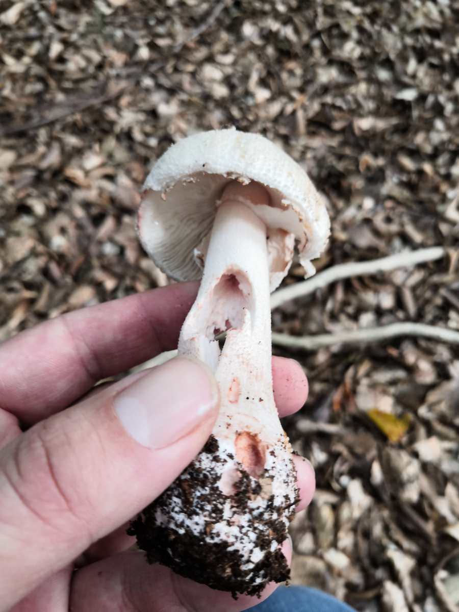 Ich habe den Pilz etwas angekratzt. Am Stiel und am Hut. Auch nach 30 Minuten zeigte sich keine Rötung. Ich bin immer davon ausgegangen das Perlpilze röten müssen oder ist das nicht so? Dieser Kandidat hier hat maximal eine ganz leichte rosane Färbung.