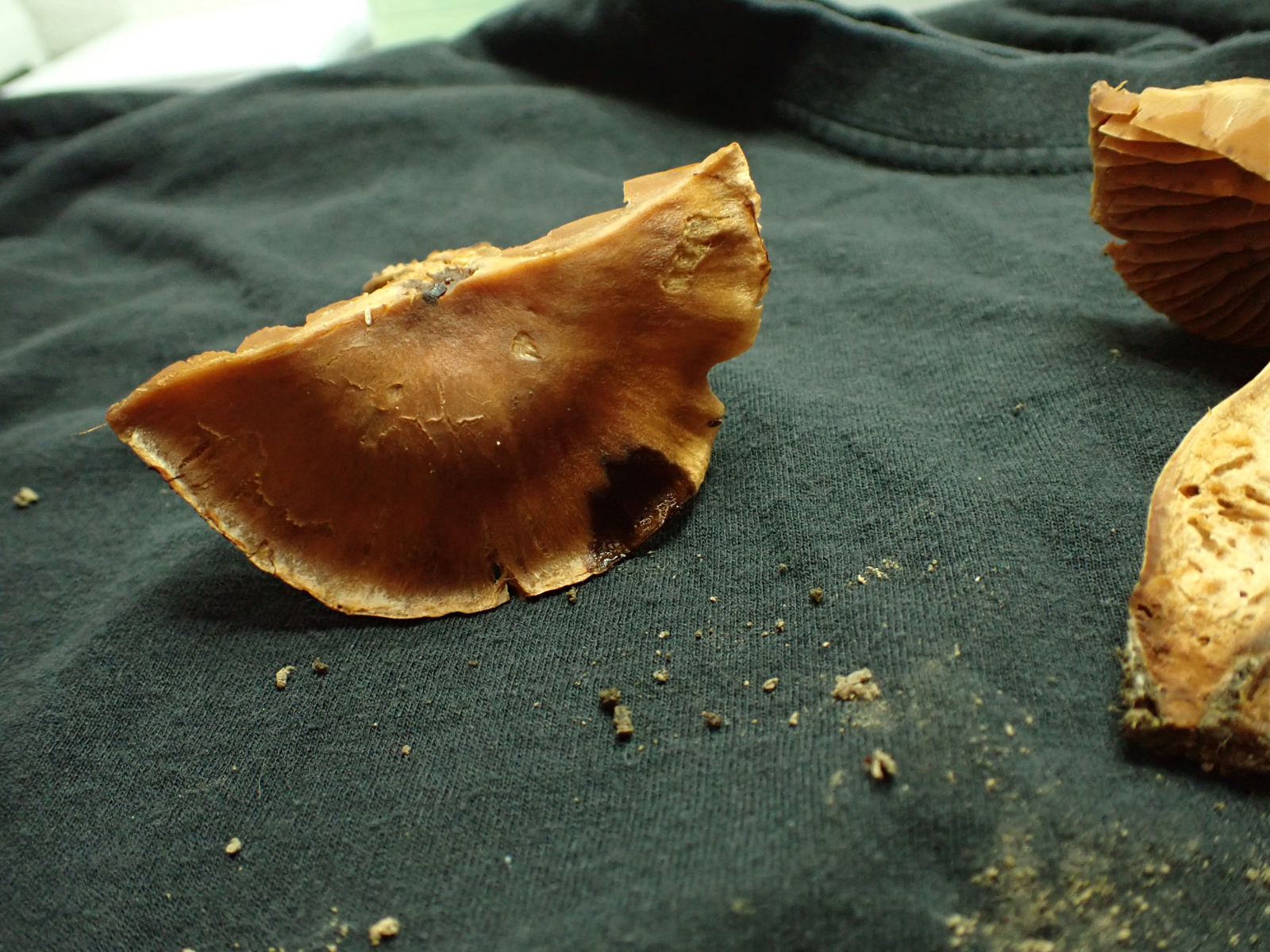 Auch die sind nicht Schleimig. Der Hut ist Hygrophan, das Fleisch reagiert auf KOH dunkelbraun bis schwarz, Geruch unaufällig.