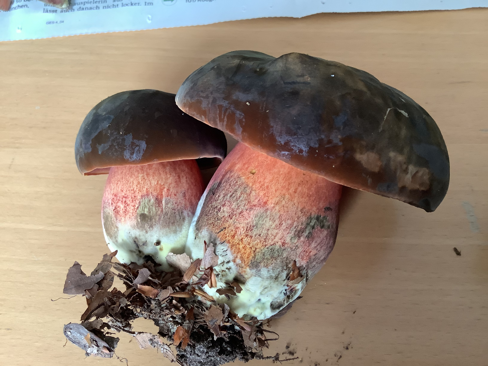 Der Pilz ist relativ dunkelbraun mit rötlich braunem Fuß