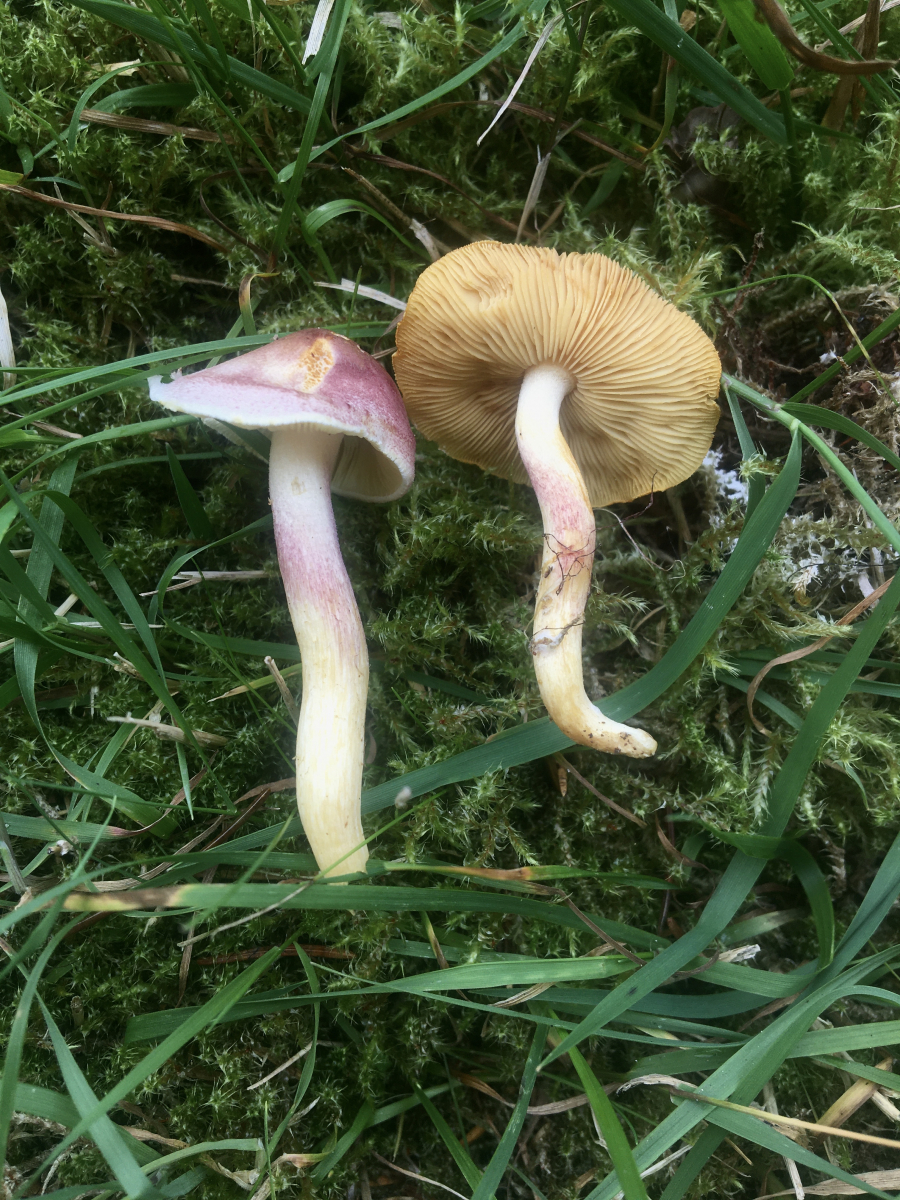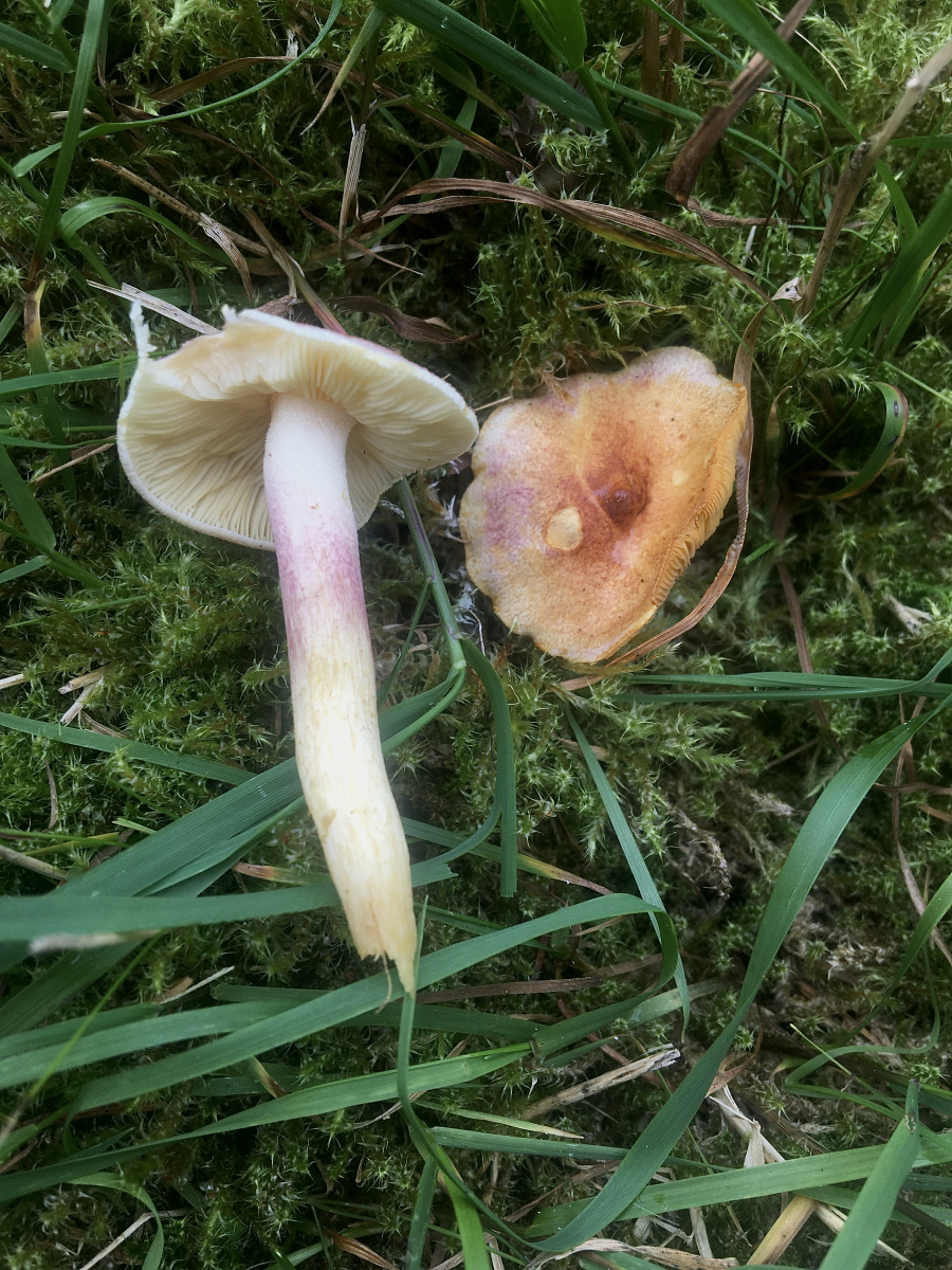 heute hab ich auf einer relativ mageren Wiese neben einem Fichtenwald diesen Pilz gefunden, der mich von oben betrachtet an einen sehr schmächtigen Tricholomopsis rutilans erinnert hat, bei näherer Betrachtung sah ich die gelb verfärbten Stellen, was mich an Hygrophorus erubescens denken ließ, doch als ich den älteren entnahm, sah ich die gelben bzw. gelbockerigen, recht dicht stehenden Lamellen. Jetzt hab ich keine Idee mehr und bitte um eure Hilfe. Bin schon gespannt, was euch dazu einfällt!